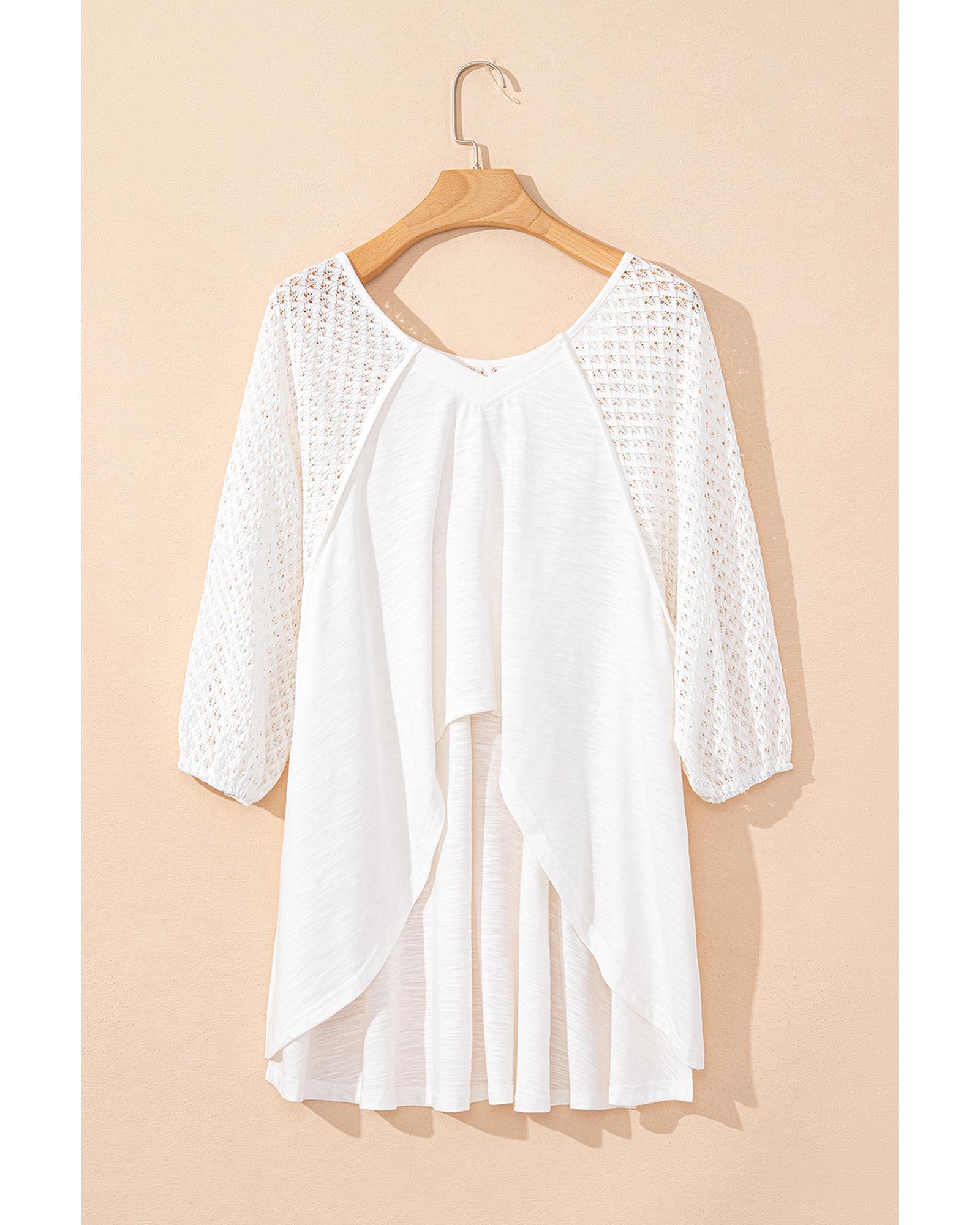 This oversized top features a stylish eyelet patchwork design with a high-low hemline and a V-neck cut. Its relaxed fit and 3/4 length sleeves make it suitable for various occasions, combining comfort with a fashionable look.