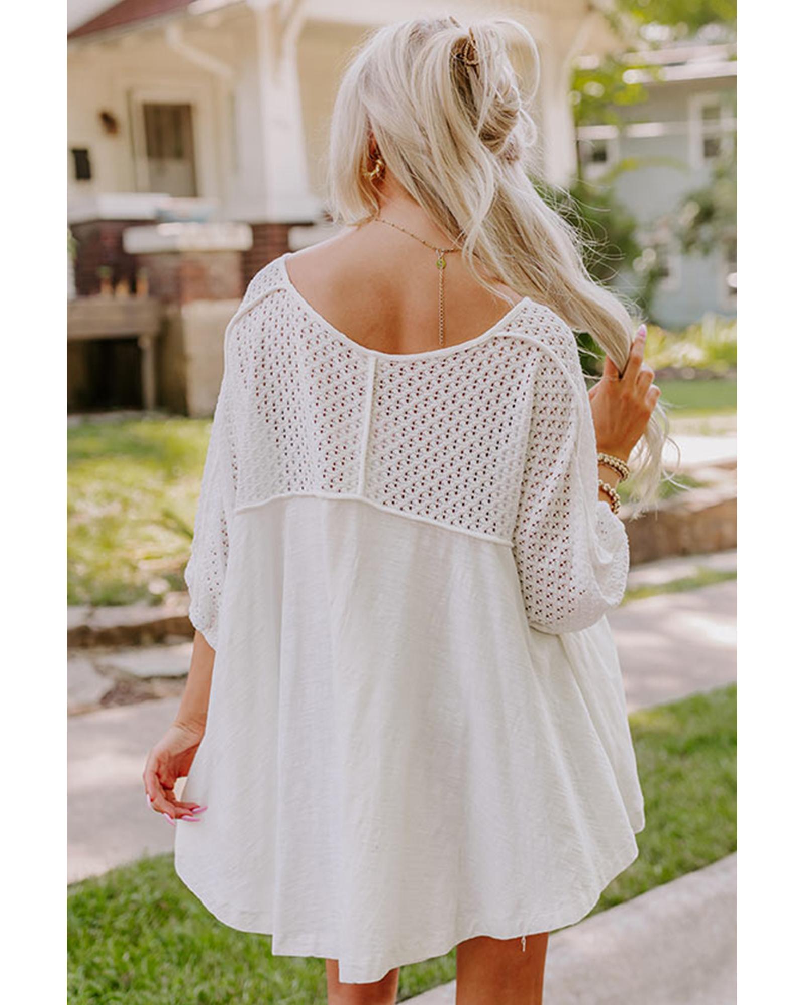 White Eyelet Patchwork High Low Hem V Neck Oversized Top – S