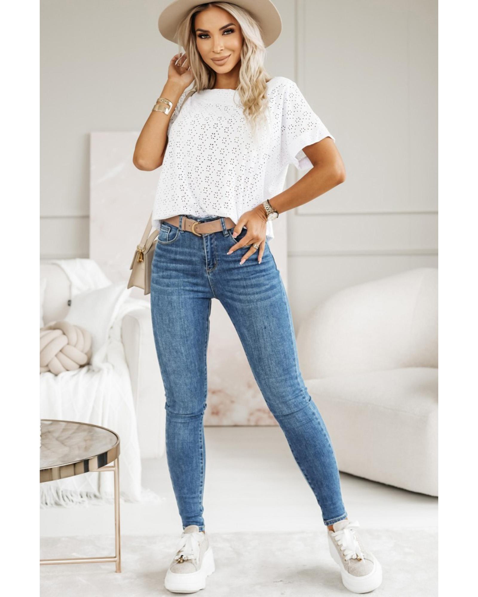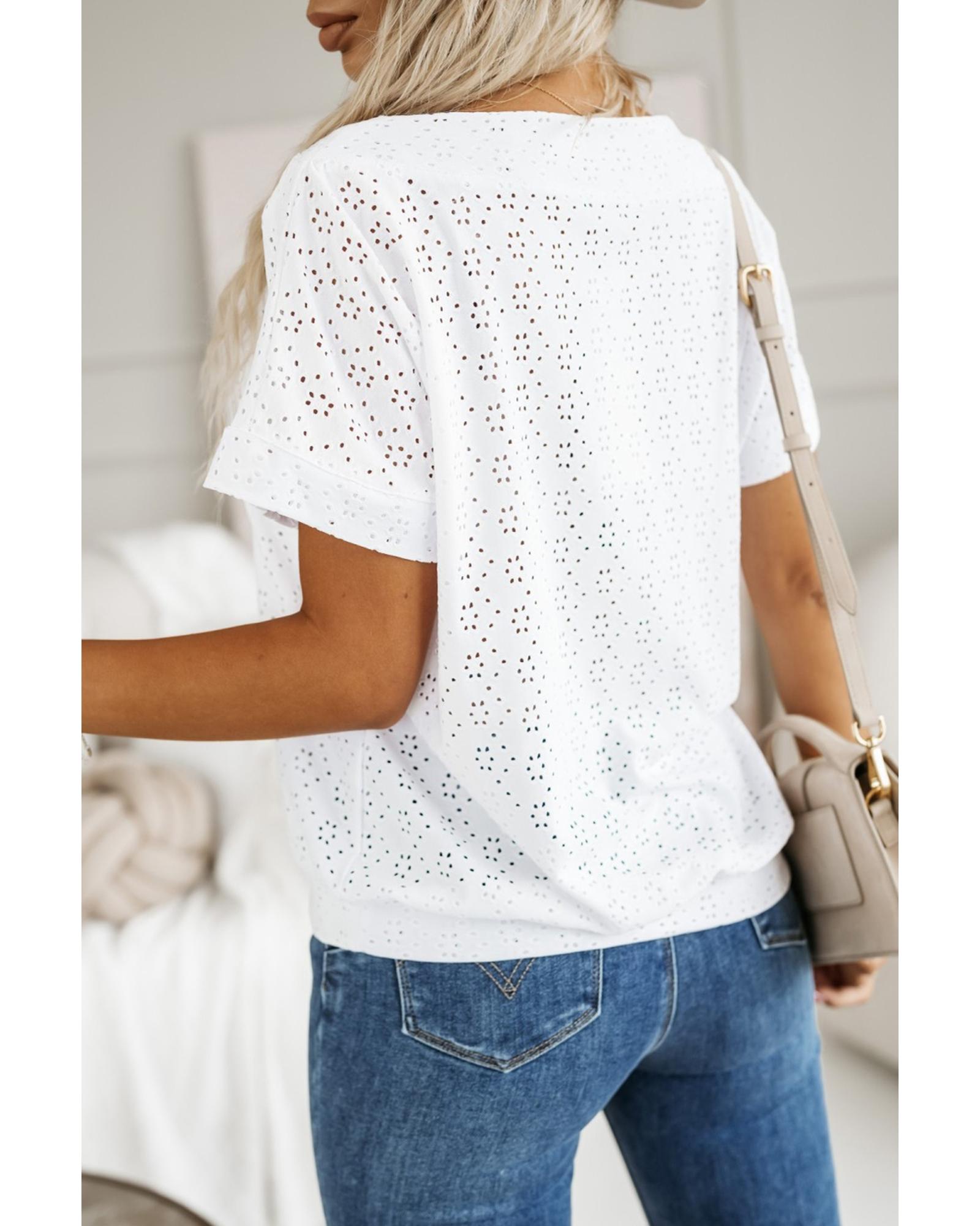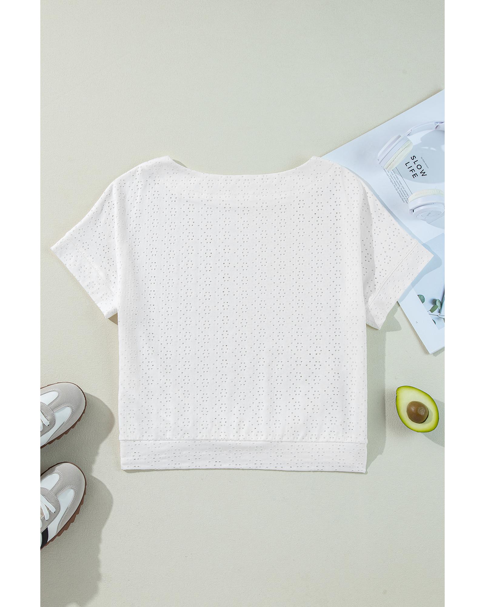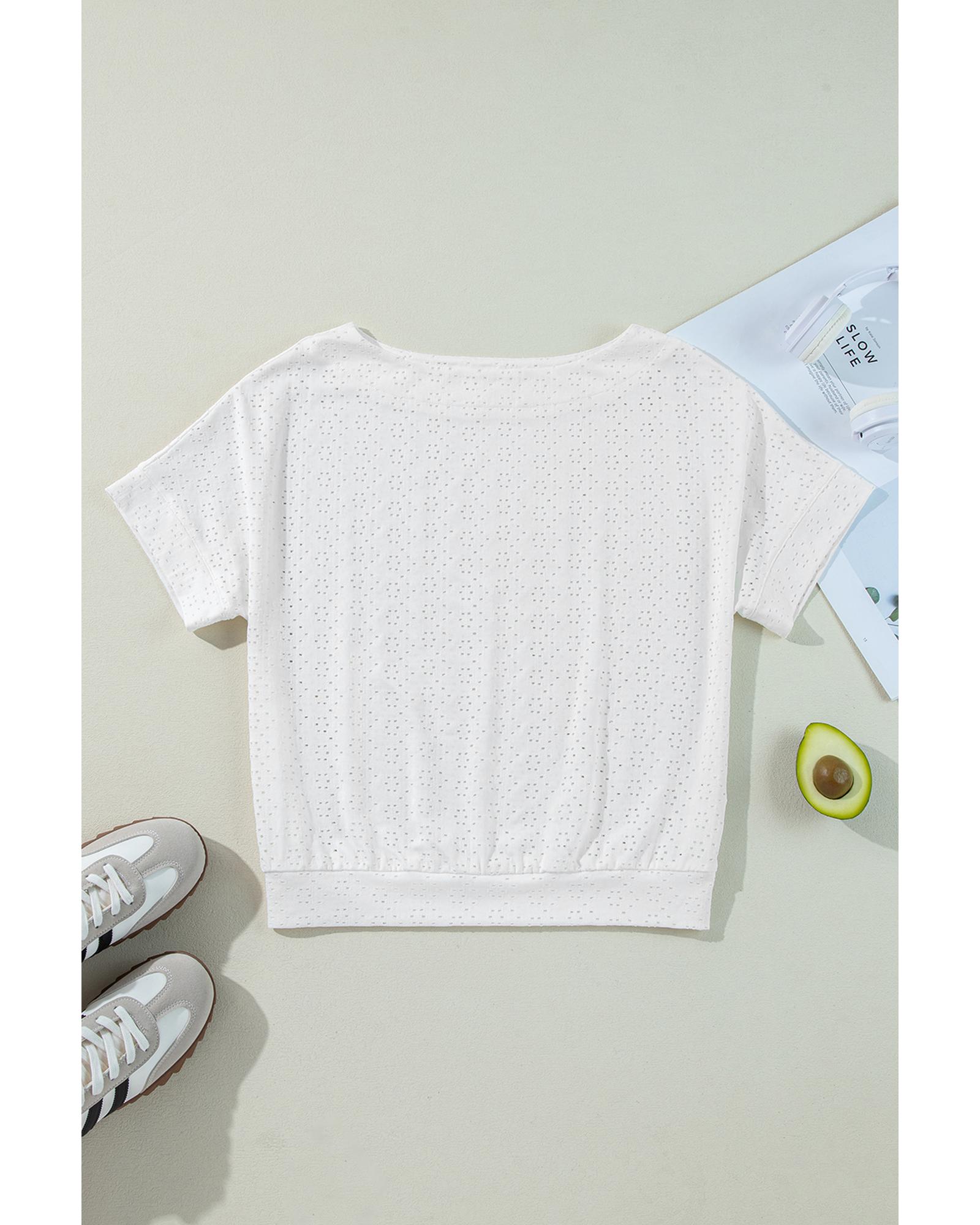 White Eyelet Pattern Boat Neck Casual Tee – XL