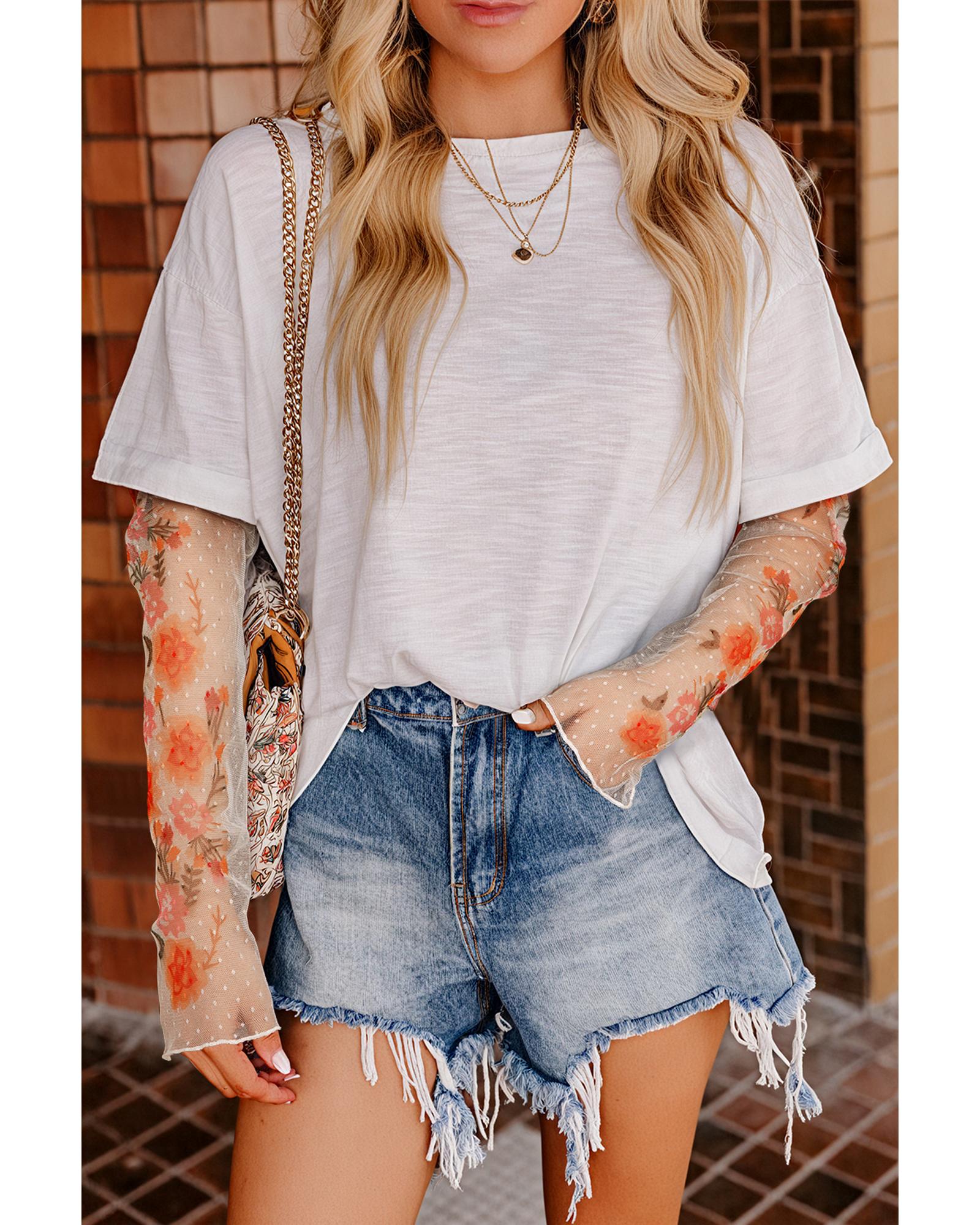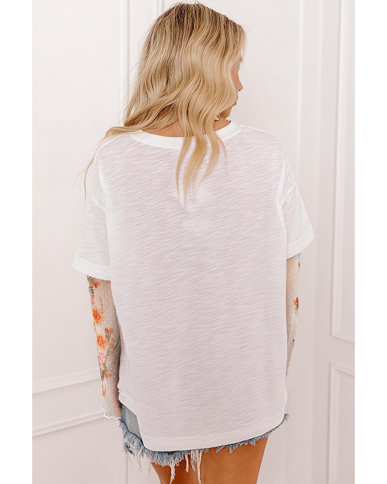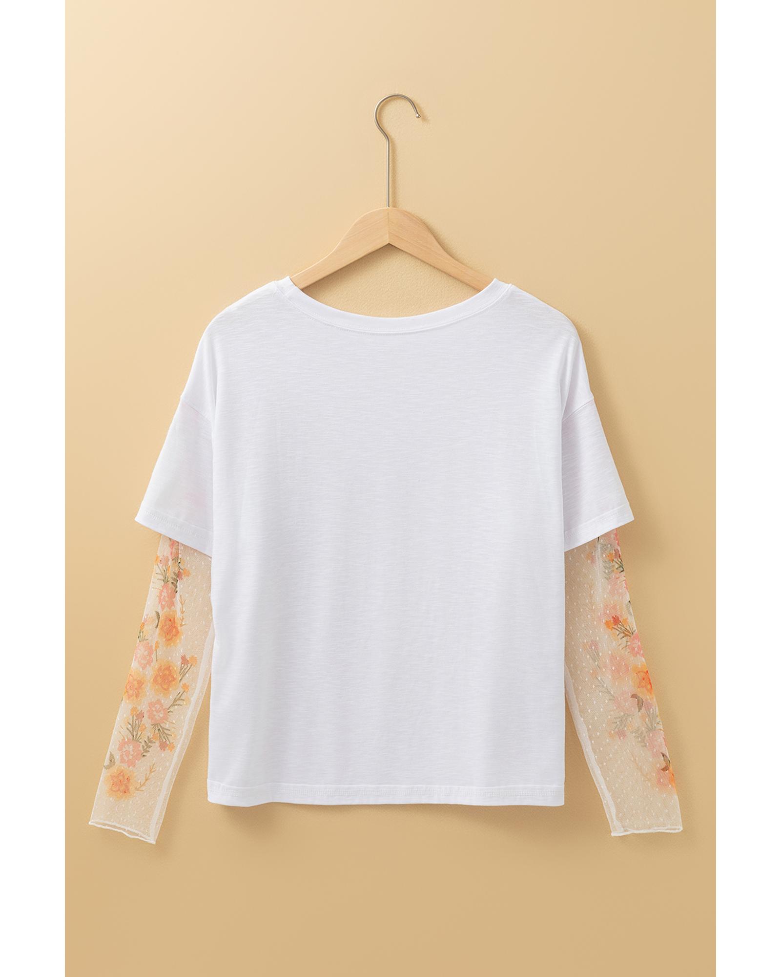 This floral long sleeve patchwork tee features a faux two-piece design with a relaxed fit, making it ideal for casual wear. The shirt combines floral mesh long sleeves with a loose silhouette, offering both style and comfort. Its versatile design pairs well with jeans or casual pants, suitable for everyday occasions.