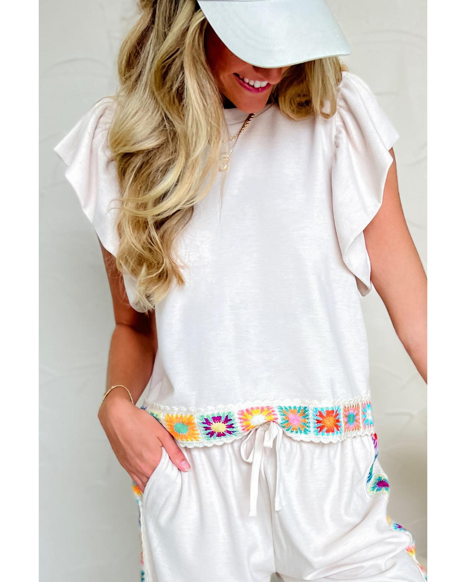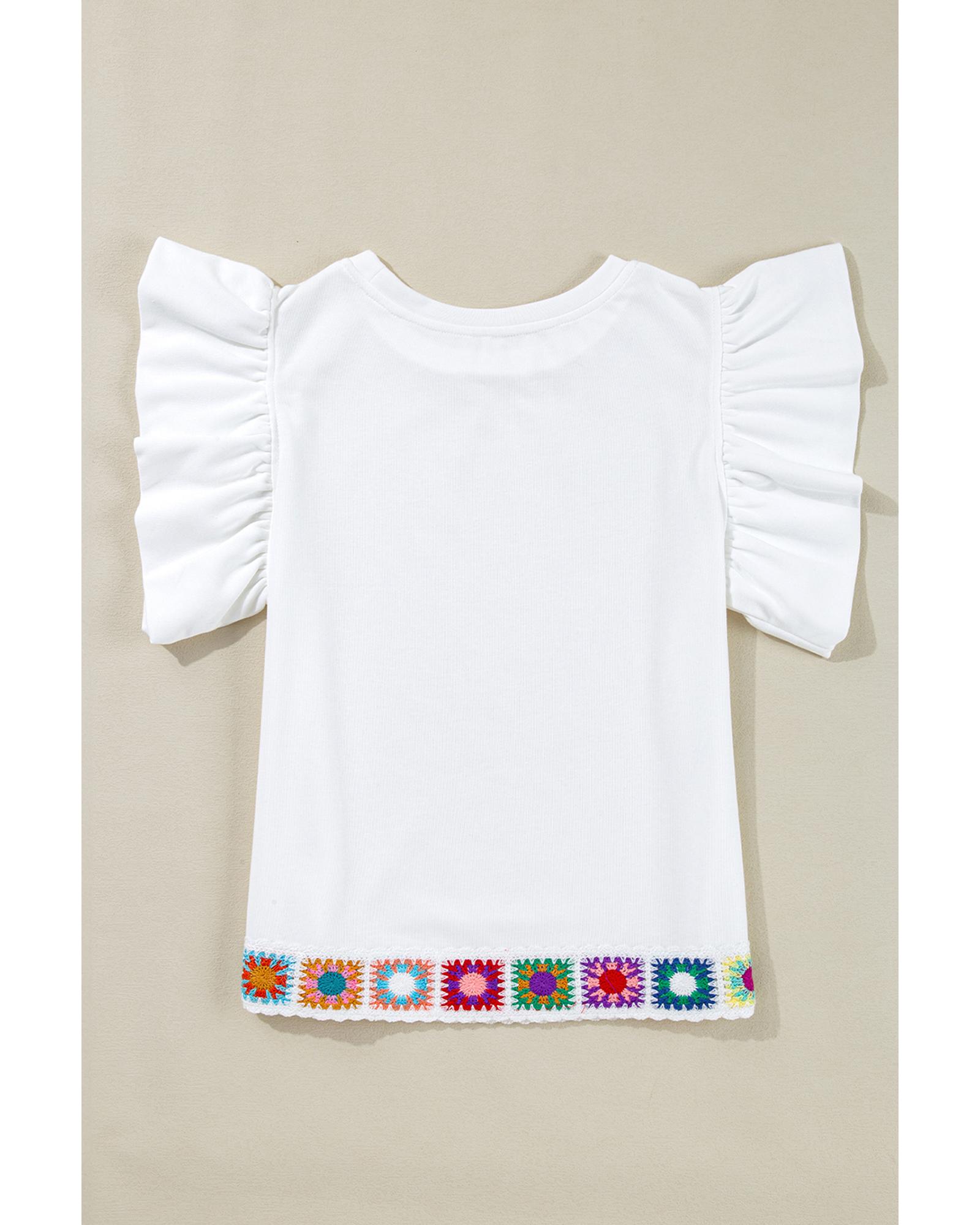 White Floral Crochet Patched Ruffled Sleeve Crewneck Blouse – L