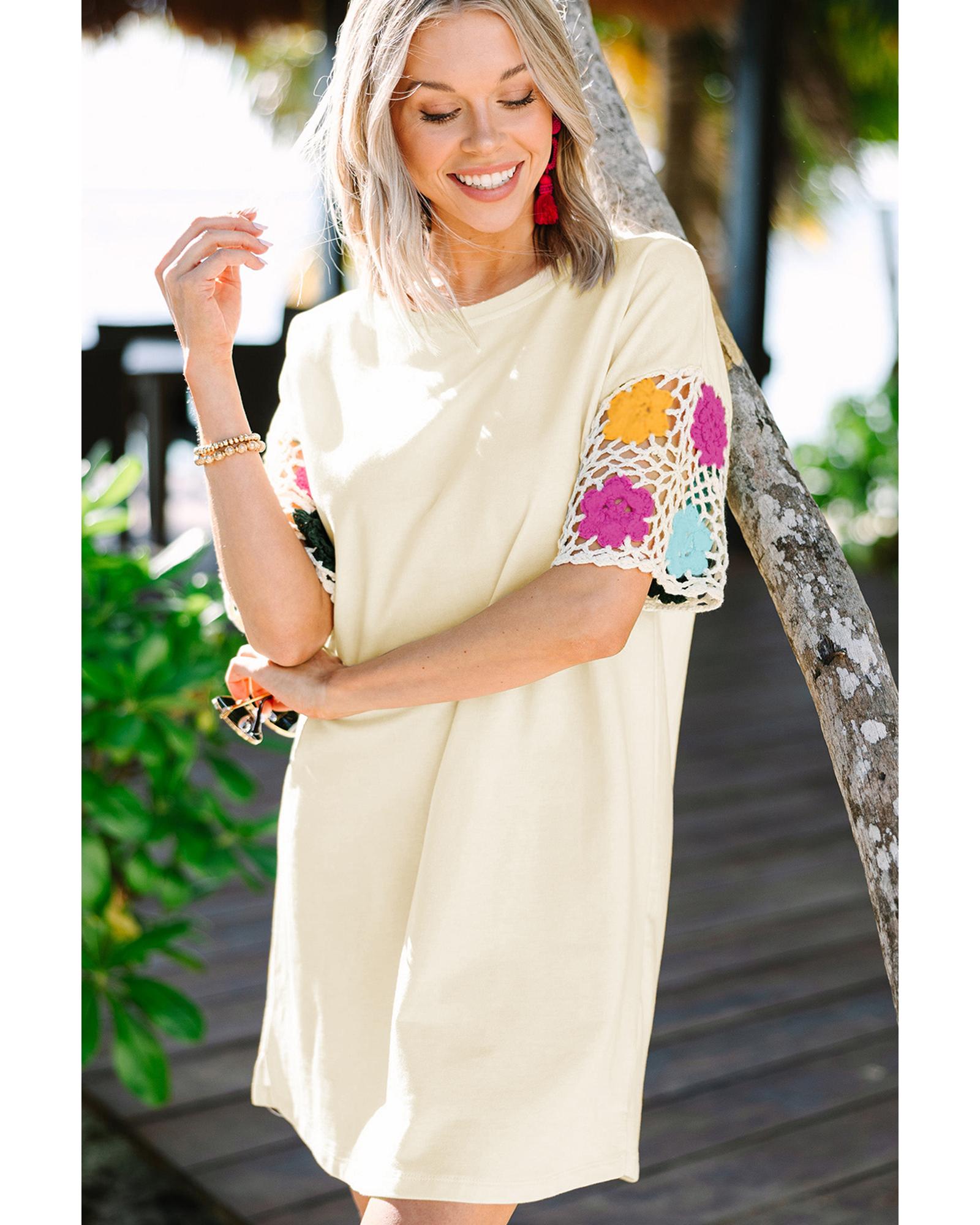 - 1 x White Floral Crochet Splicing Sleeve T-Shirt Dress