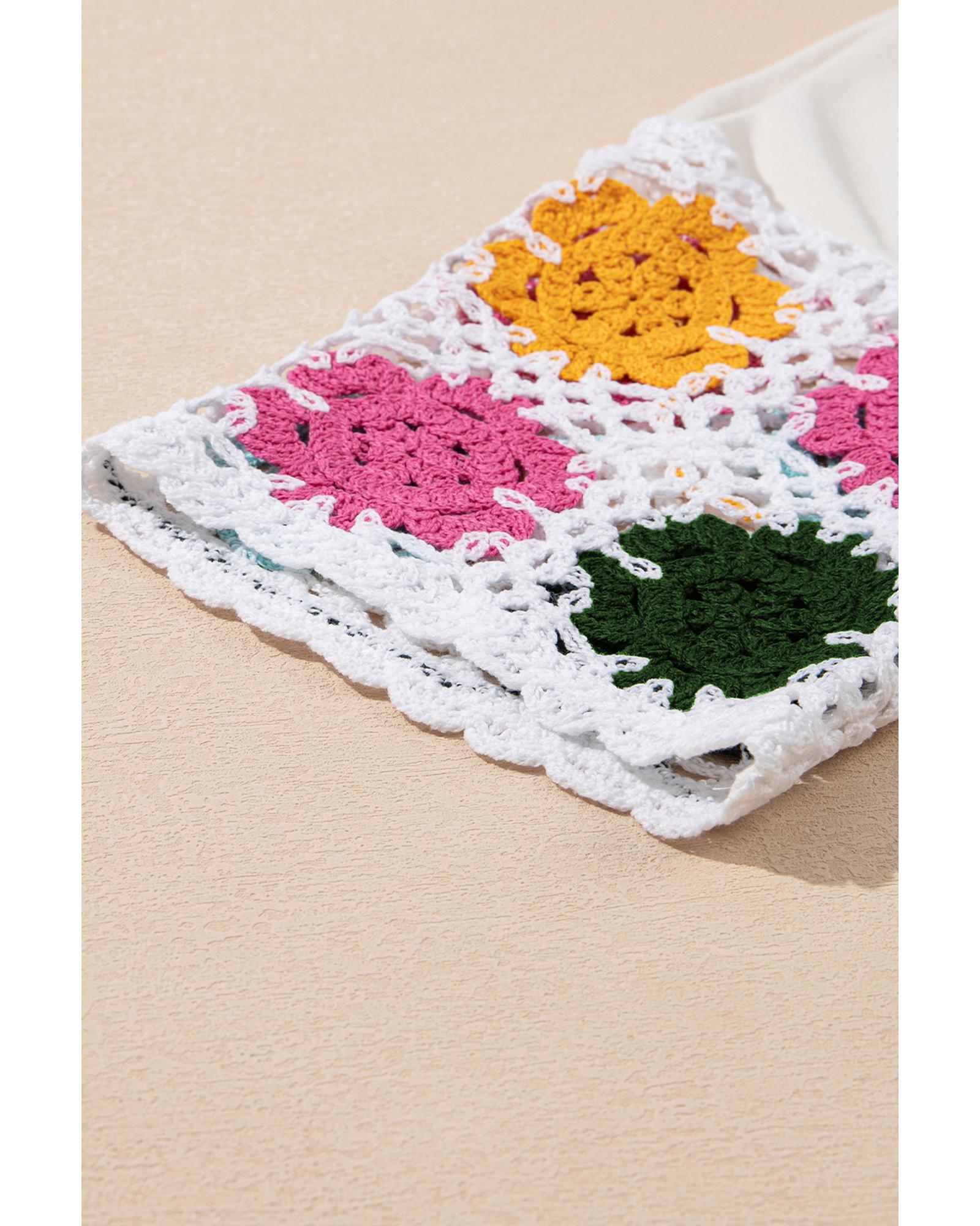 This white floral crochet splicing sleeve T-shirt dress combines a trendy fitted silhouette with a bohemian and romantic aesthetic. Its tunic design offers comfort and freedom of movement, making it suitable for various occasions and body types. The short sleeves provide a versatile option for warmer weather, while the floral crochet splicing adds a stylish touch.