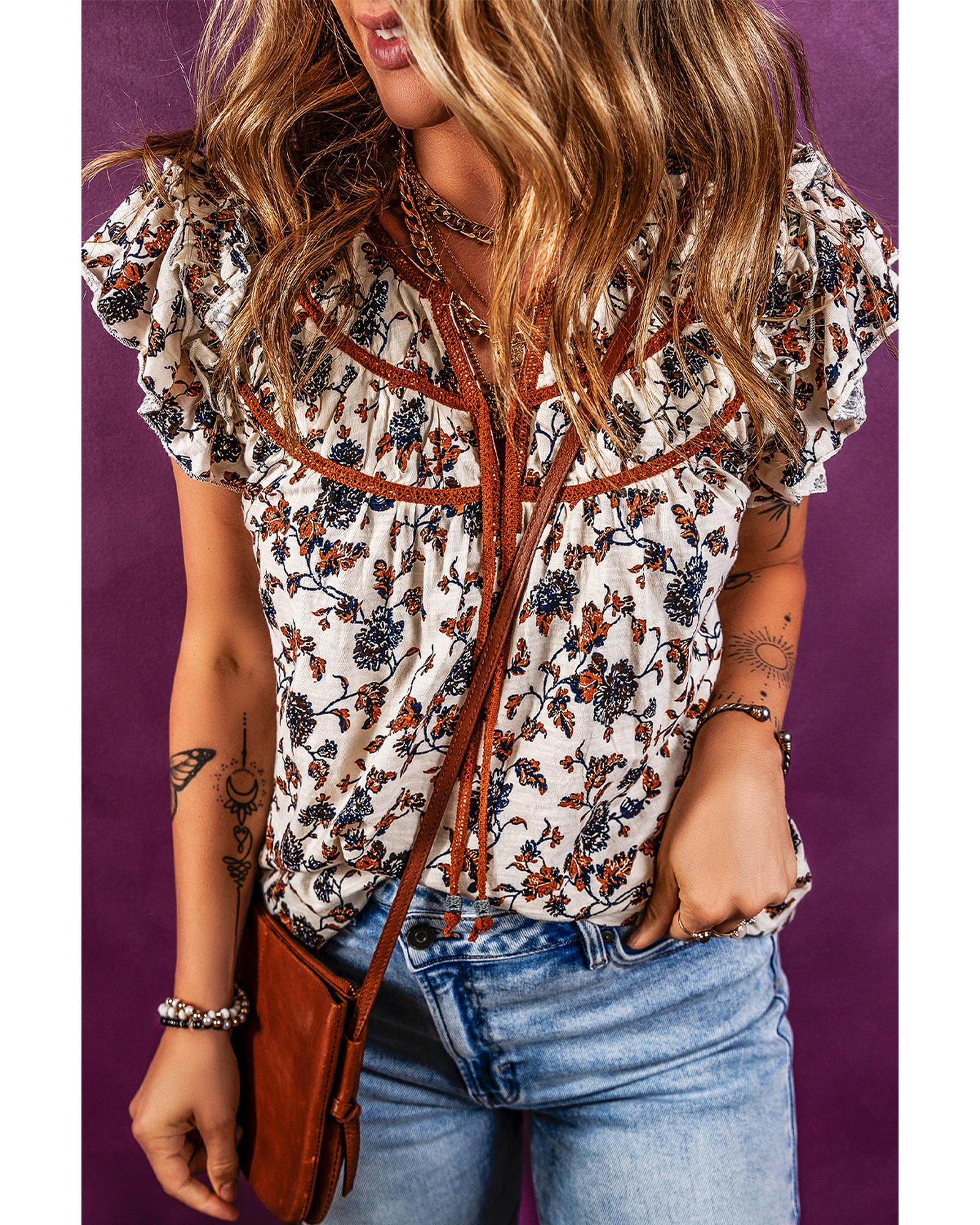 This white floral frilly blouse features a delicate lace-up neckline and feminine ruffles, combining a romantic floral pattern with trendy design elements. Made from soft, breathable fabric, it offers all-day comfort with a stylish appearance suitable for various occasions.