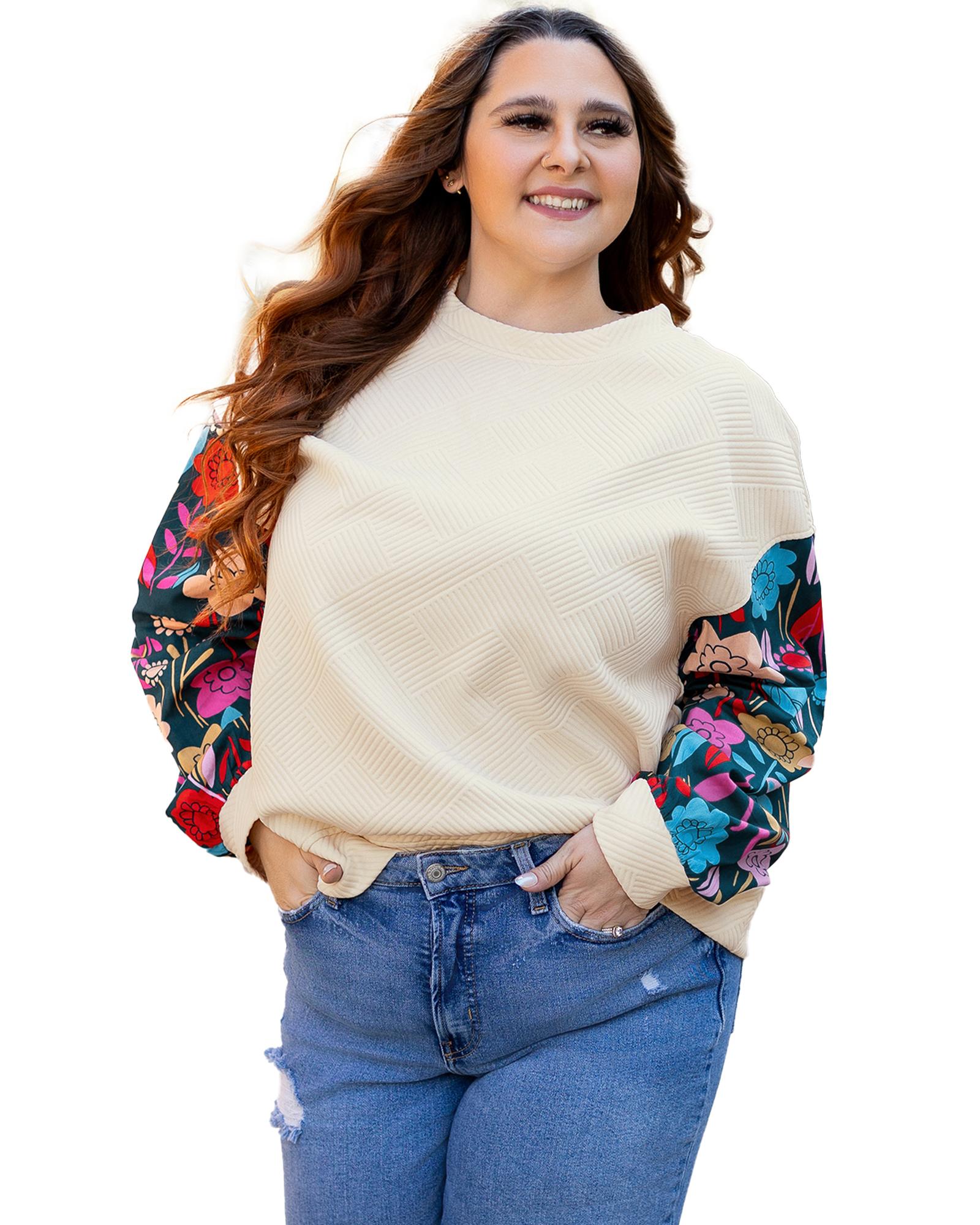 White Floral Patchwork Sleeve Textured Plus Size Pullover Top - 3X