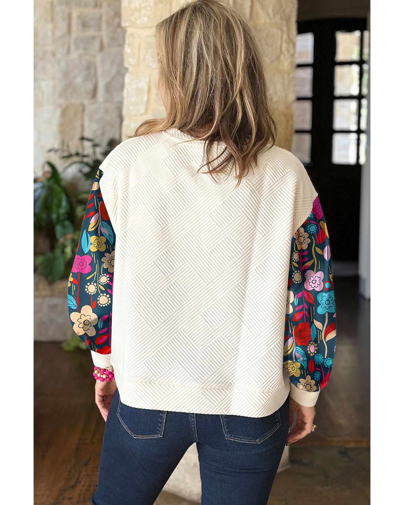 White Floral Patchwork Sleeve Textured Plus Size Pullover Top - 4X