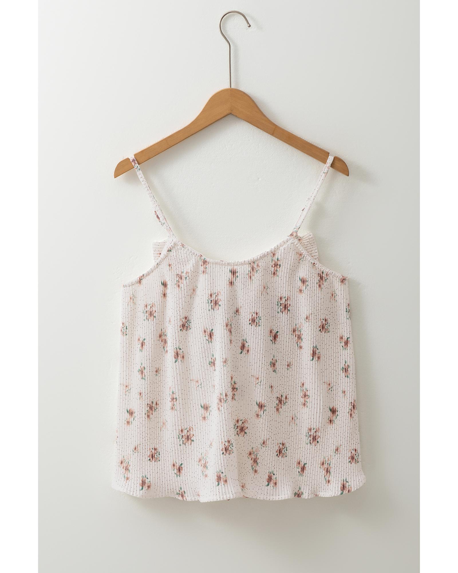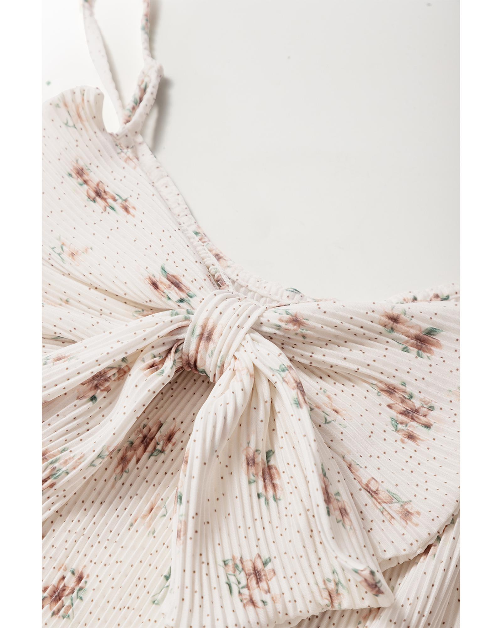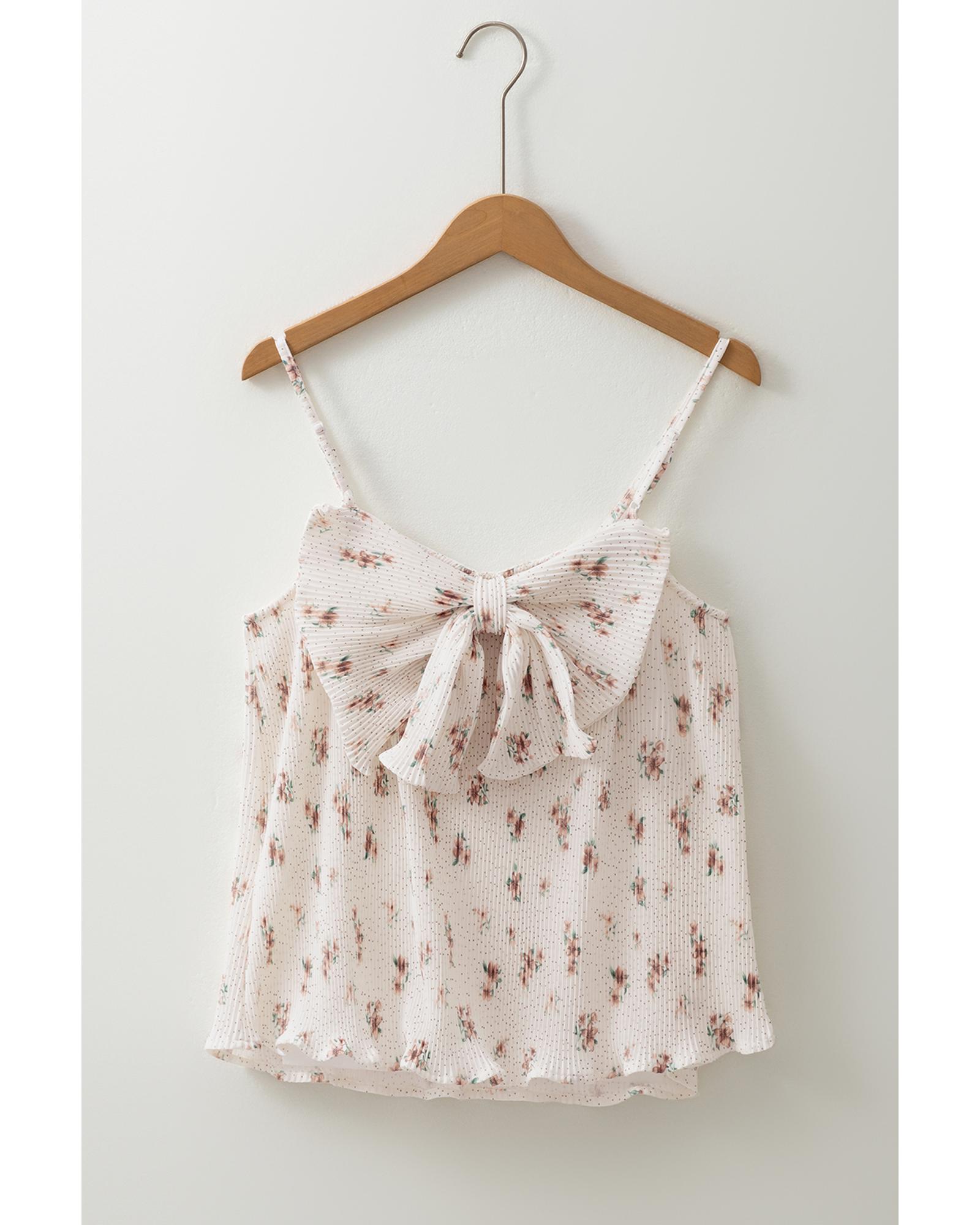 This floral pleated tank top features a charming design with a large bow at the back and adjustable spaghetti straps for a personalized fit. Made from lightweight and breathable polyester, it offers both style and comfort for everyday wear.