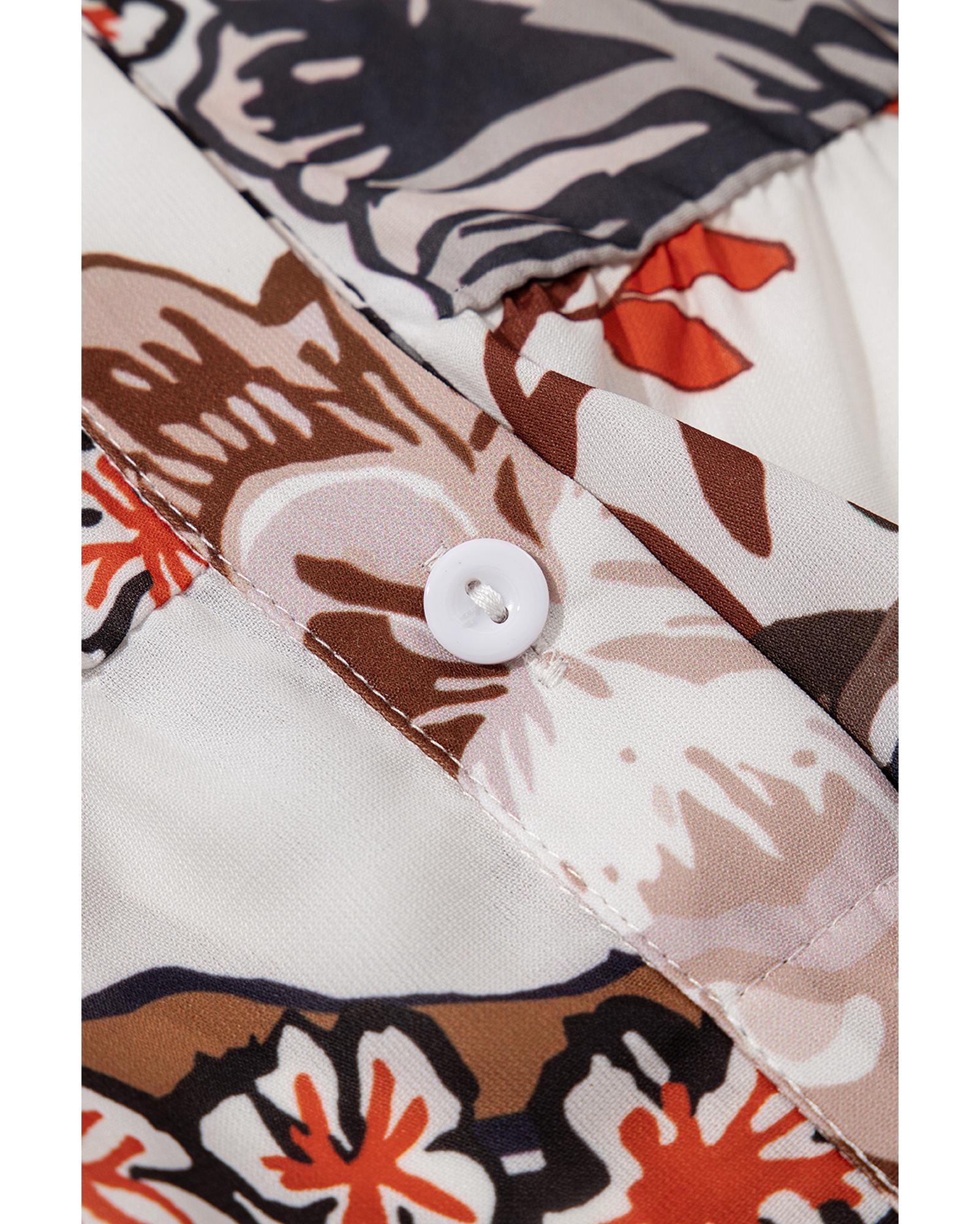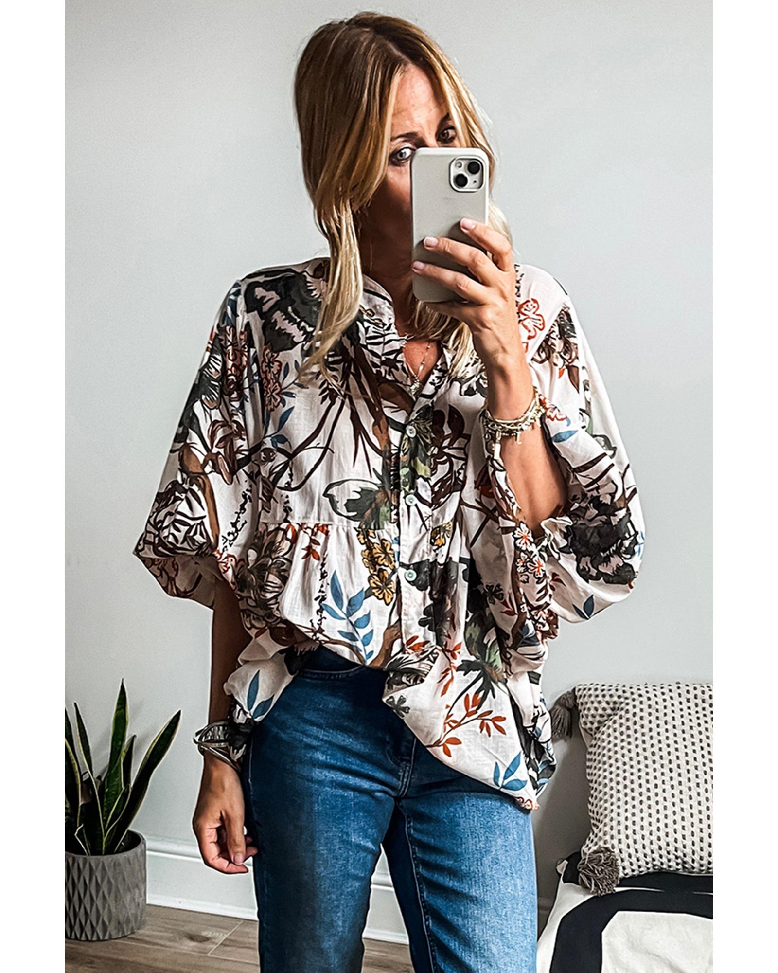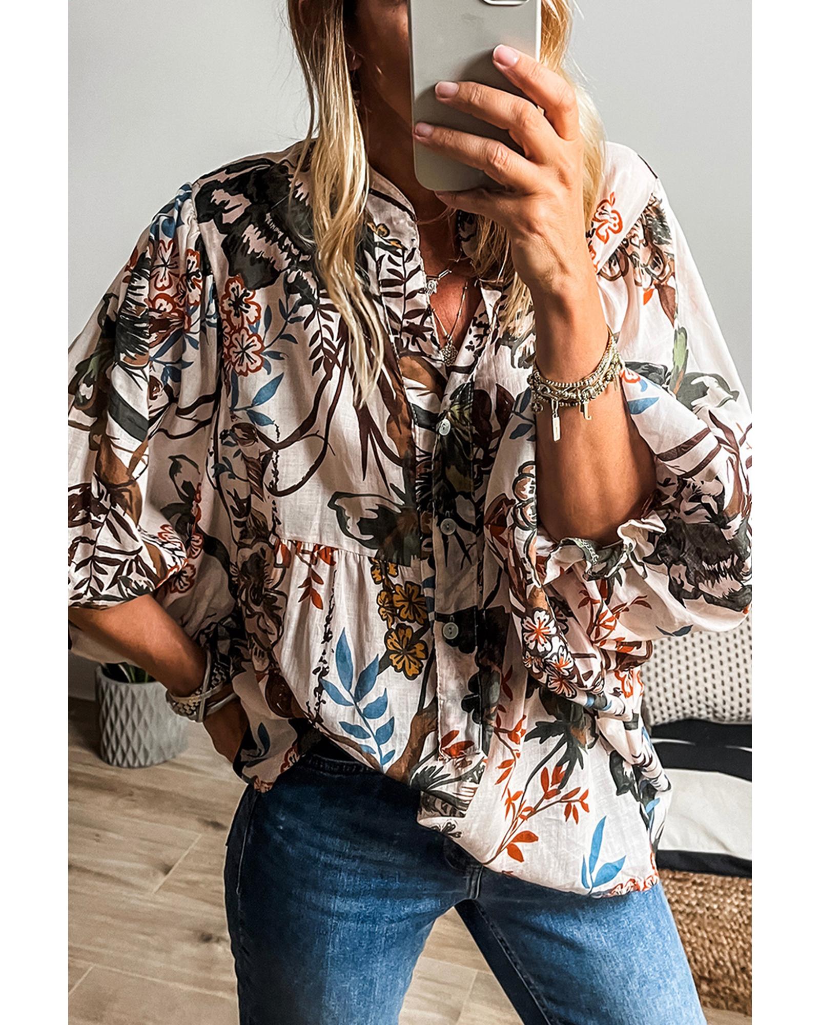 This casual shirt features a white floral print and balloon sleeves, offering a relaxed and stylish look suitable for everyday wear. Its loose fit provides comfort and ease of movement, making it a versatile addition to any wardrobe.