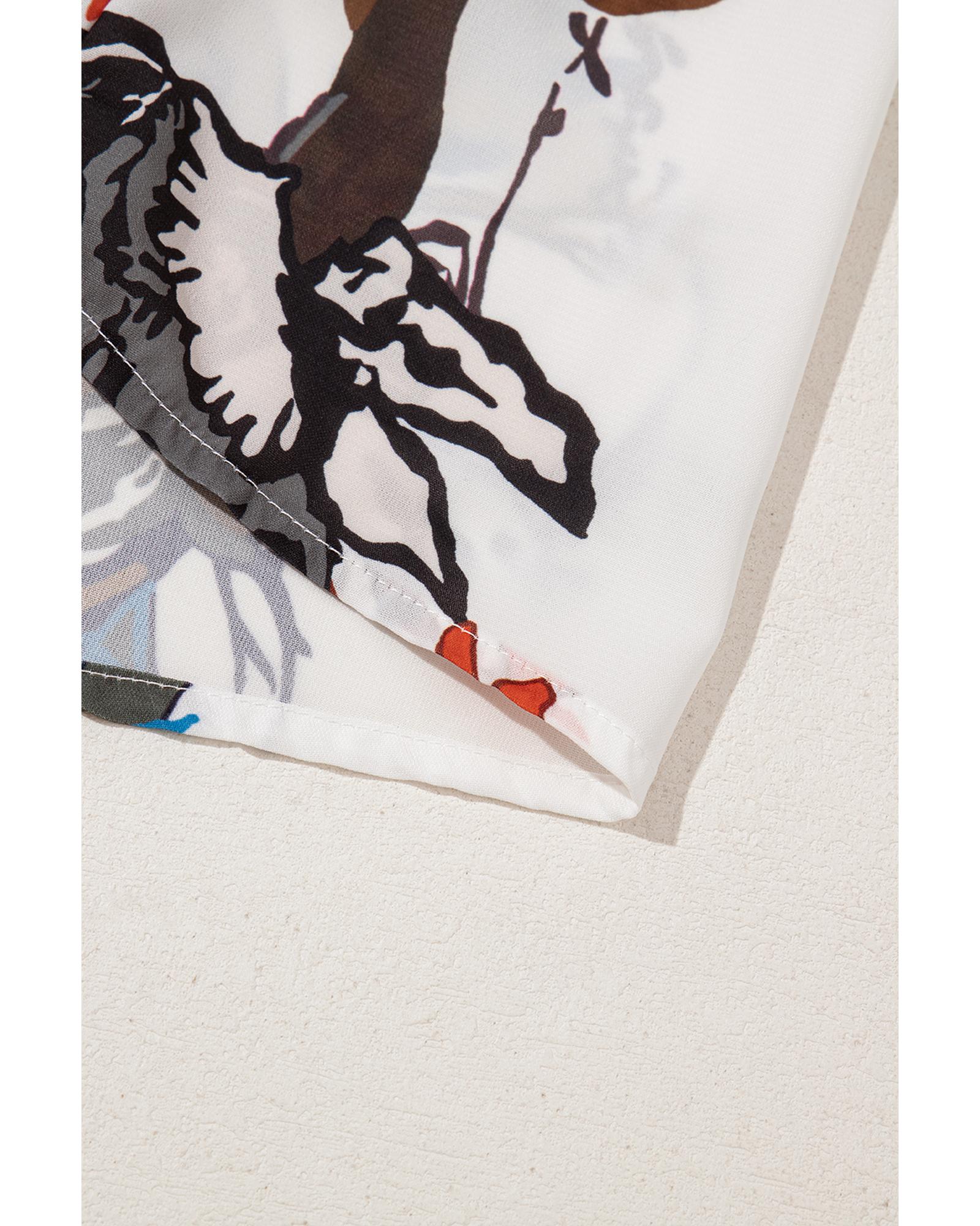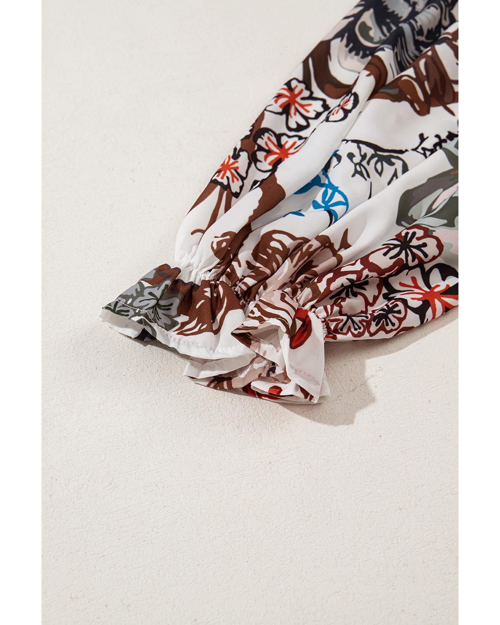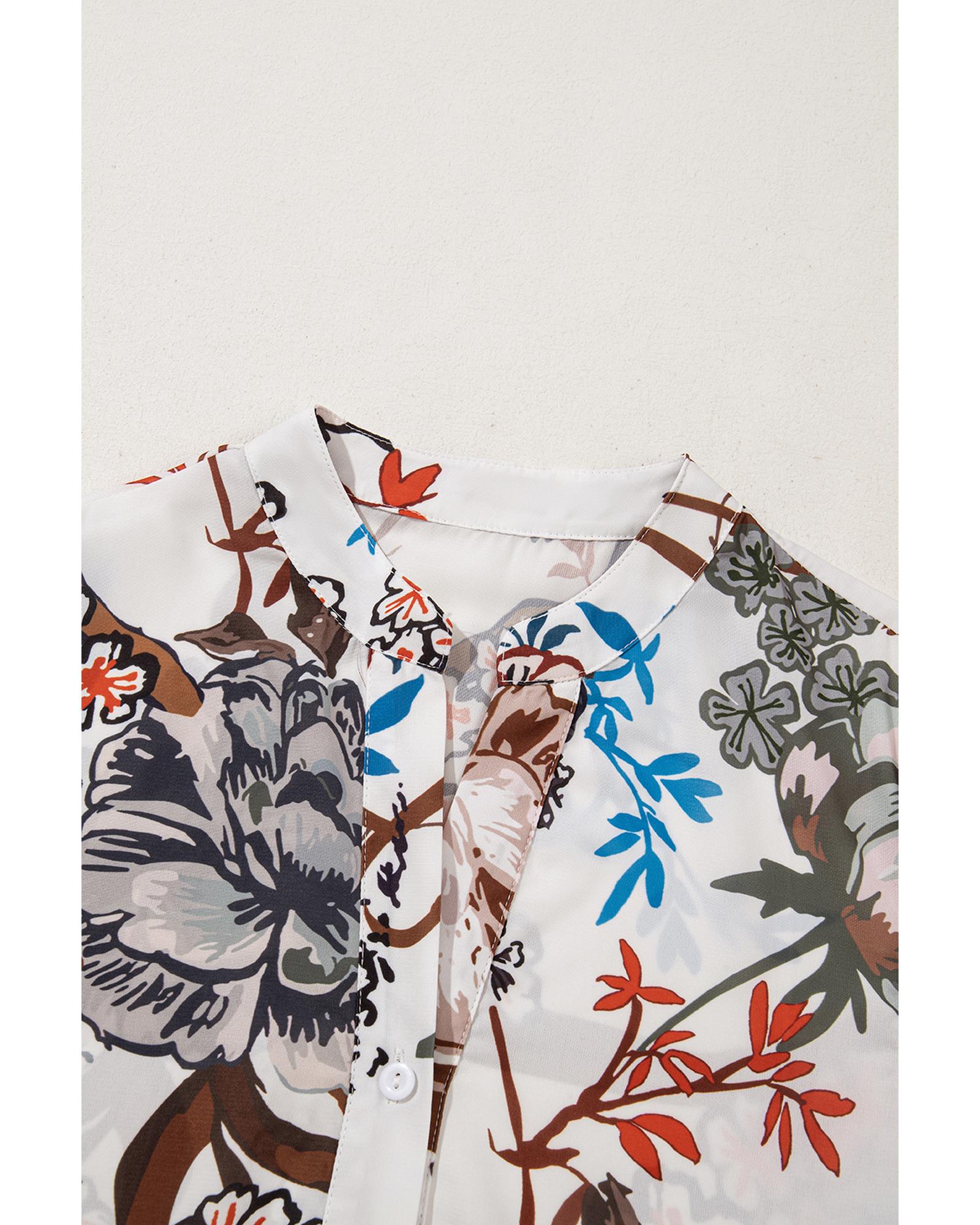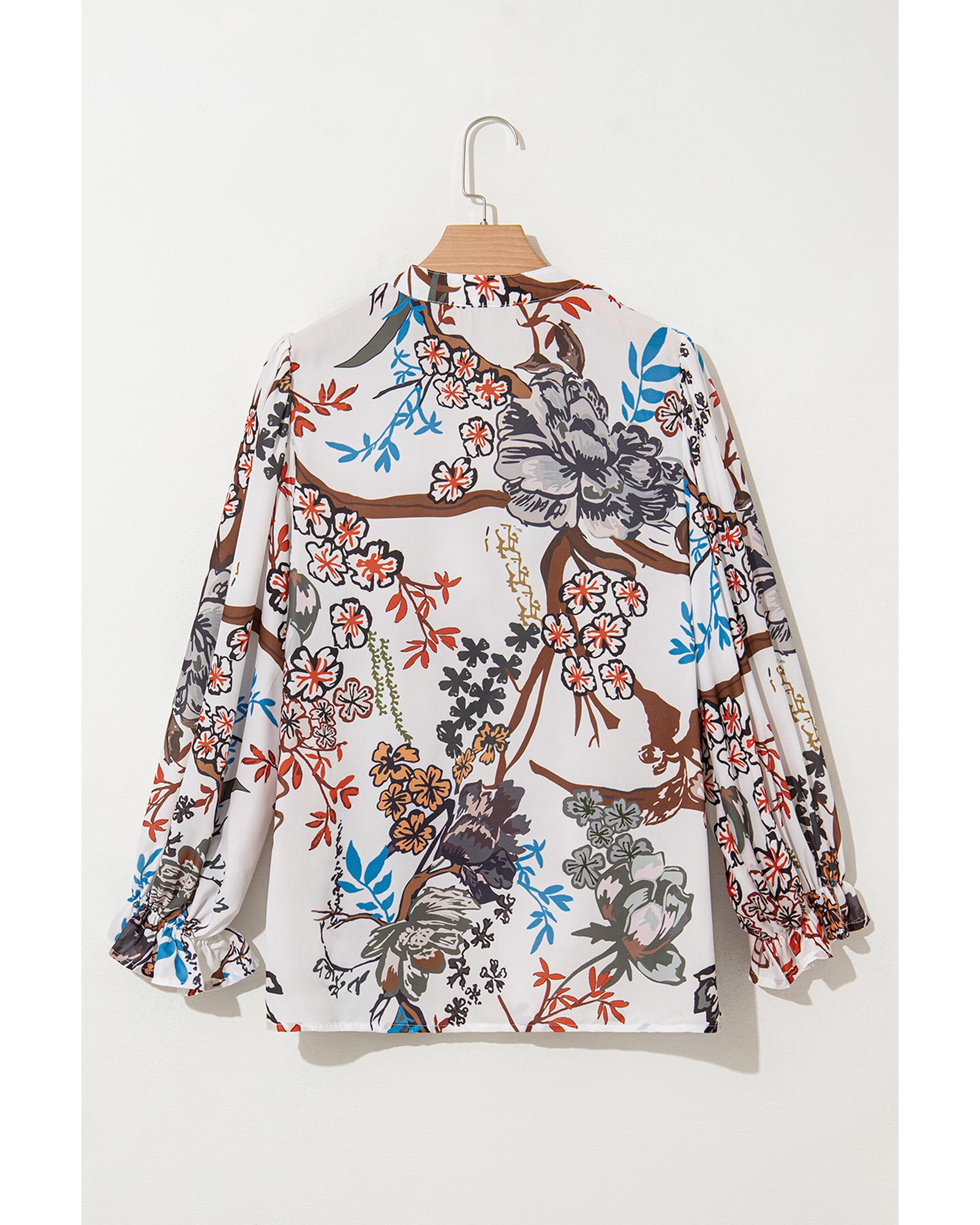White Floral Print Balloon Sleeves Button Up Loose Casual Shirt – M