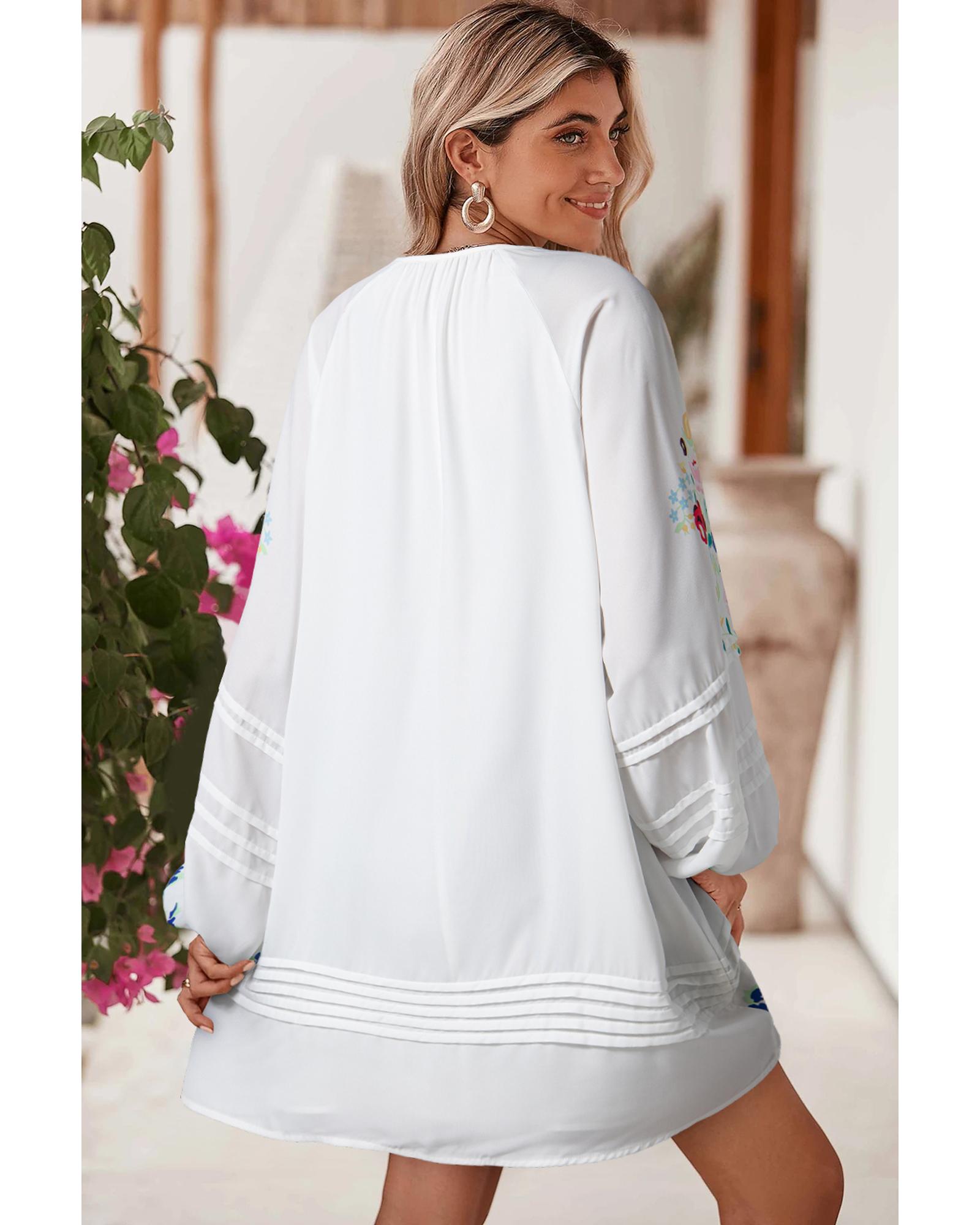 This mini dress features a white floral print with a boho-inspired design, perfect for spring and fall. It offers a trendy fitted look with comfortable puff sleeves, a split neckline, and tuck details, making it suitable for various occasions such as date nights, festivals, beach days, and city strolls.