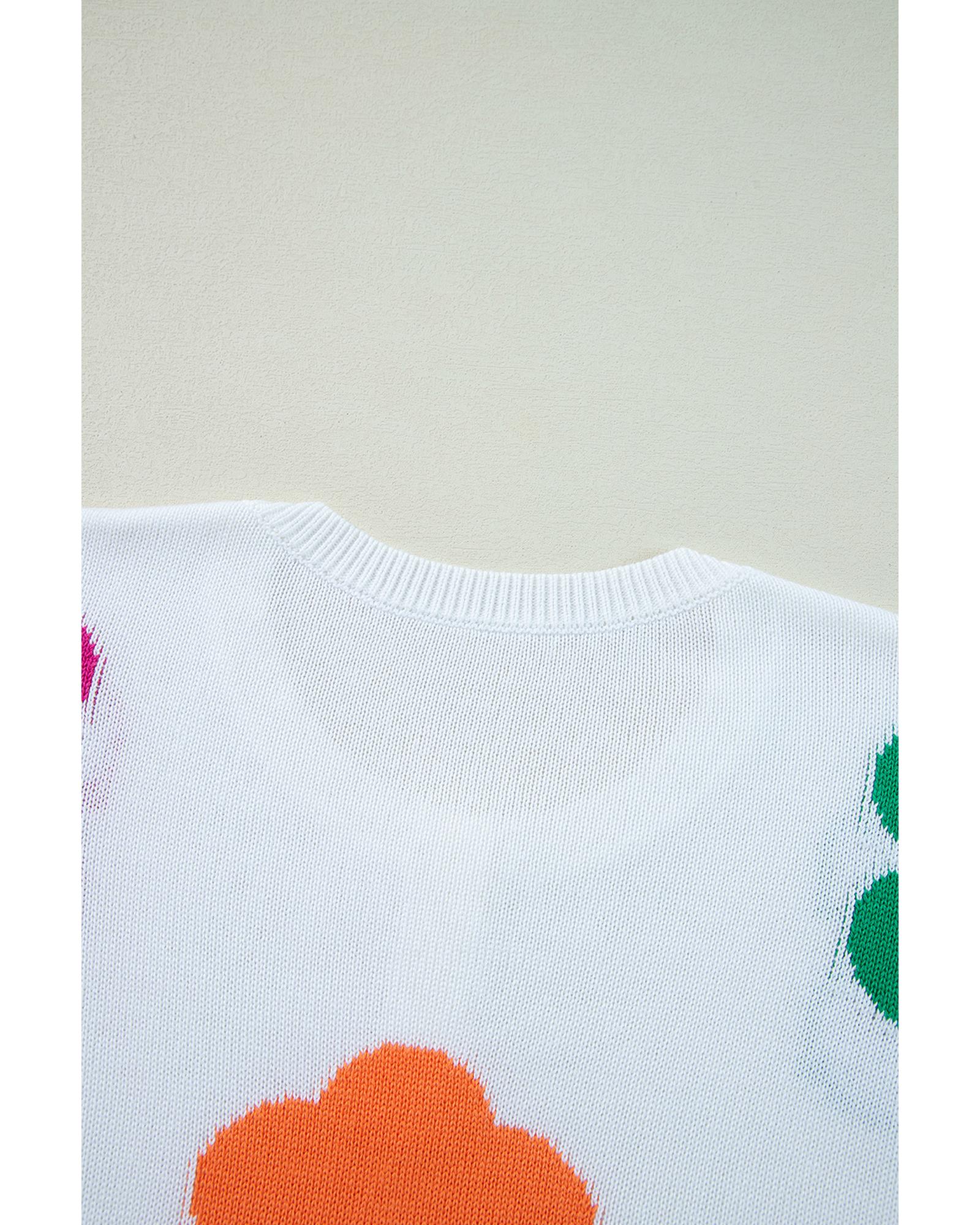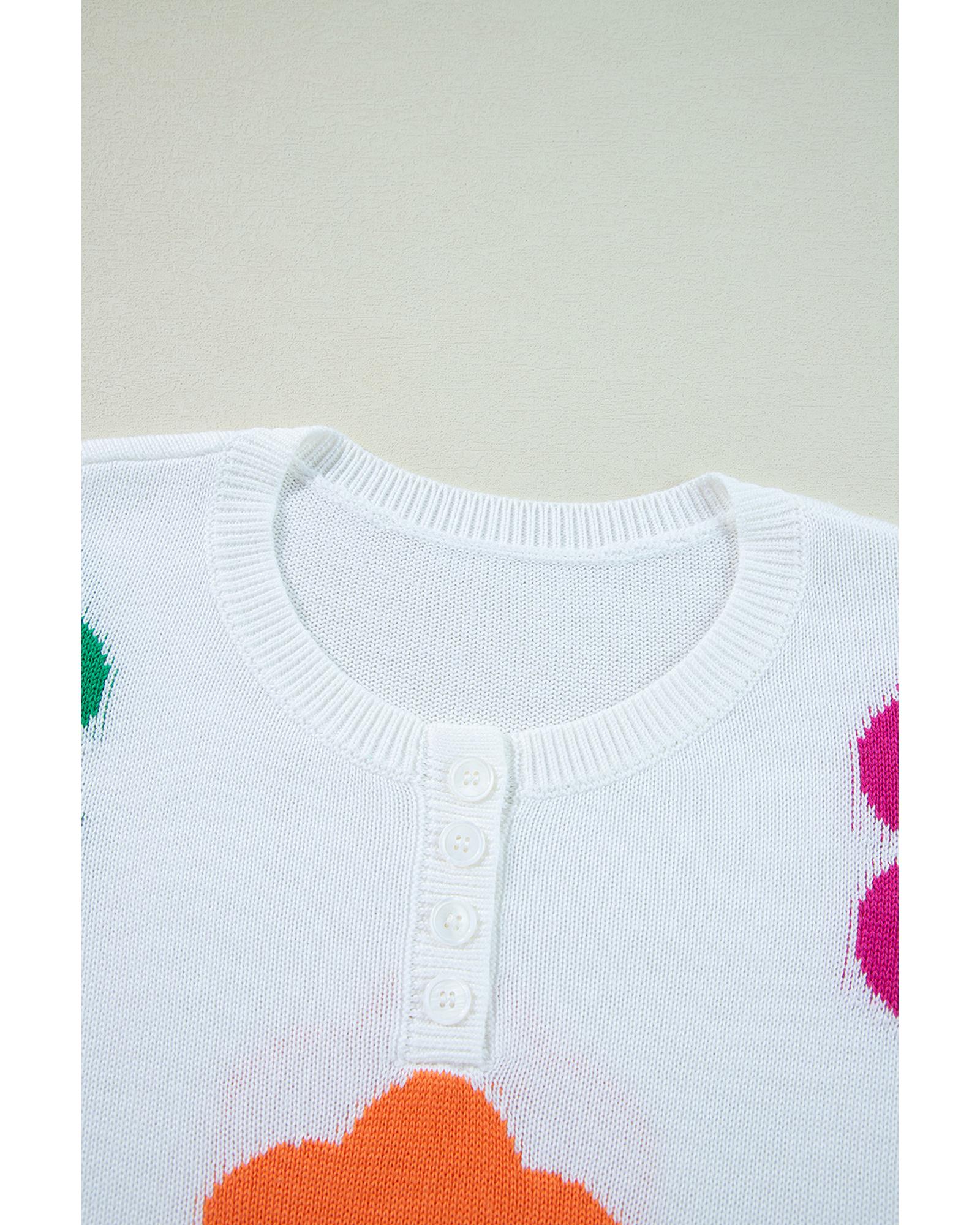 White Floral Print Buttoned Loose Lightweight Sweater – L