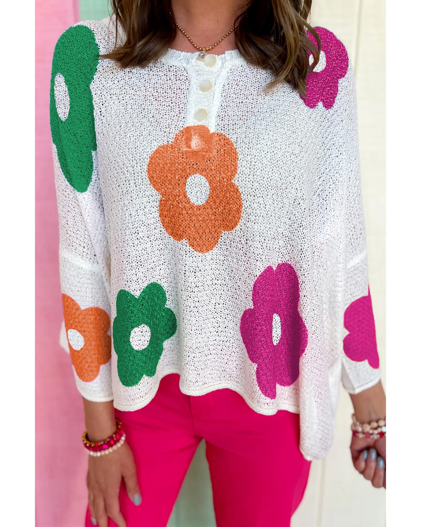 This lightweight sweater features a delicate white floral print and a relaxed, loose fit for comfortable wear. Designed with a stylish buttoned neckline, it combines fashion and comfort, making it suitable for various casual occasions.