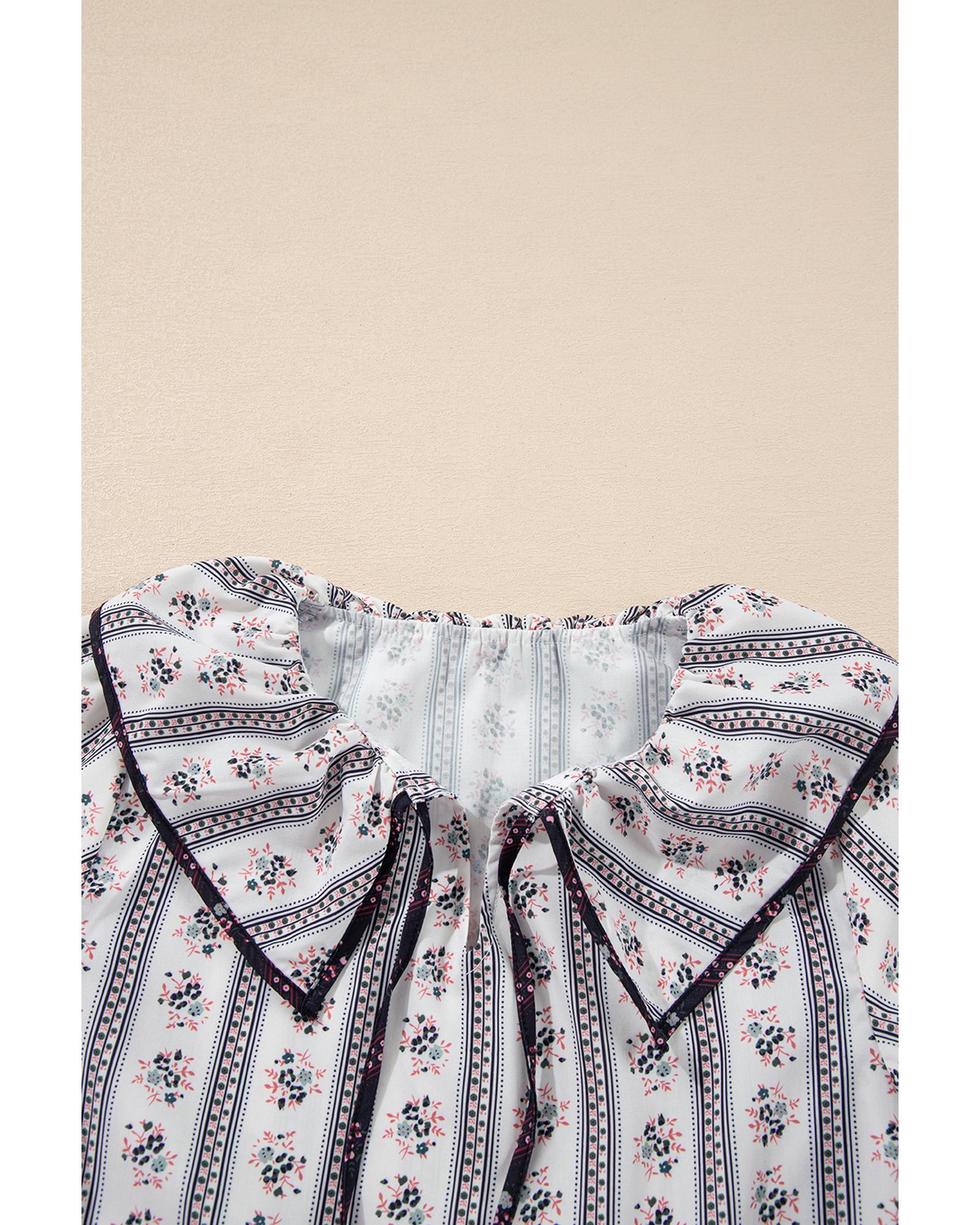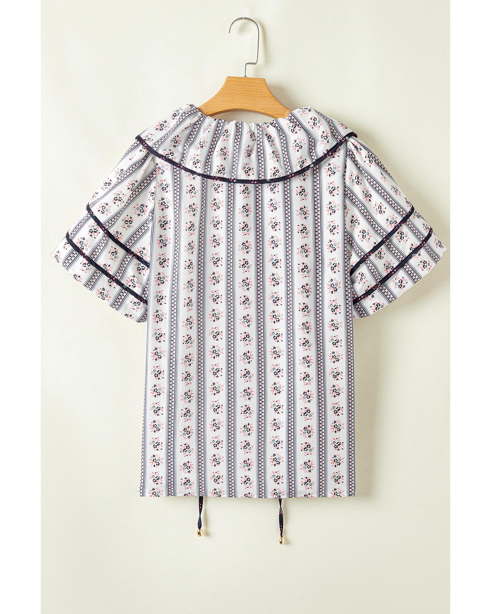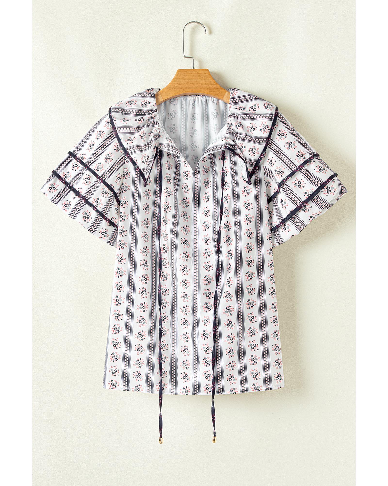 This white floral printed blouse features a ruffled collar and short puff sleeves, offering a stylish and elegant appearance. The contrast hem detail adds a unique touch to the overall design, making it suitable for various occasions.