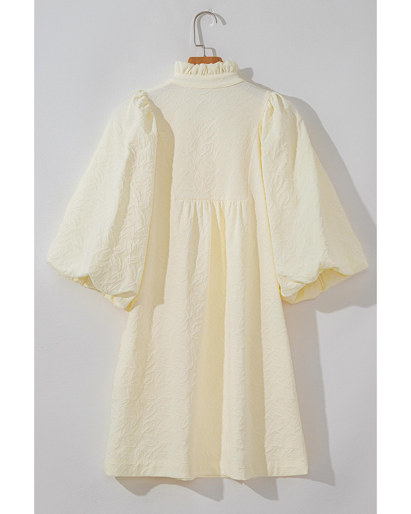 White Floral Textured Bubble Sleeve Frilled Notched Neck Dress – XL