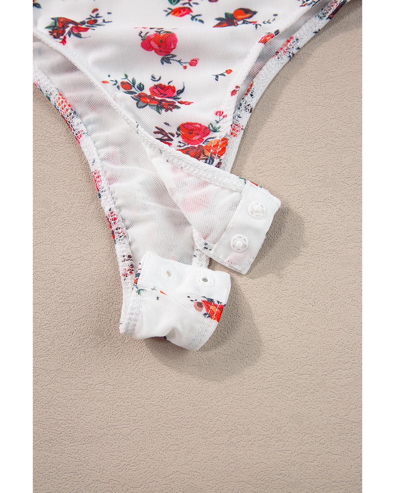 This white floral bodysuit features a stylish V cut neckline with frilled trim and adjustable spaghetti straps, offering a trendy and fitted look. Designed with high-quality materials, it combines comfort and style, making it ideal for pairing with skinny jeans or other casual outfits.