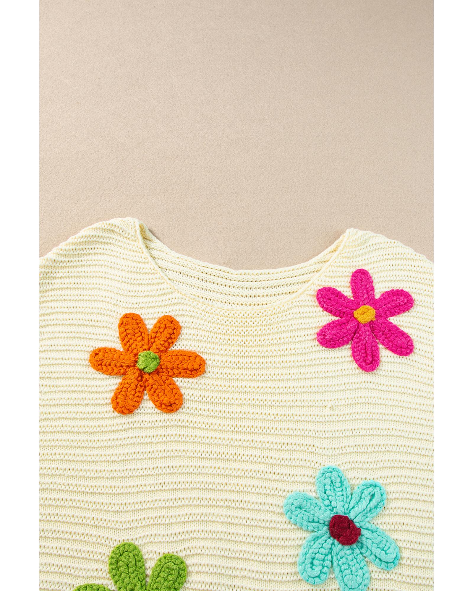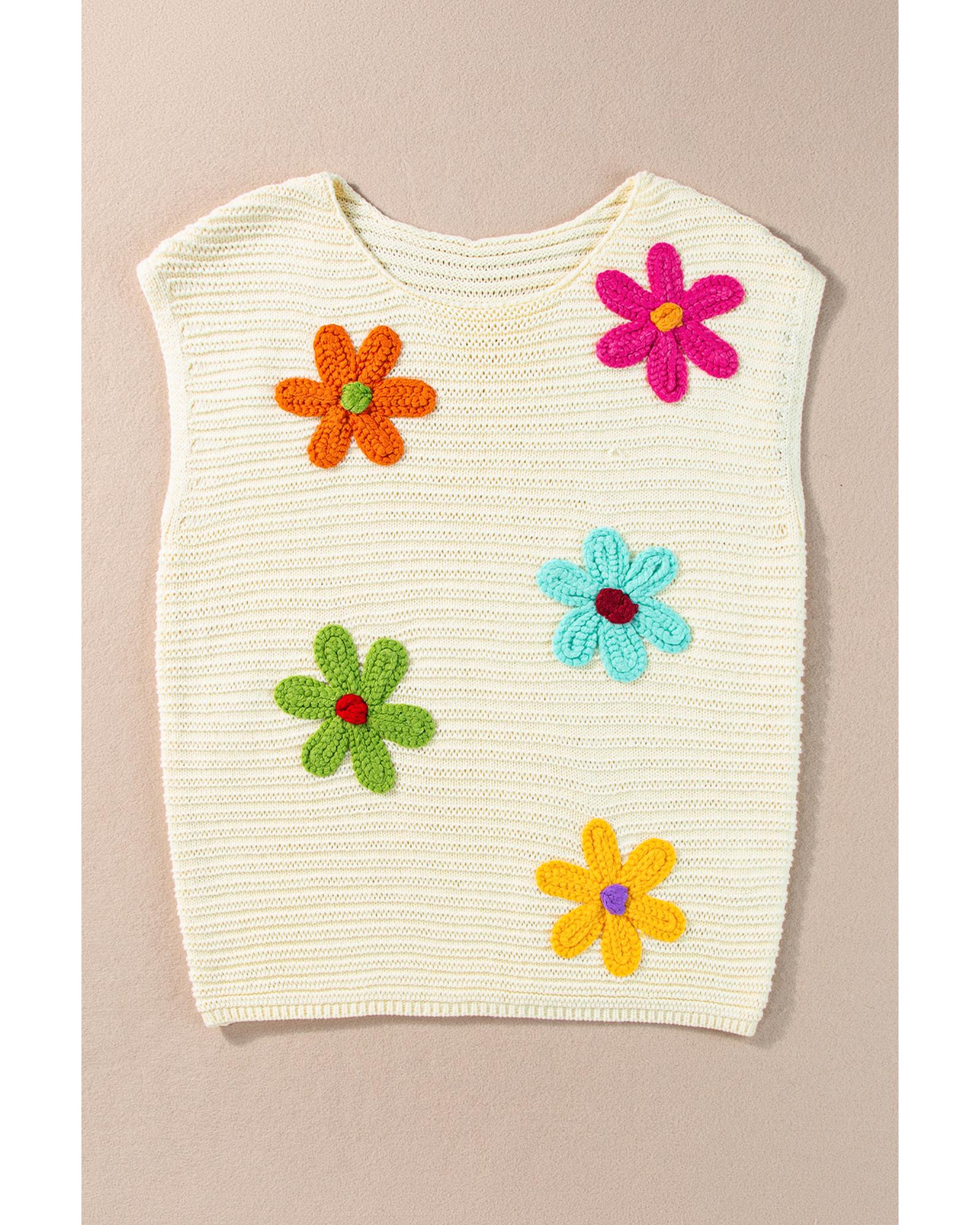 White Flower Crochet Round Neck Knitted Top – L