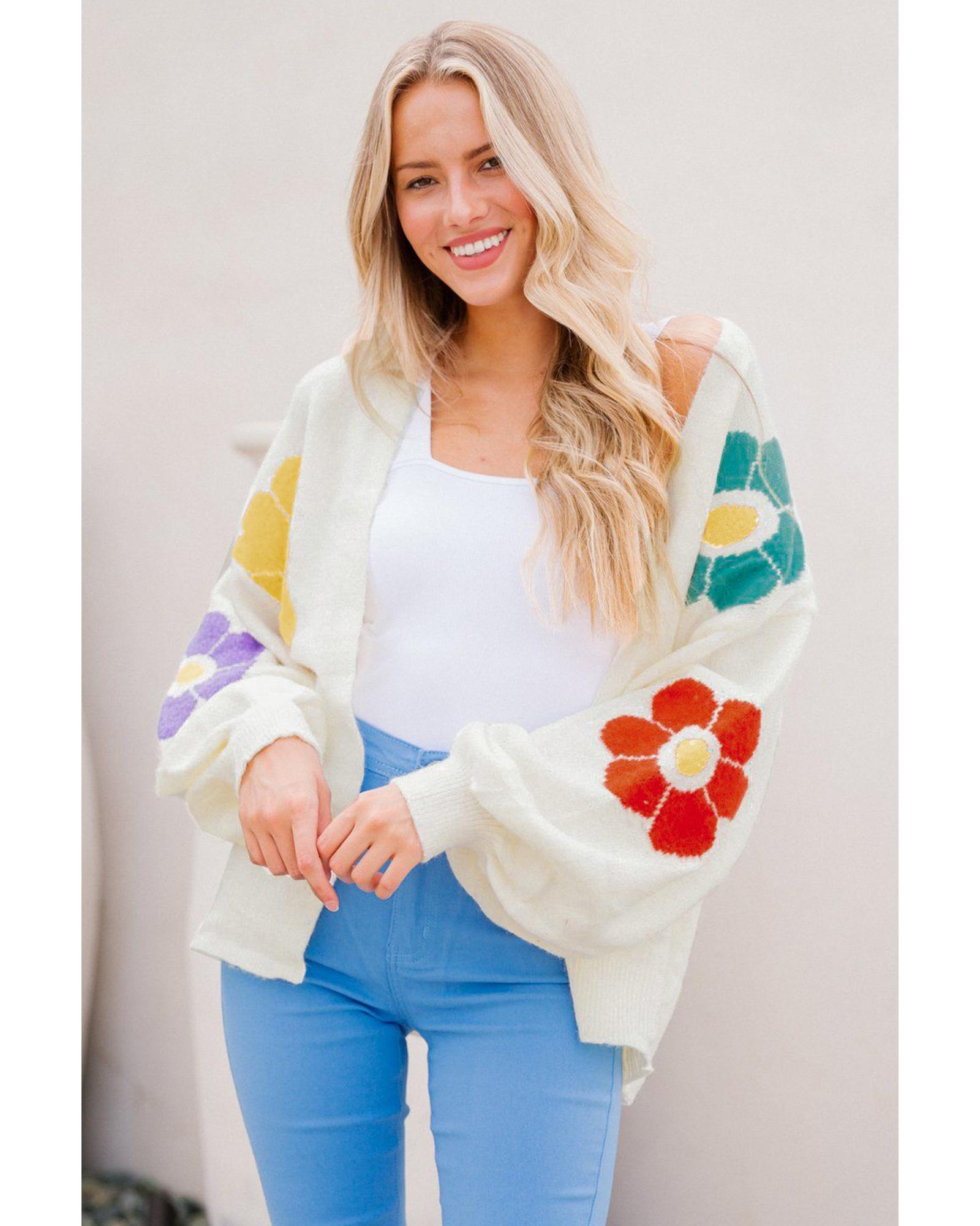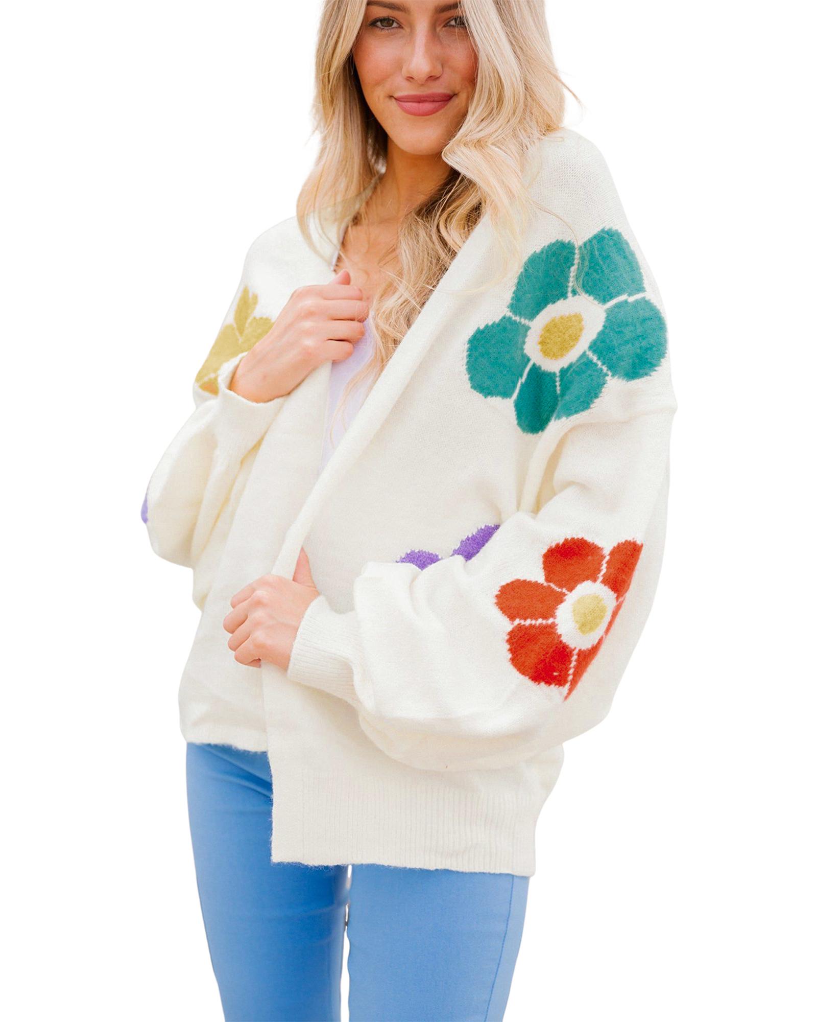 This open cardigan features a luxurious white flower jacquard design with bubble sleeves, offering a trendy and versatile addition to any wardrobe. Its open style makes it ideal for layering over simple tops or dresses, suitable for various occasions and seasons.