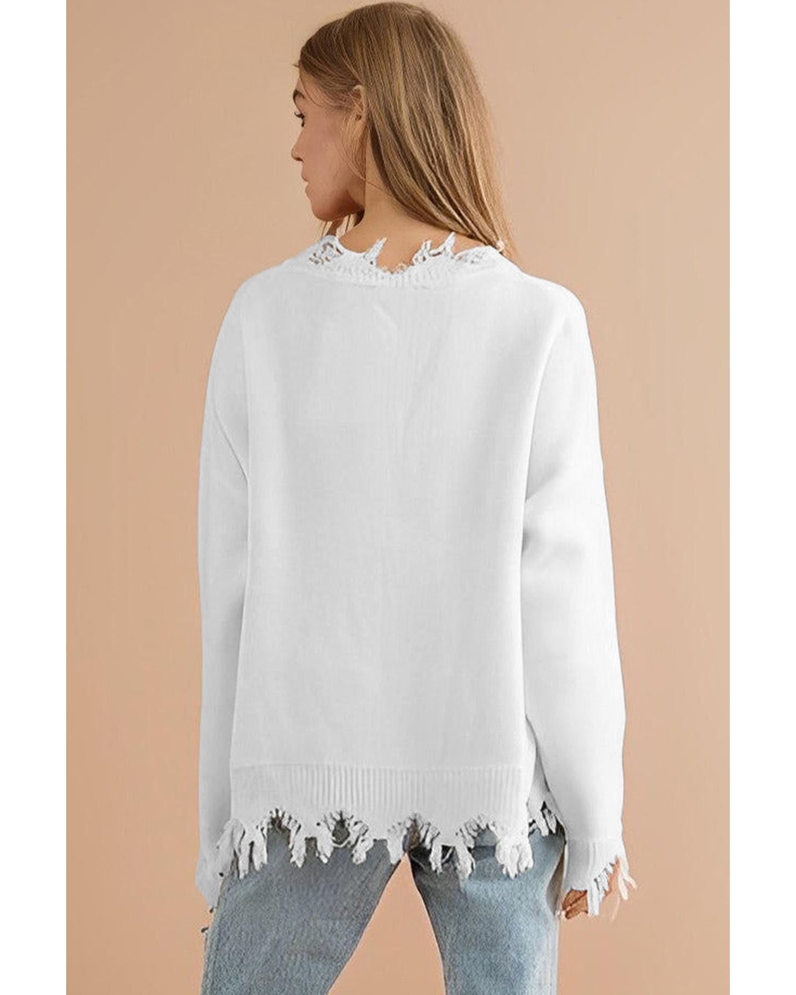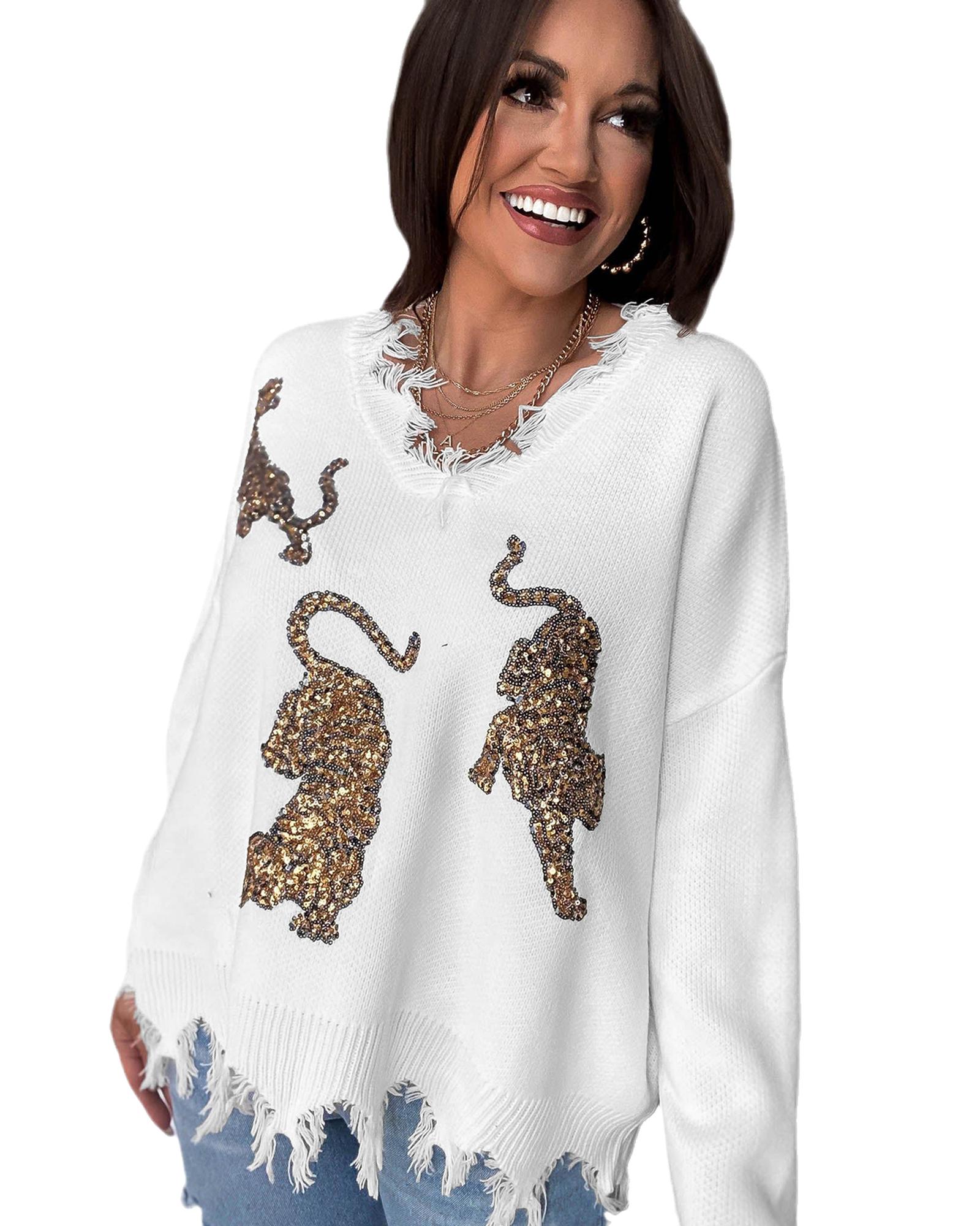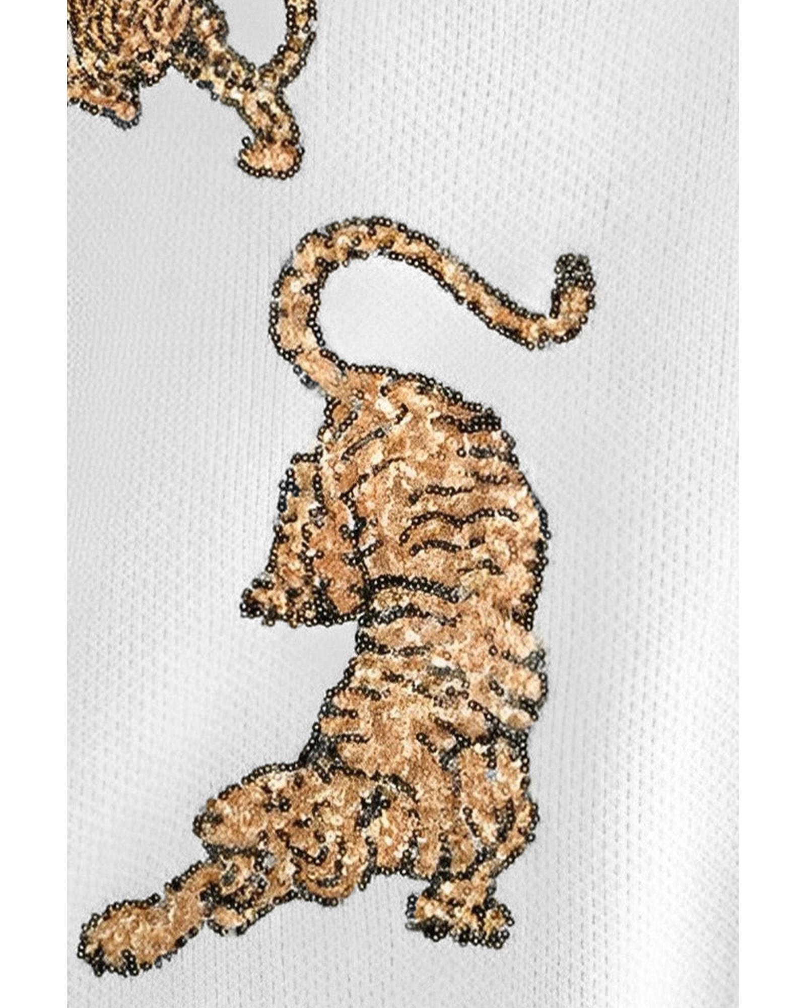 This luxurious white sweater features a stylish frayed hemline and a striking sequin tiger motif, making it a perfect statement piece for both casual and special occasions. Designed with a trendy fitted silhouette, it offers a fashionable look while ensuring comfort and durability with high-quality materials.