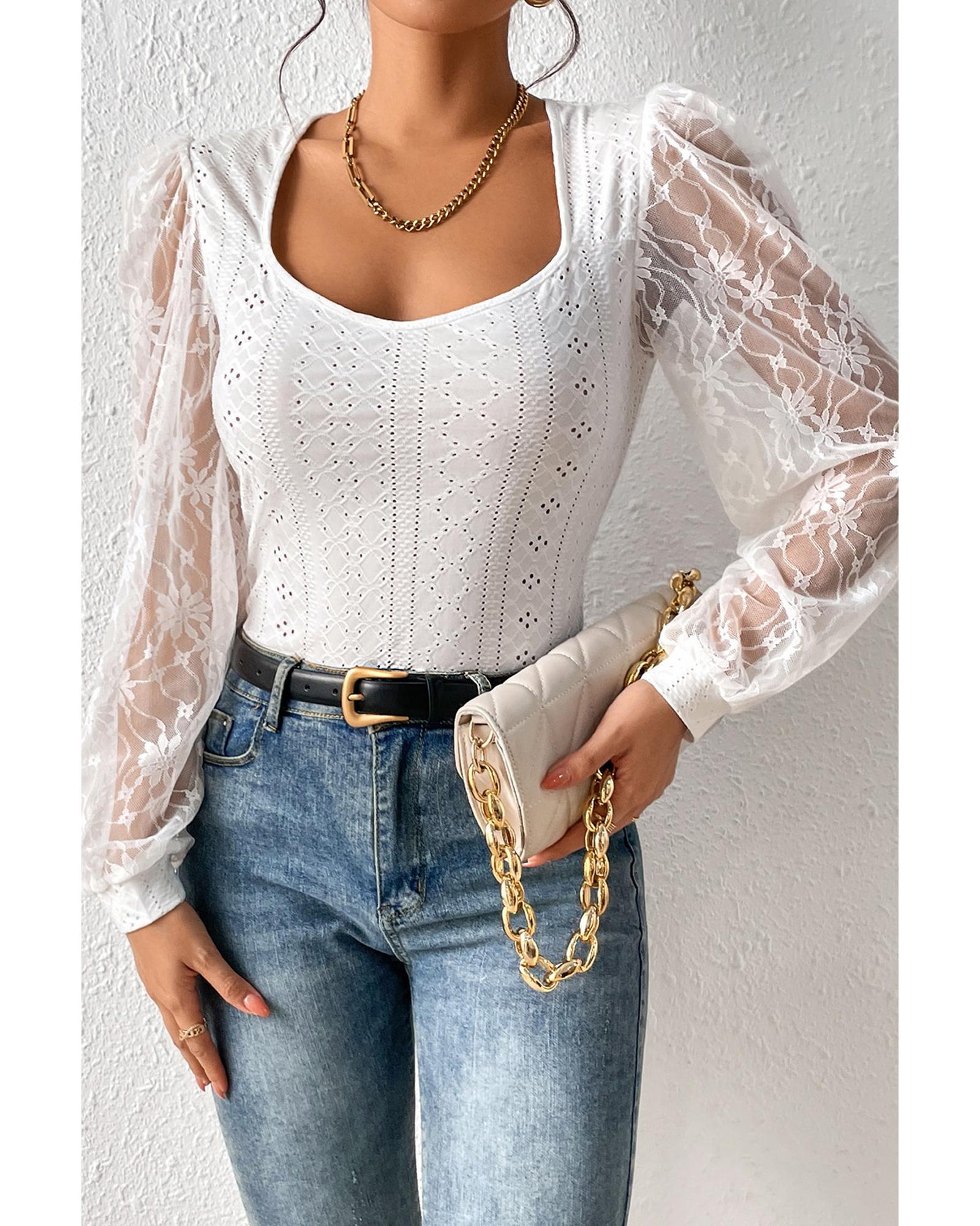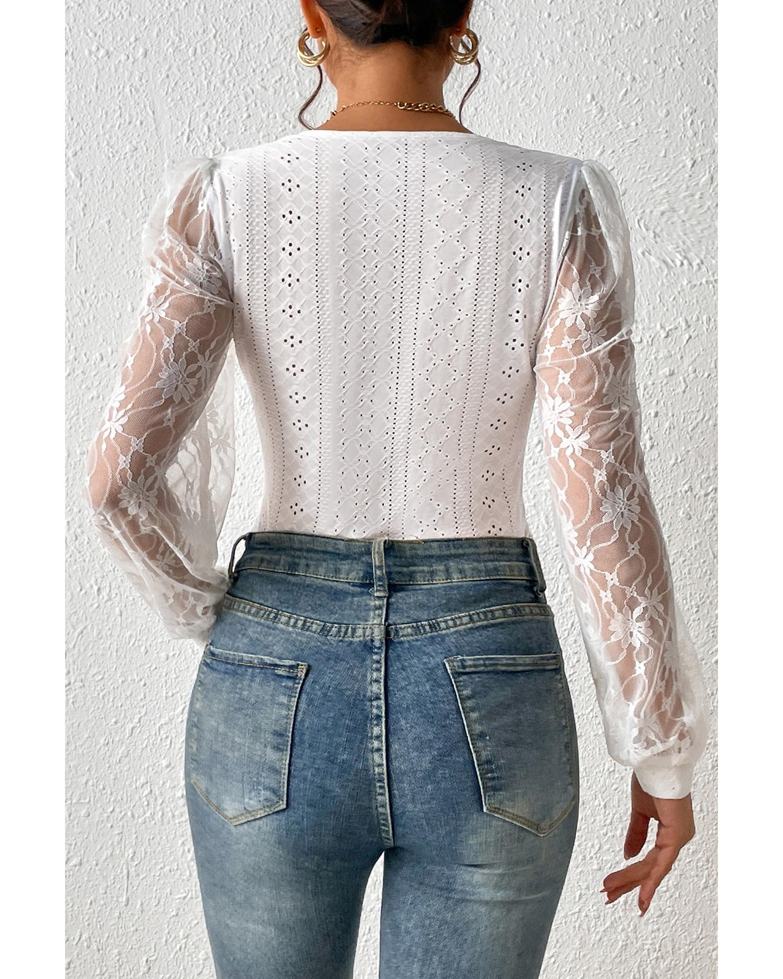 White Frenchy Contrast Lace Bishop Sleeve Bodysuit – M