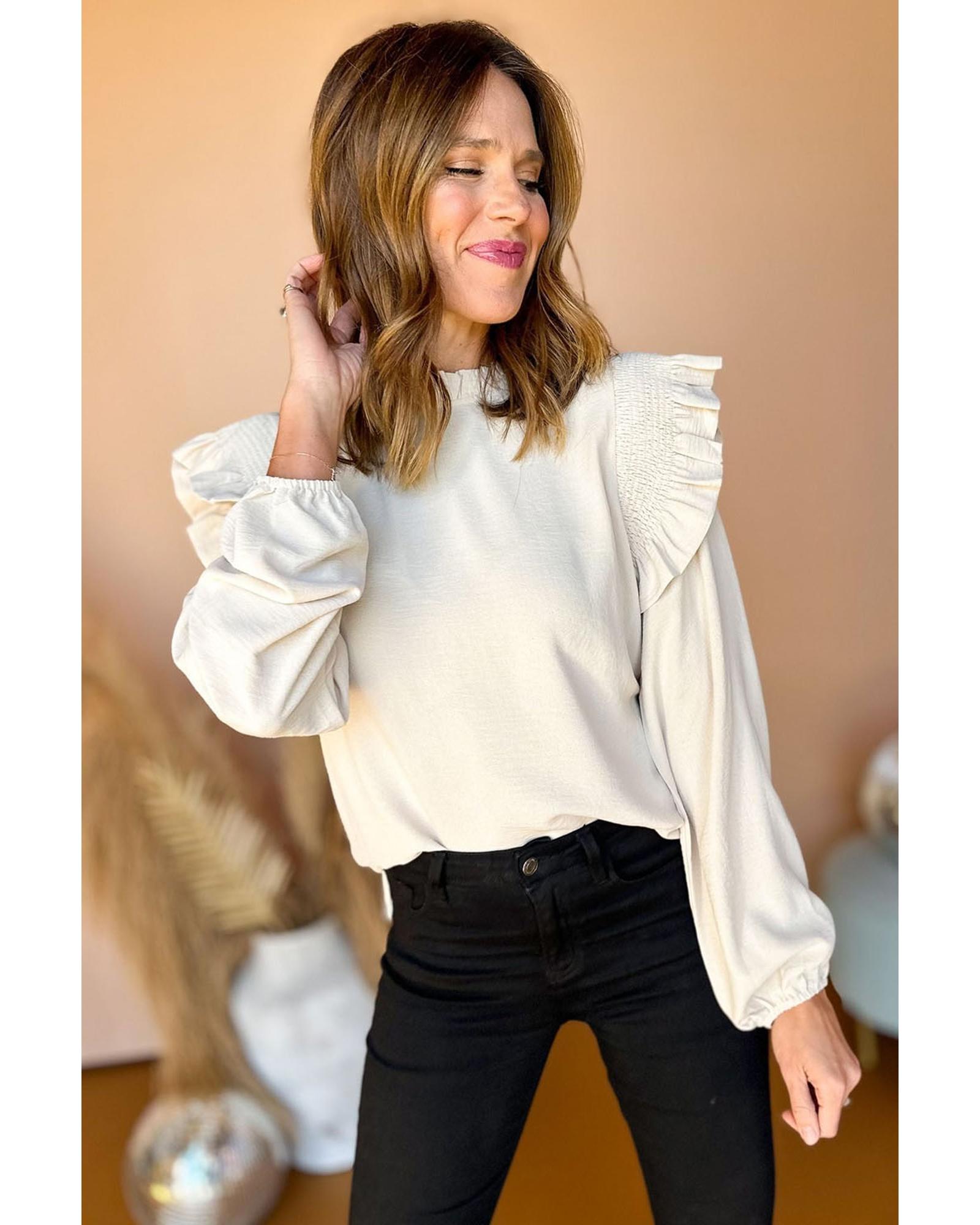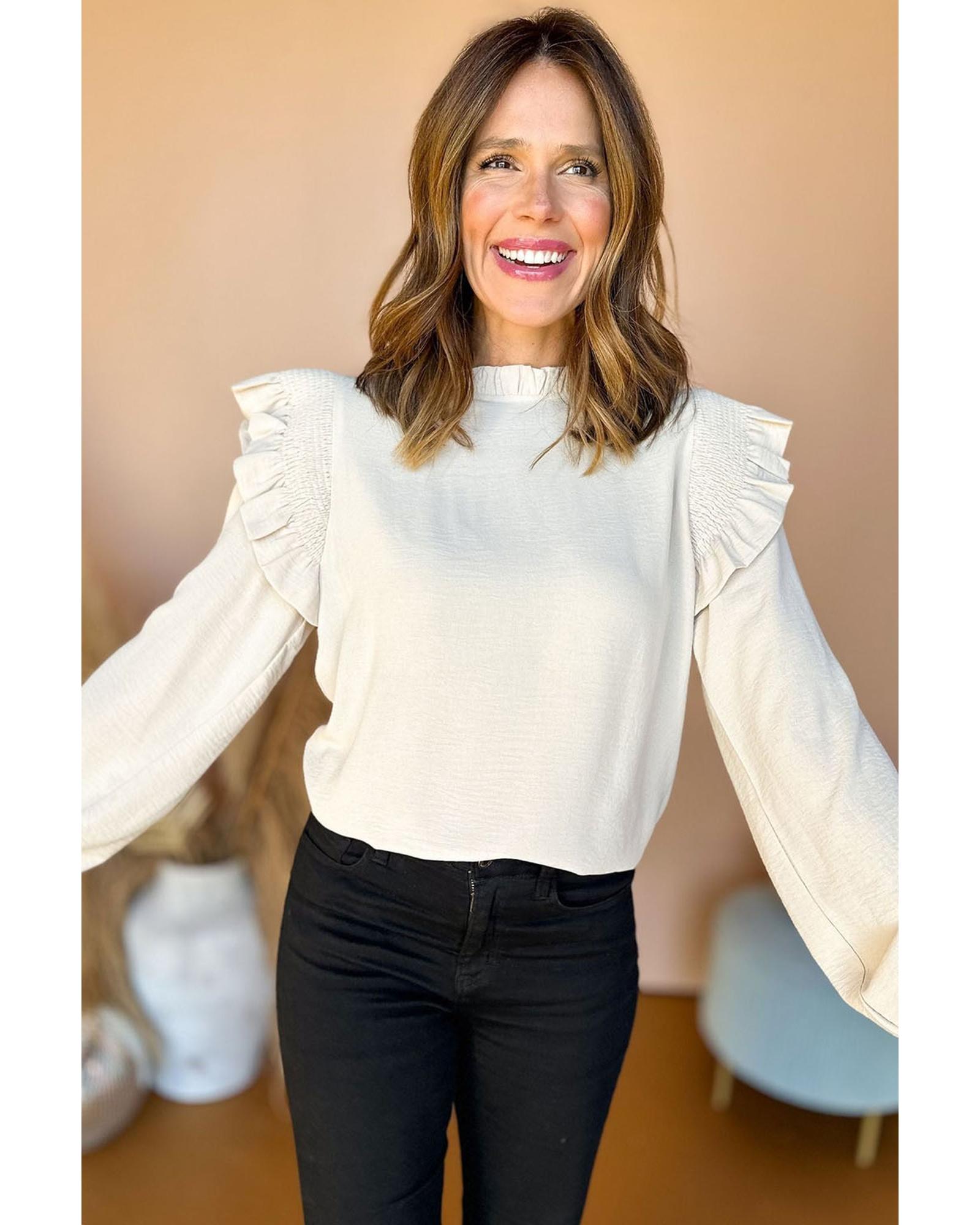 - Plain white blouse with shirred ruffled shoulder design