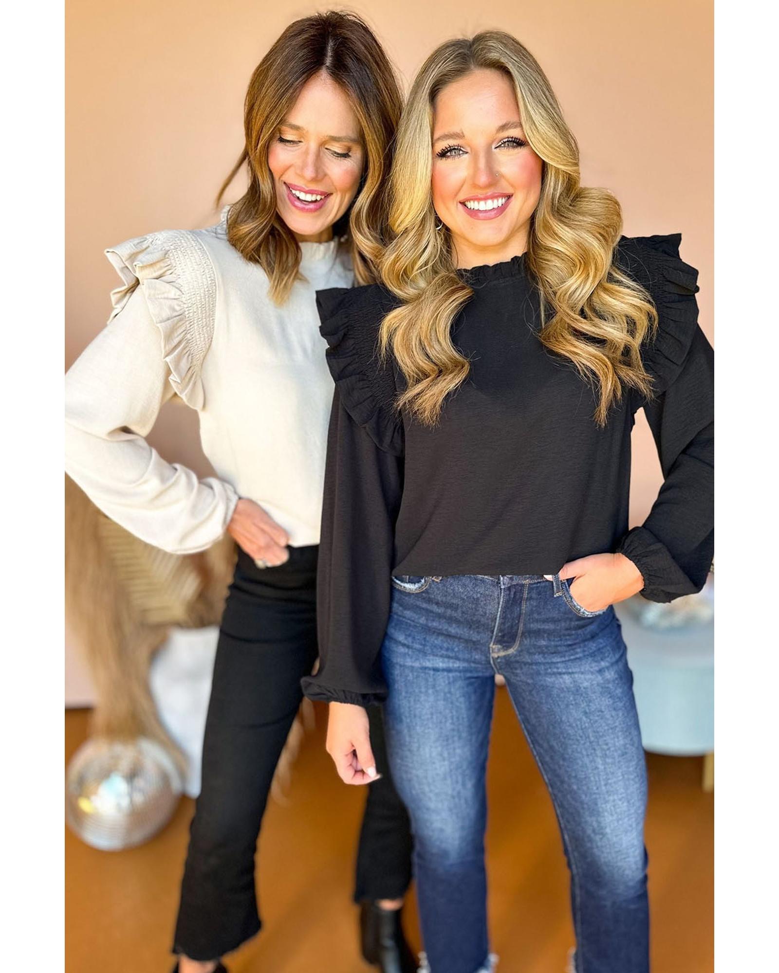 This white blouse features a stylish design with ruffled shoulders, a frilled neckline, and bubble sleeves, offering a feminine and elegant appearance suitable for various occasions. Its trendy fitted style is crafted to complement modern fashion preferences and is suitable for women of different ages and body types.