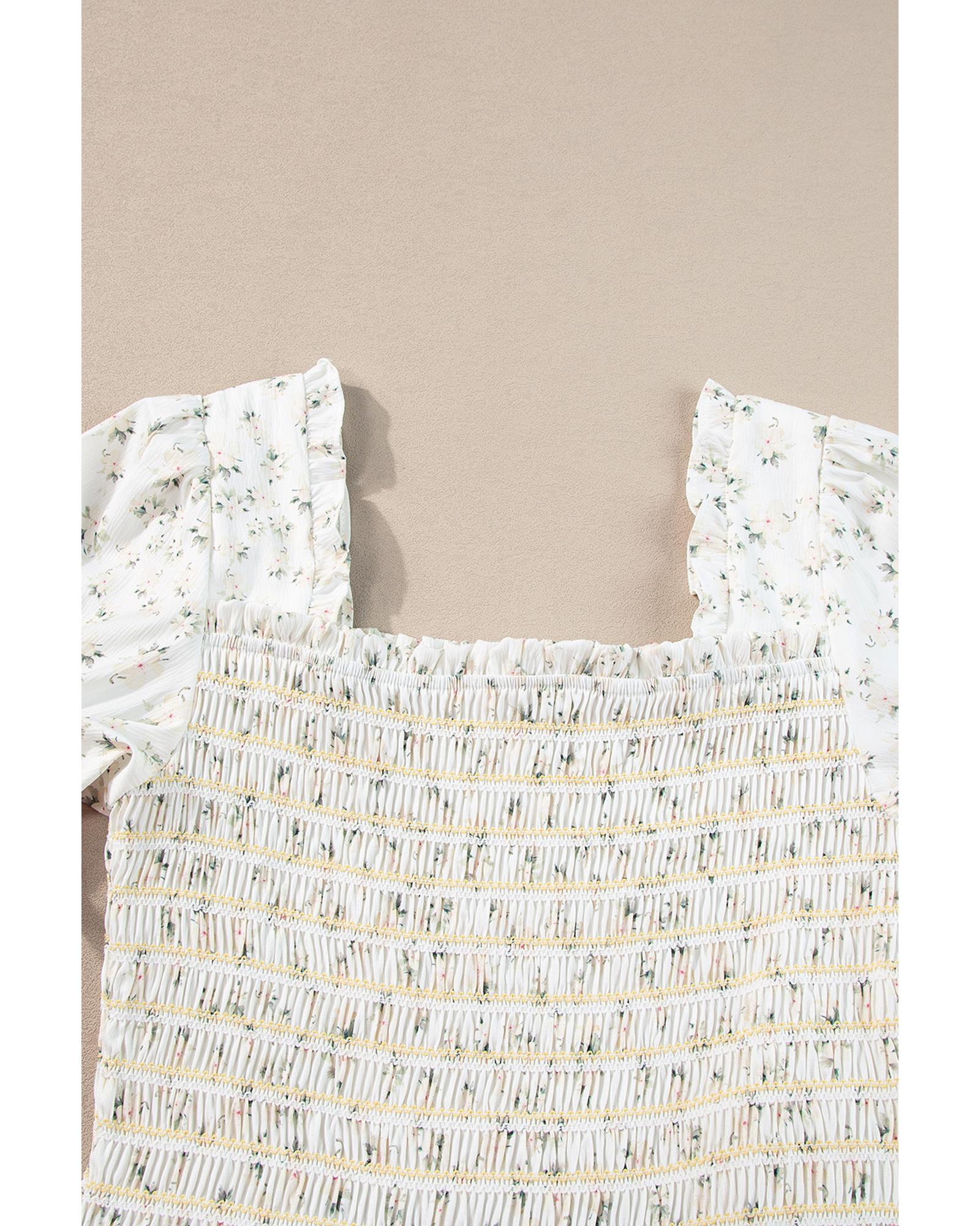 White Frilly Shirred Bodice Tiered Floral Maxi Dress – L