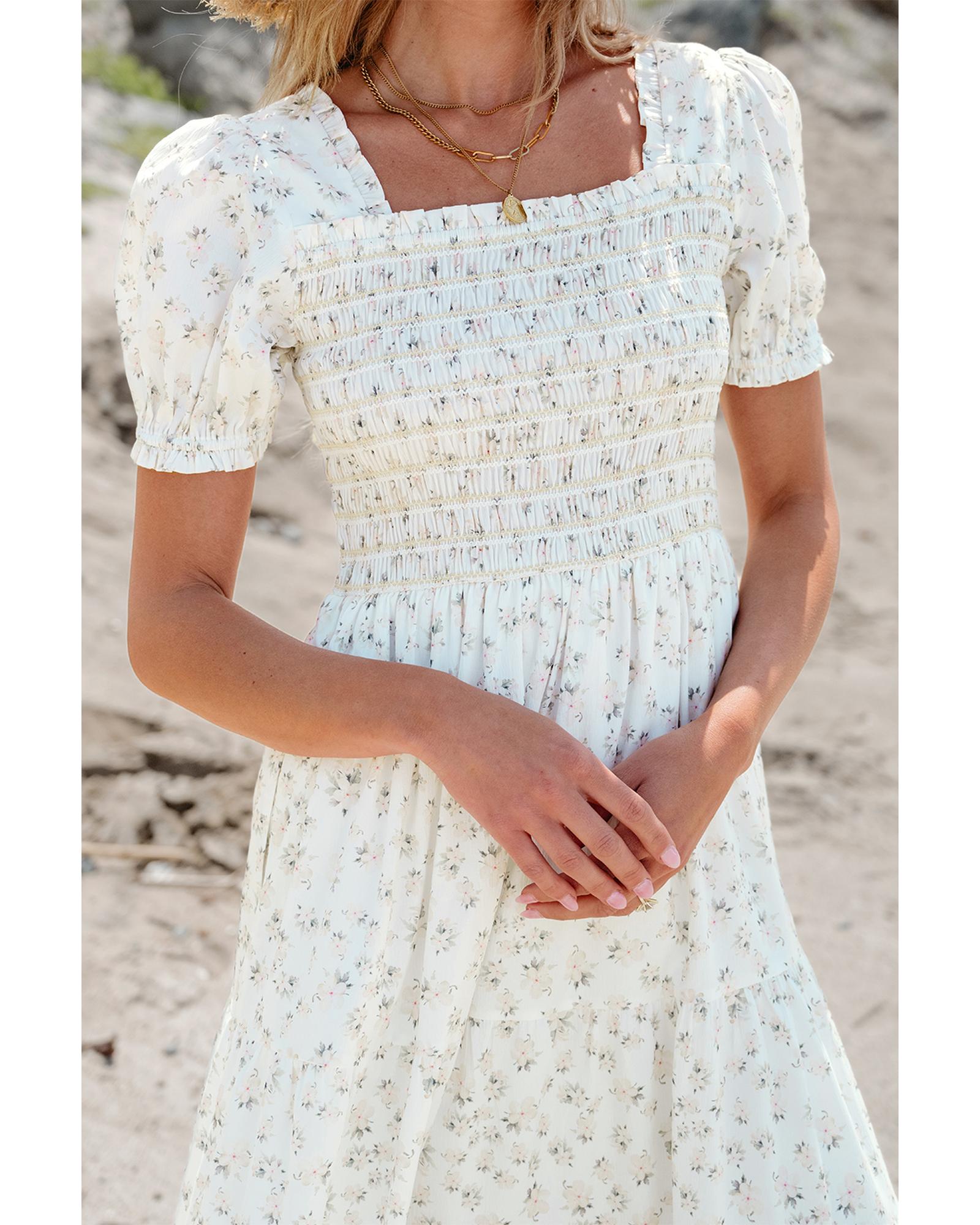 This floral maxi dress features a feminine and flowy design, perfect for summer occasions. It combines a chic shirred bodice with a tiered layered look, complemented by puff short sleeves for added elegance. Crafted from lightweight polyester, it offers a comfortable fit and stylish appearance.