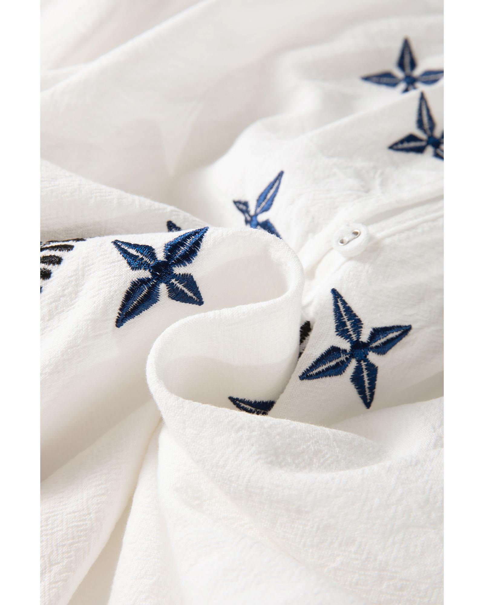 This white geometric embroidered long sleeve blouse features a buttoned neckline and a relaxed silhouette, offering a stylish yet comfortable look. Designed with intricate embroidery details, it balances chic and casual effortlessly. The long sleeves provide coverage and warmth, making it suitable for various occasions.