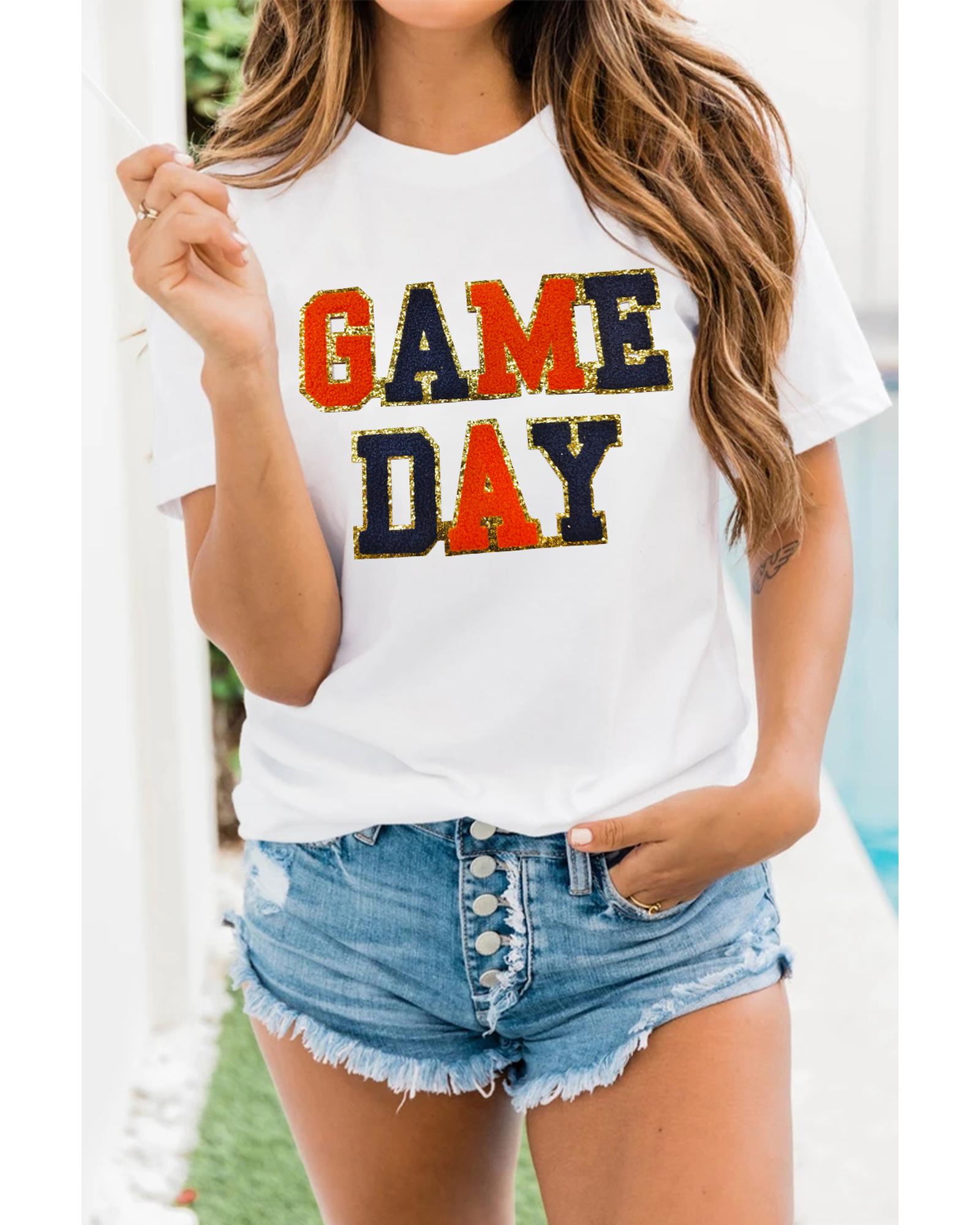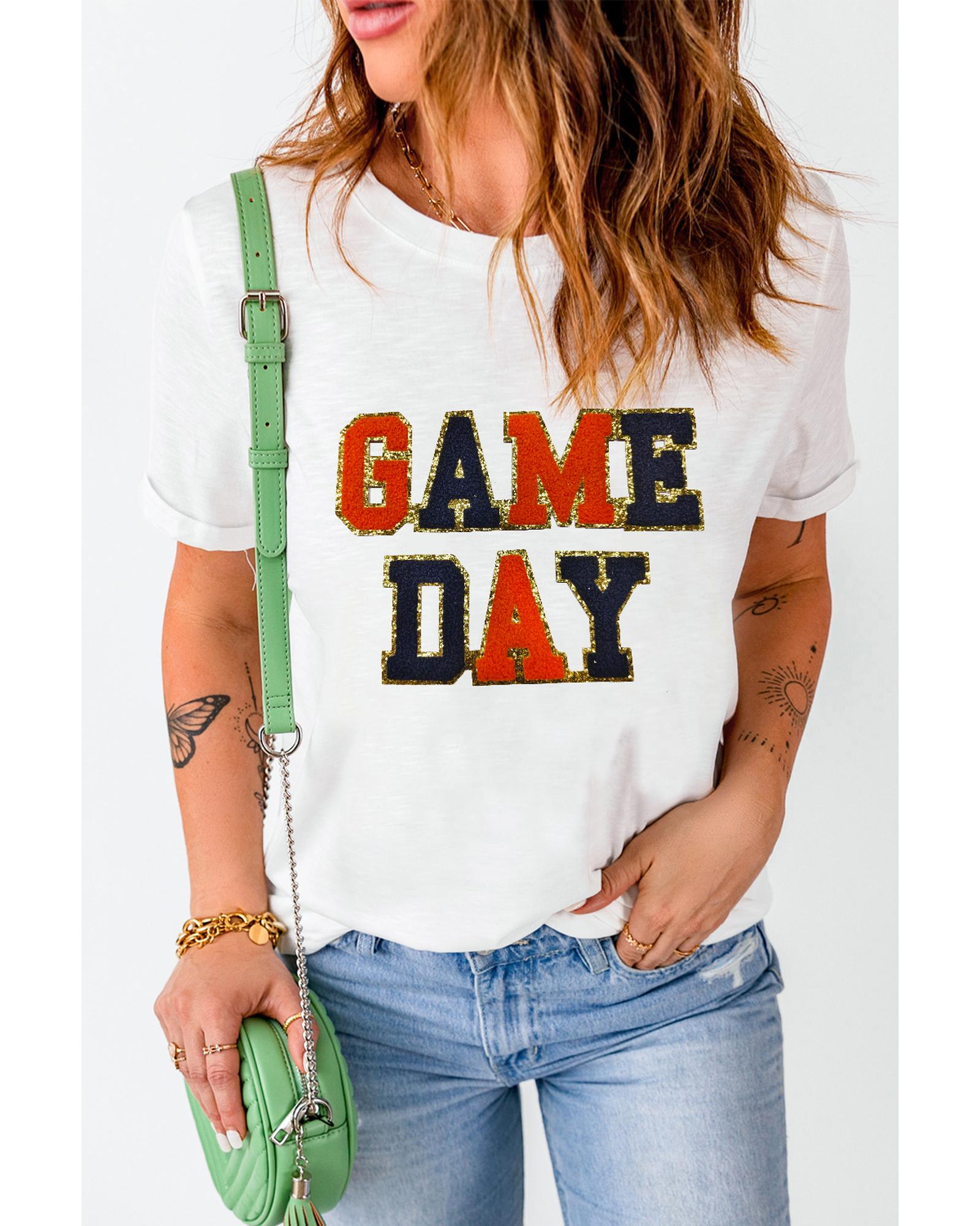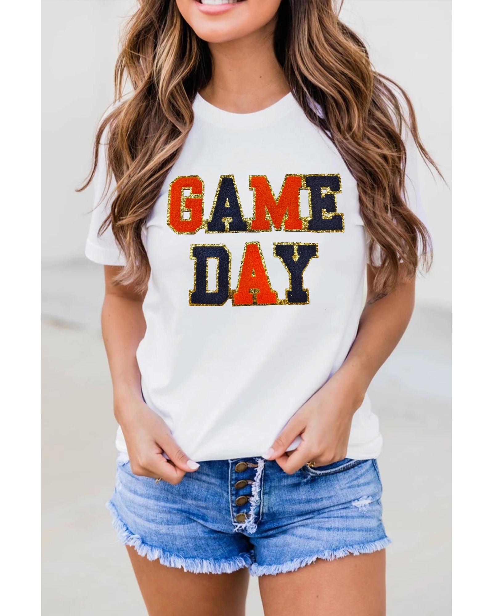 This white glitter rugby football season round neck T-shirt is designed with a trendy fitted look, perfect for game day or casual outings. It features a sparkling glitter detail that adds a touch of team spirit and style. The classic crew neck and short sleeves make it a versatile and comfortable choice for various occasions.