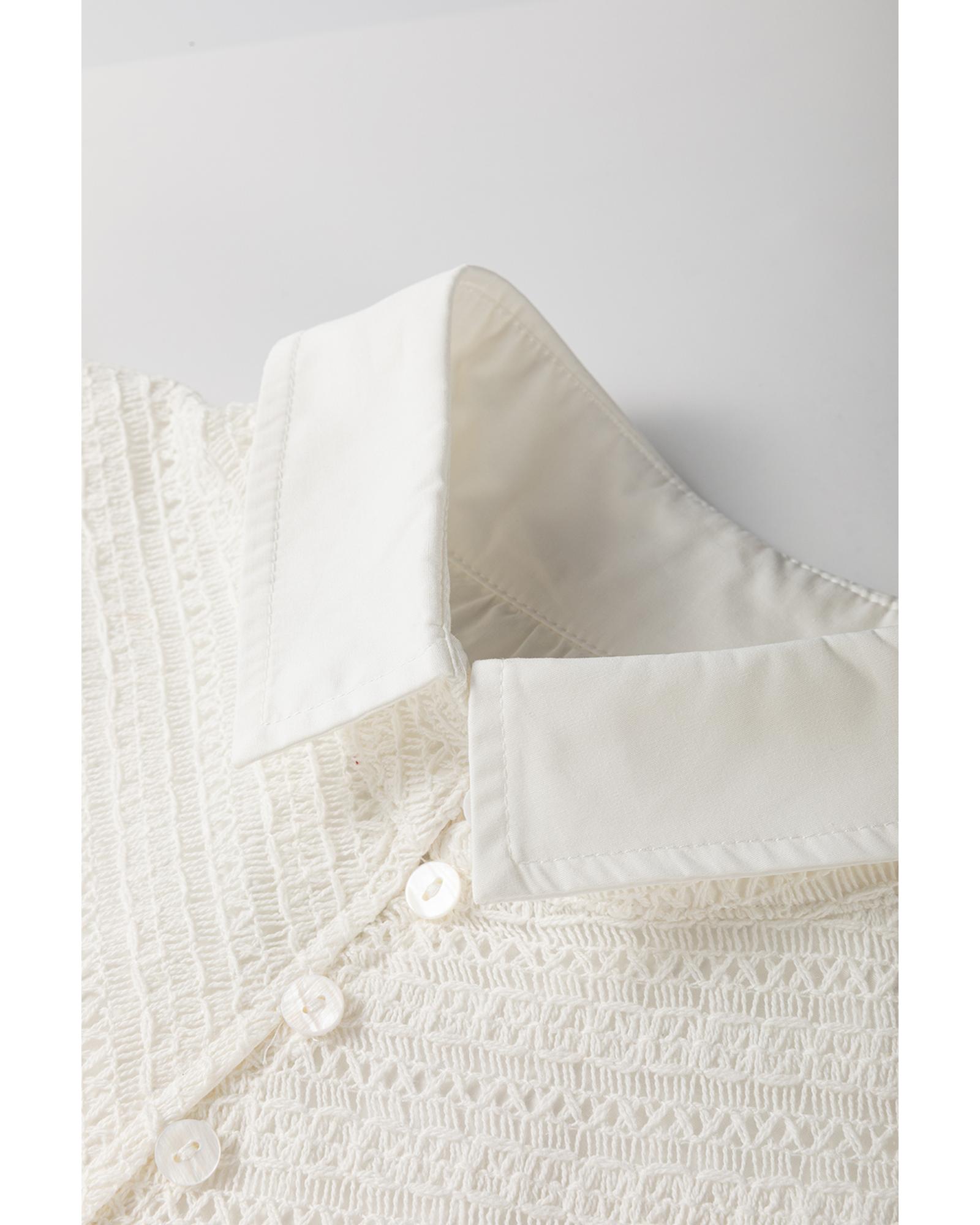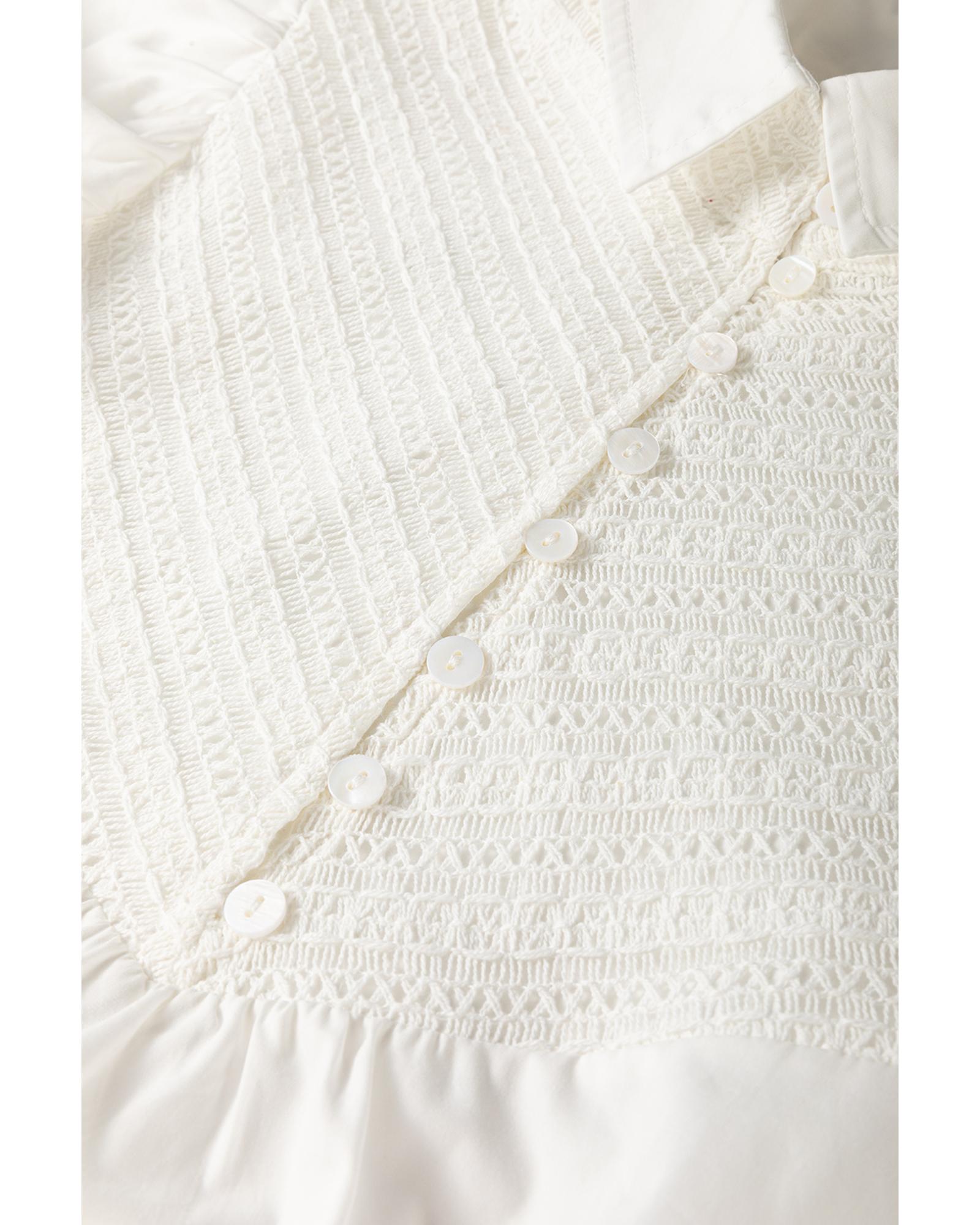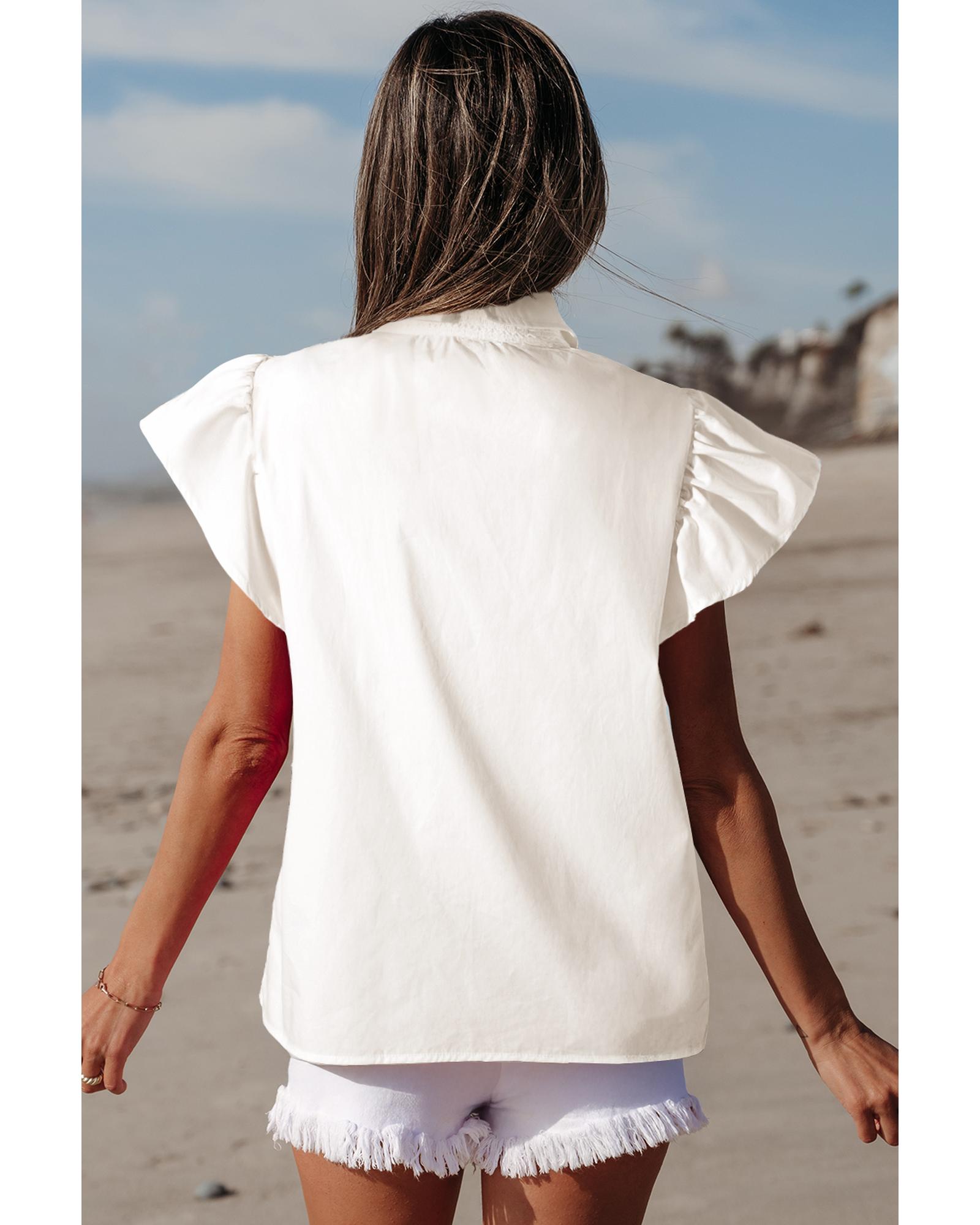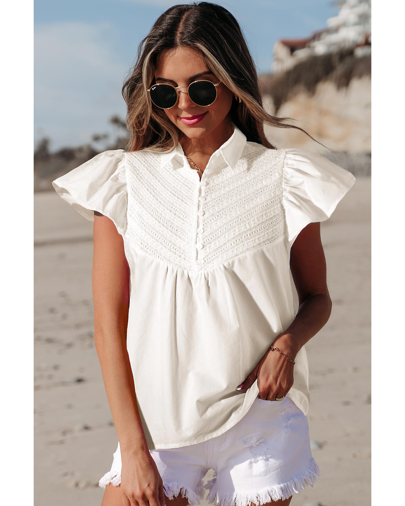 White Half Button Lace Patchwork Flutter Sleeve Blouse – M