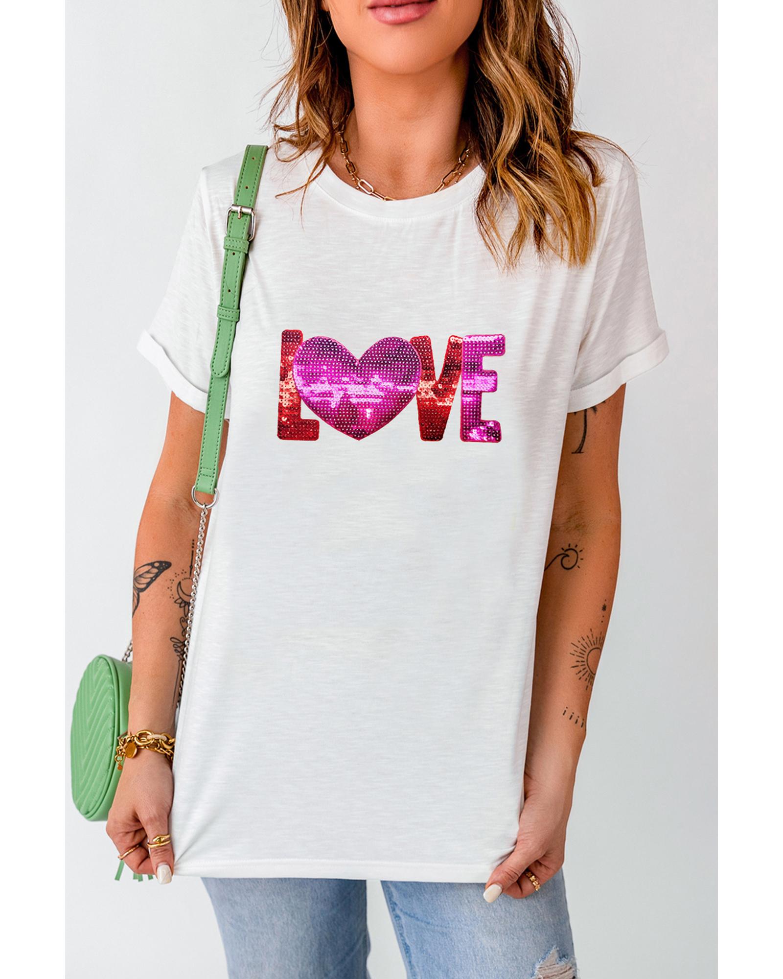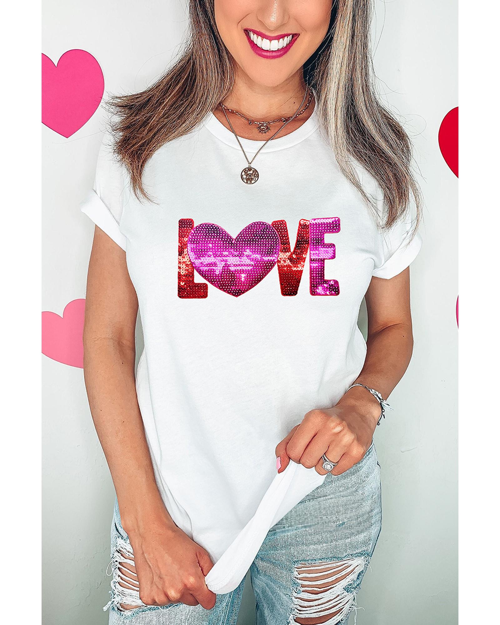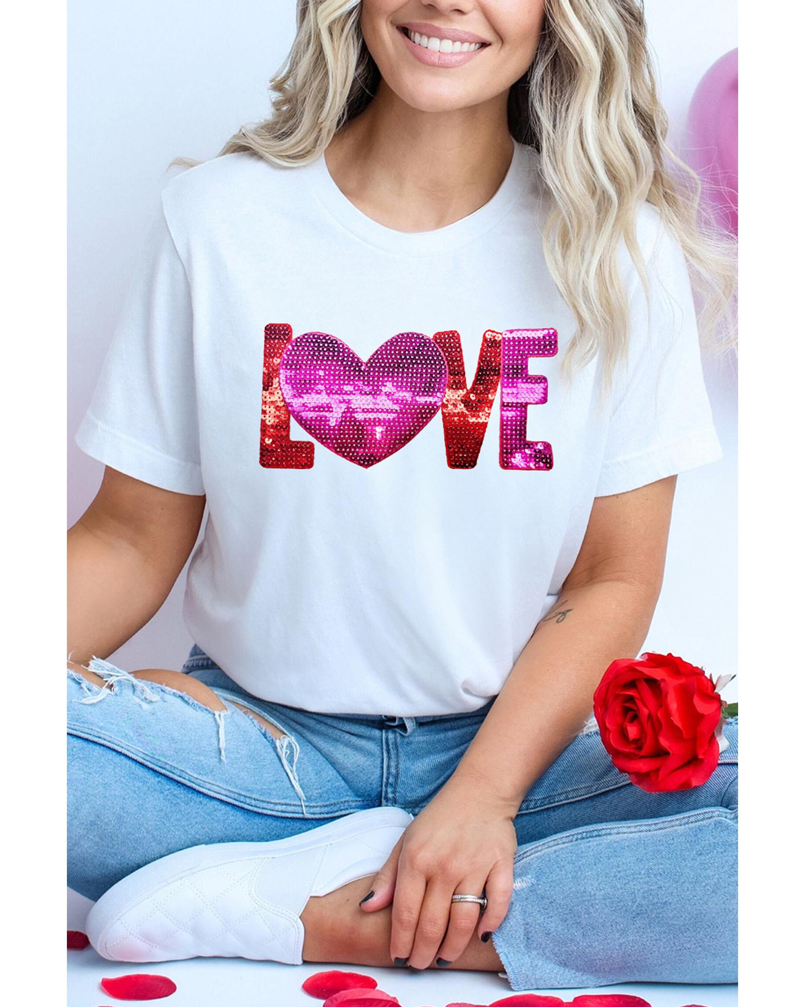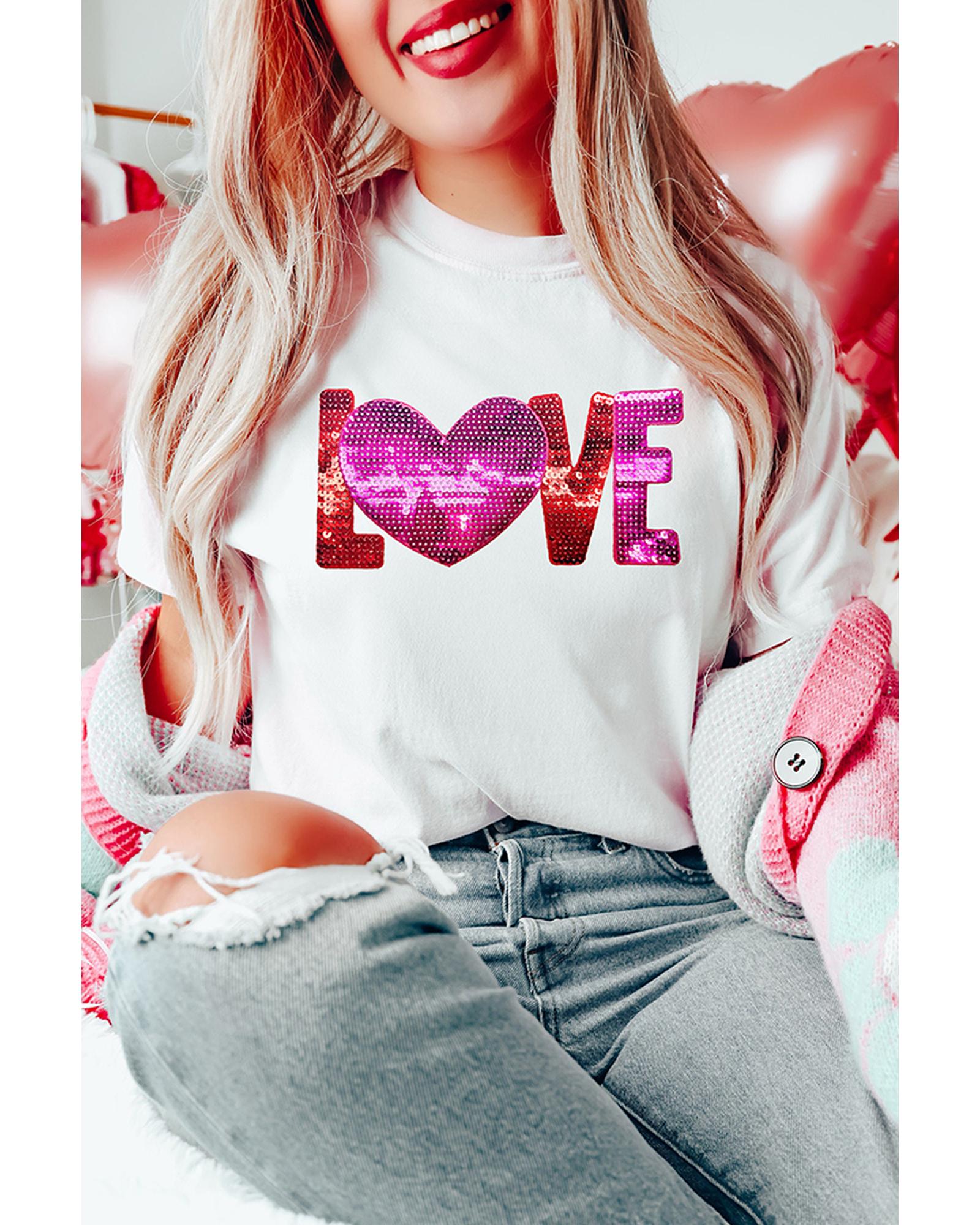 White Heart LOVE Patched Pattern Crewneck Valentines T Shirt – 3XL