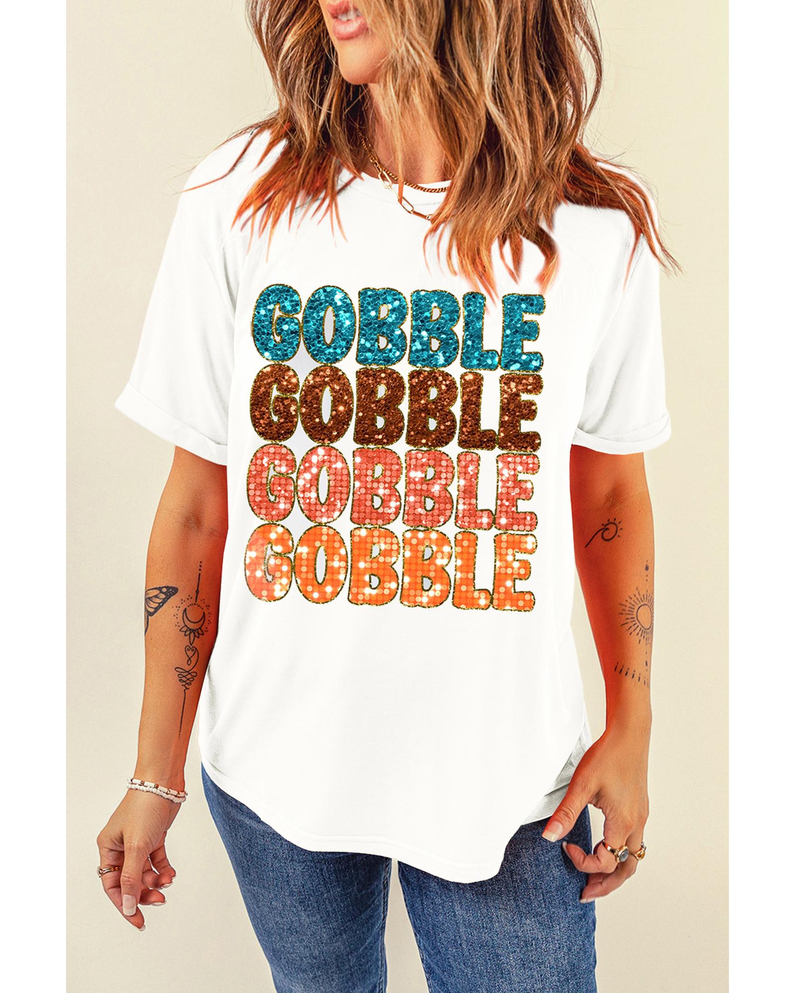This crewneck Thanksgiving T-shirt features a bold GOBBLE graphic design, perfect for celebrating the holiday with style. Made from a breathable and soft fabric, it offers all-day comfort with a trendy fitted look. The shirt is suitable for showcasing holiday spirit in a fashionable way.