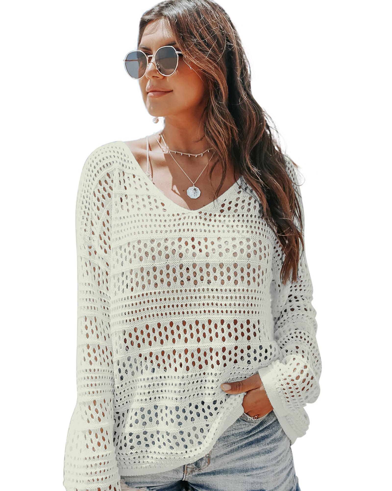 This hollow out crochet V-neck pullover sweater combines a trendy fitted style with a unique design. It features a lightweight, soft, and skin-friendly fabric, making it comfortable for various occasions. The loose fit and long sleeves provide a relaxed and stylish look, perfect for pairing with casual outfits.