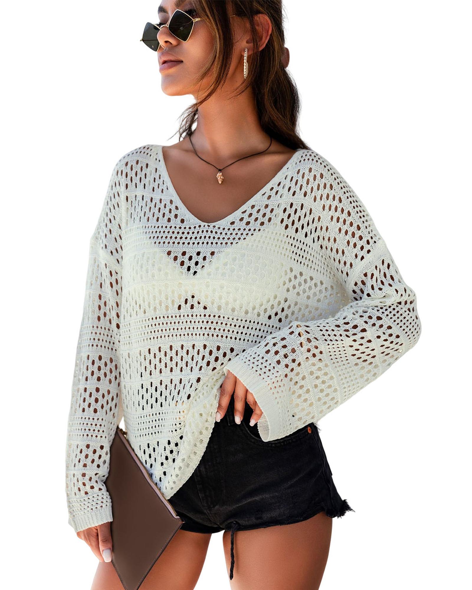 This hollow out crochet V-neck pullover sweater combines a trendy fitted style with a unique design. It features a lightweight, soft, and skin-friendly fabric, making it comfortable for various occasions. The loose fit and long sleeves provide a relaxed and stylish look, perfect for pairing with casual outfits for beach outings, vacations, or casual dates.