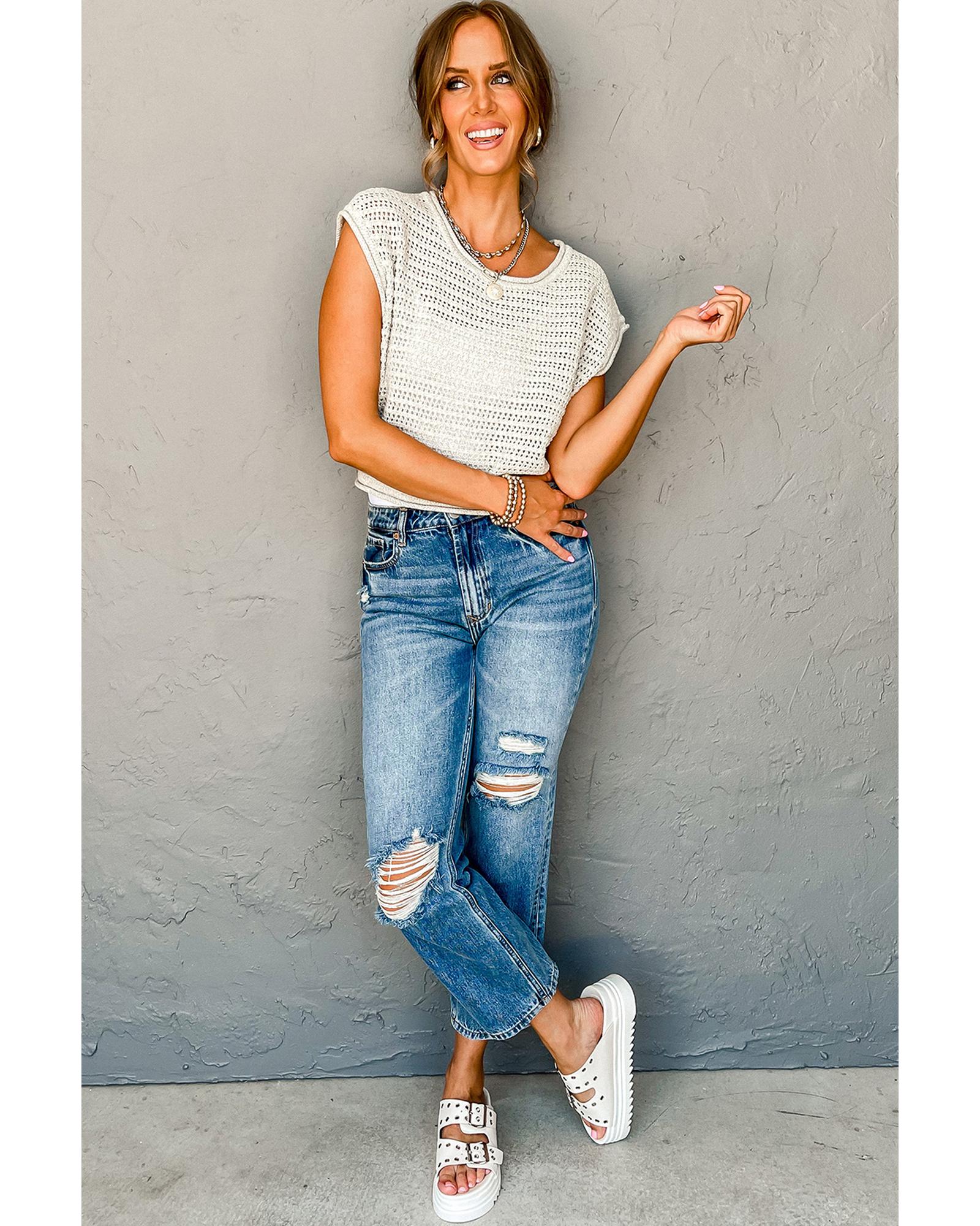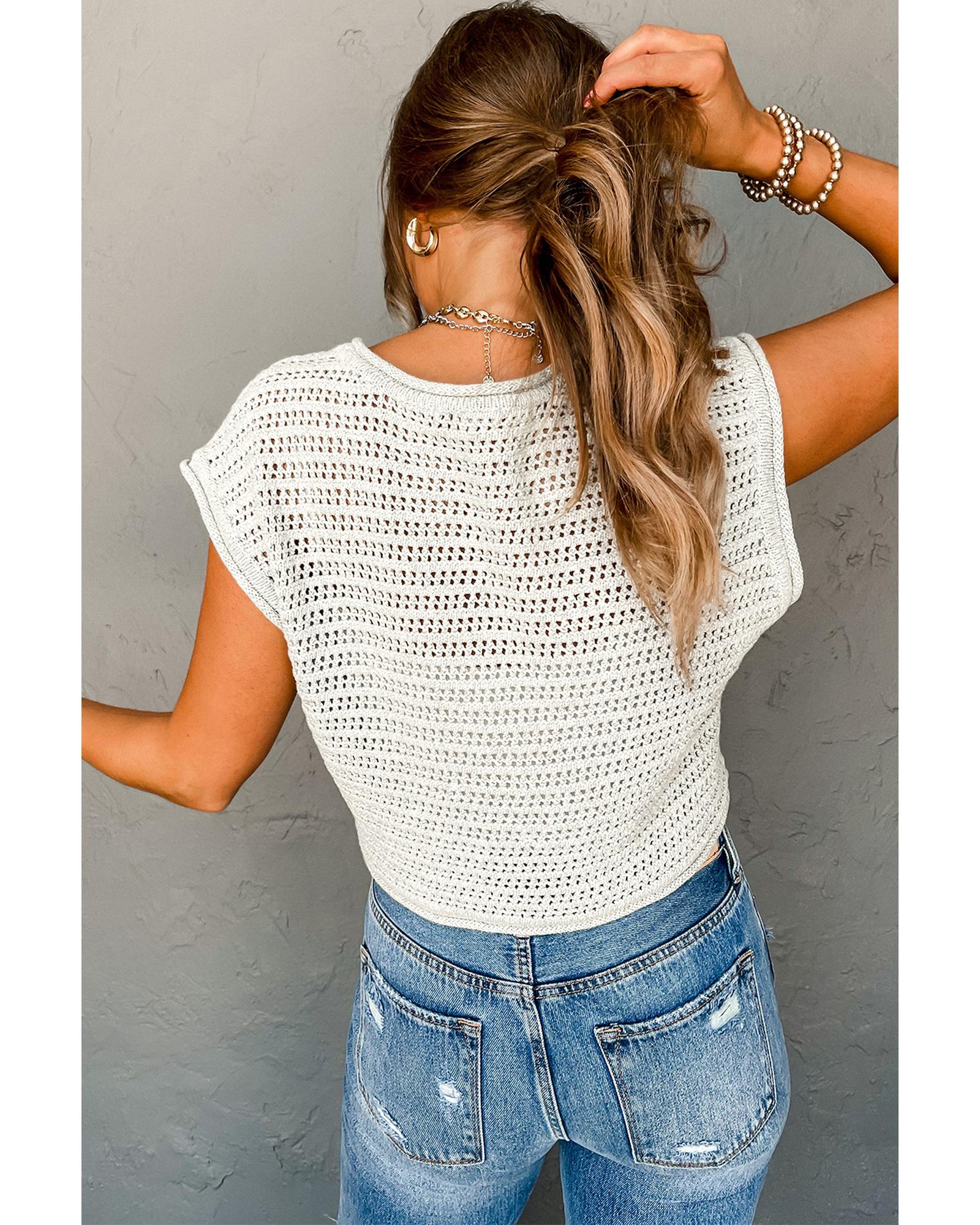 This stylish hollow out knit cap sleeve sweater offers a trendy and elegant look suitable for various occasions. Designed with a fitted silhouette, it combines comfort and fashion effortlessly. The white color and hollow out knit pattern add a touch of sophistication to your wardrobe.