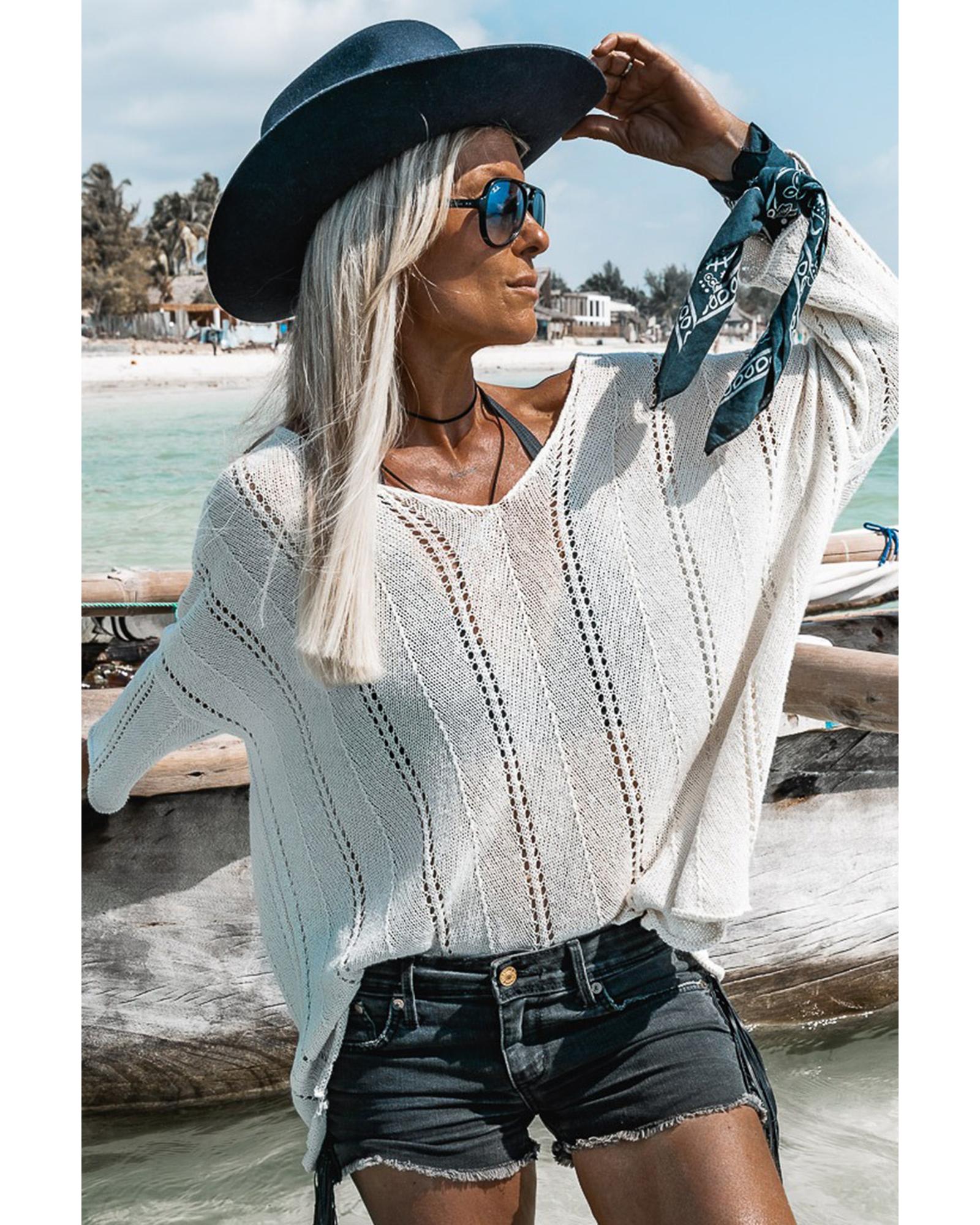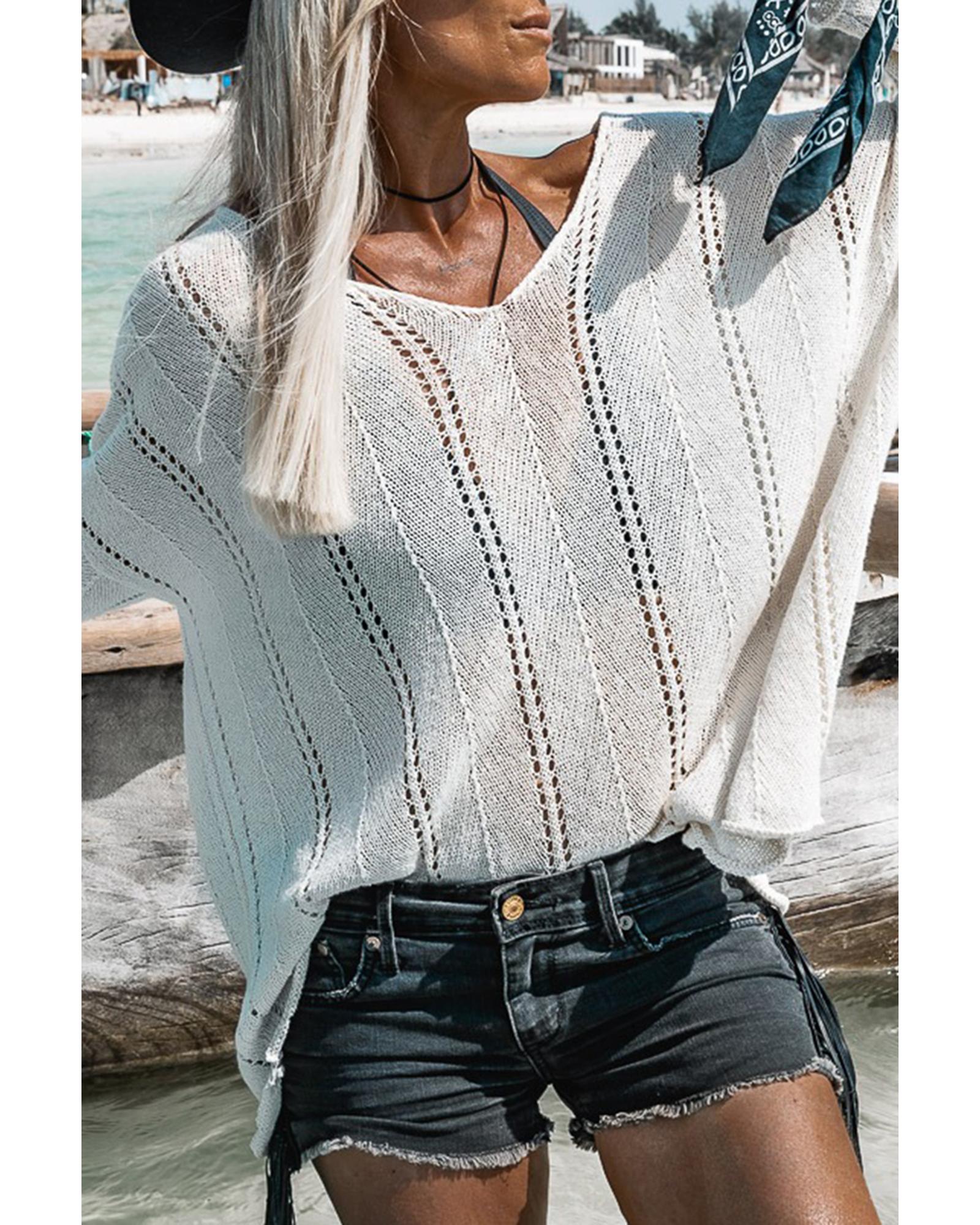 This white hollowed detail knitted sweater features a relaxed fit with a trendy design, making it suitable for casual and stylish wear. It is crafted from lightweight and breathable material, ensuring comfort throughout the day. The sweater has long dolman sleeves and a V-neckline, adding to its fashionable appeal.