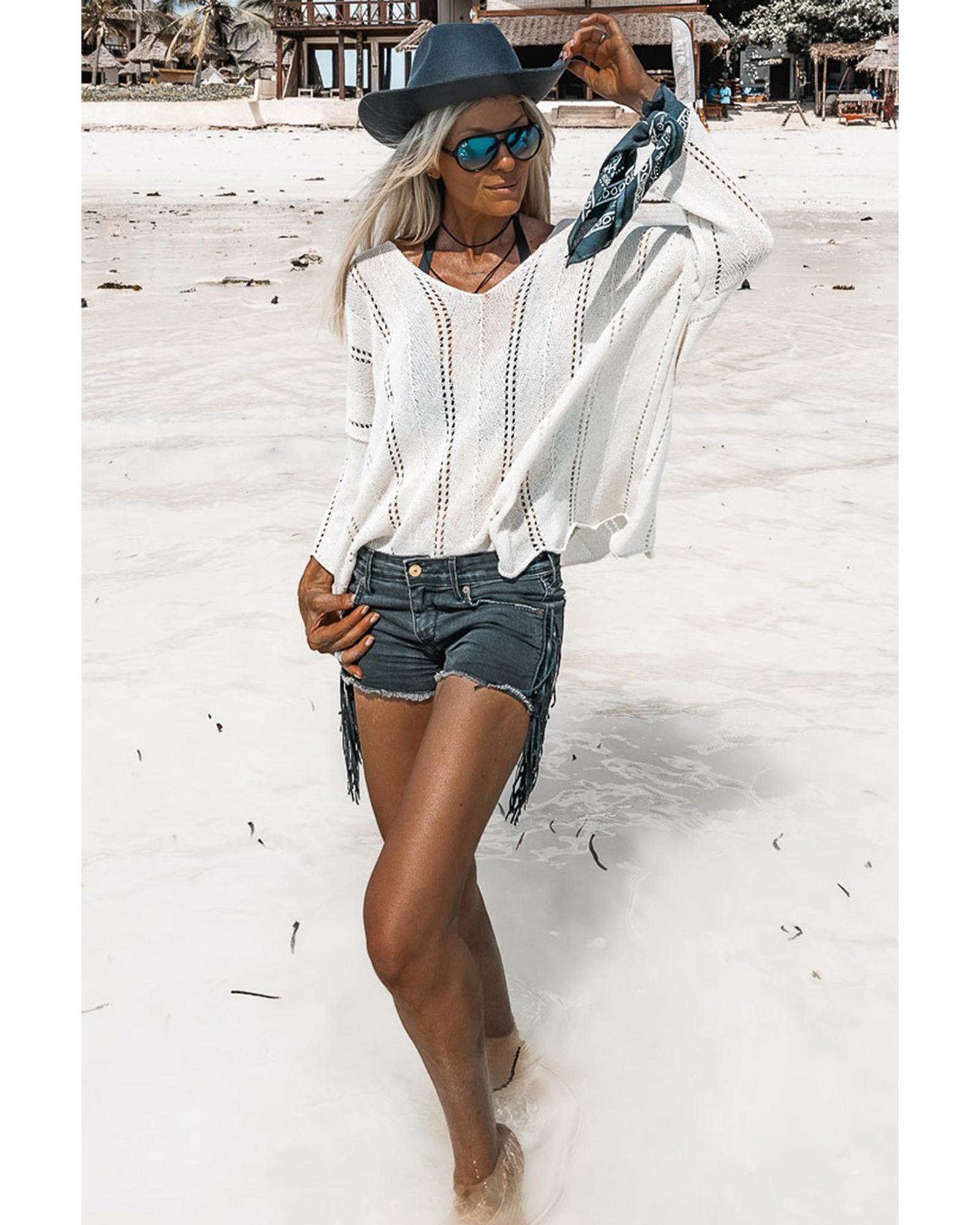 White Hollowed Detail Knitted Loose V Neck Sweater – S