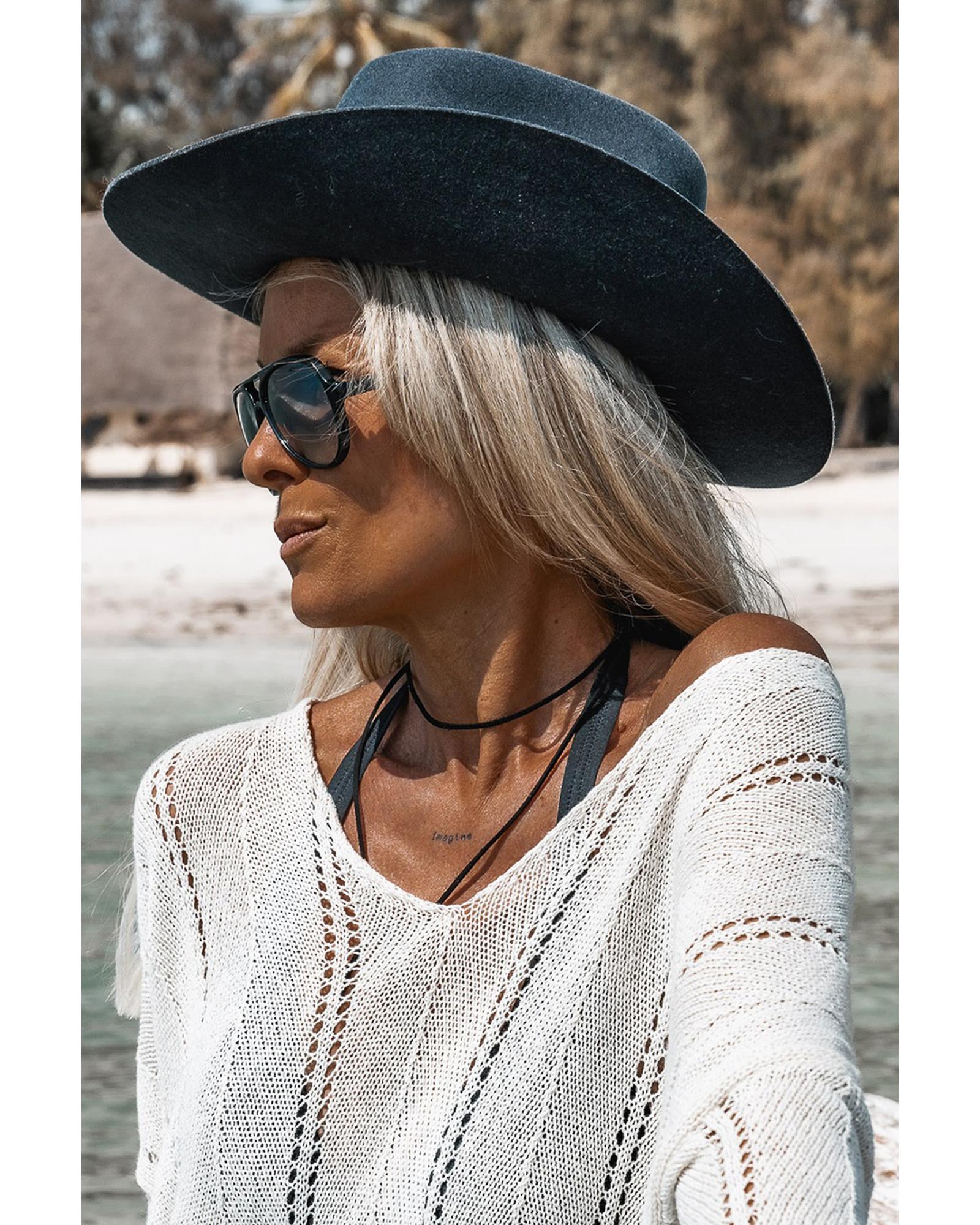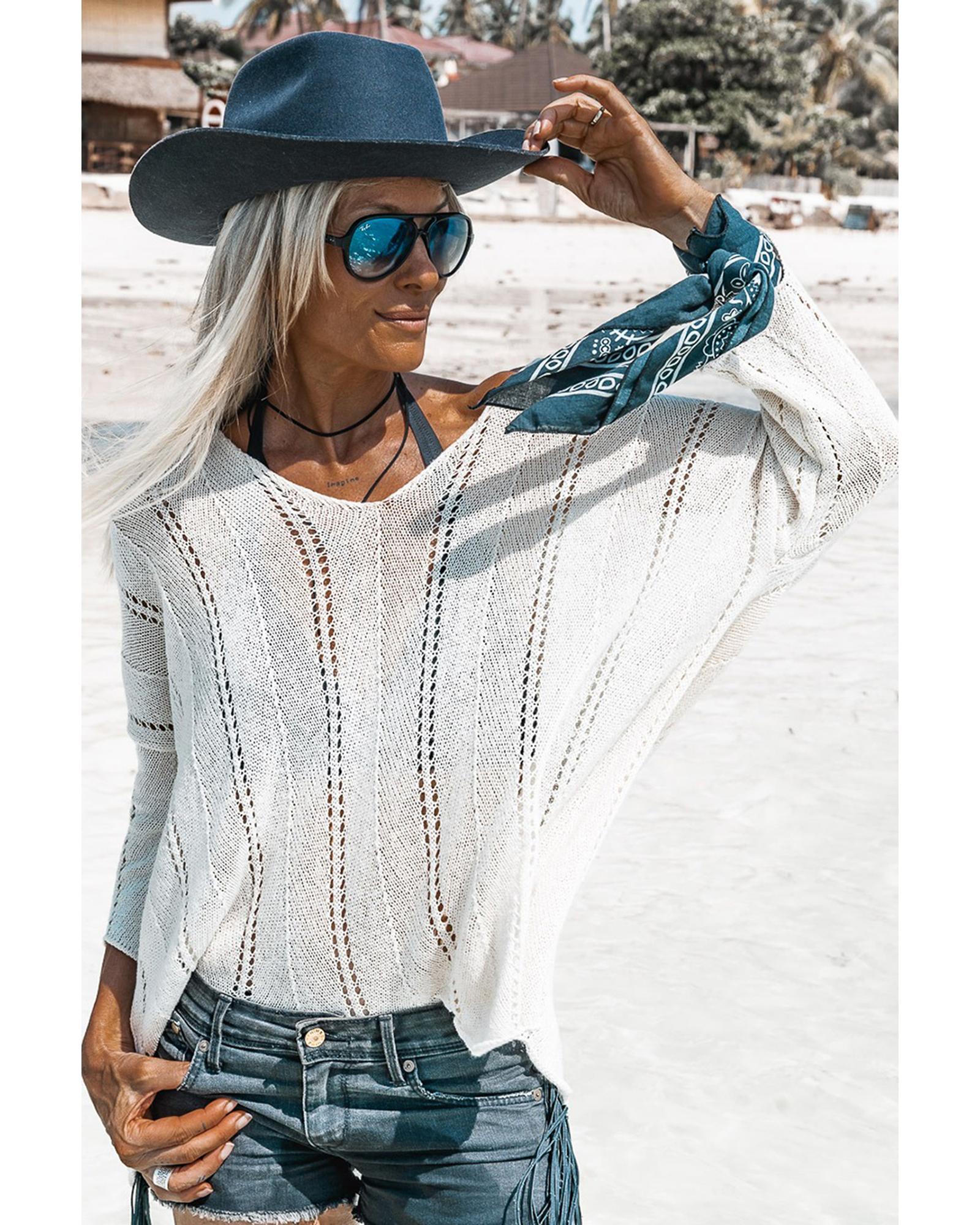 White Hollowed Detail Knitted Loose V Neck Sweater – XL