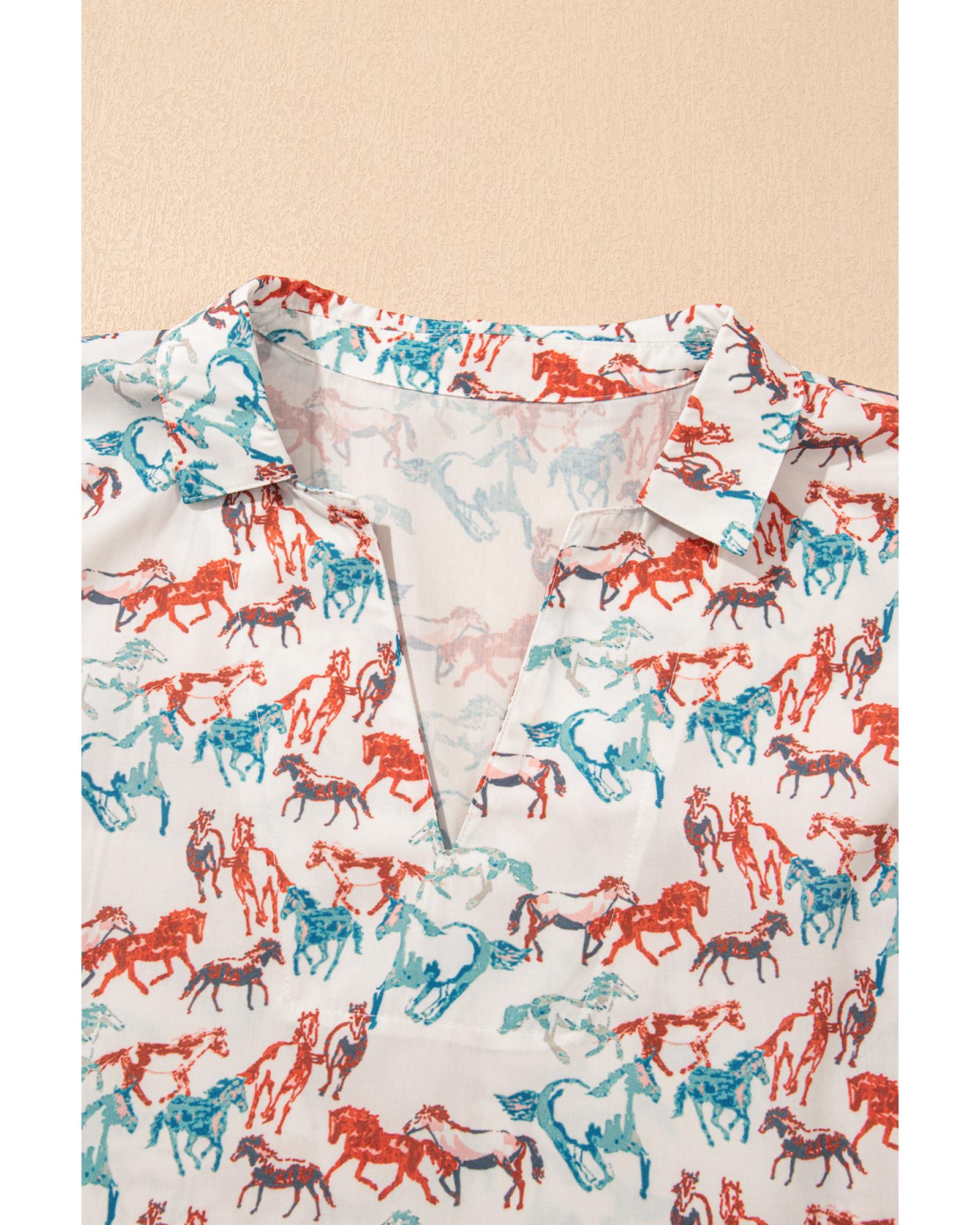 White Horse Galloping Allover Print Split Neck Plus Size Blouse – 1X