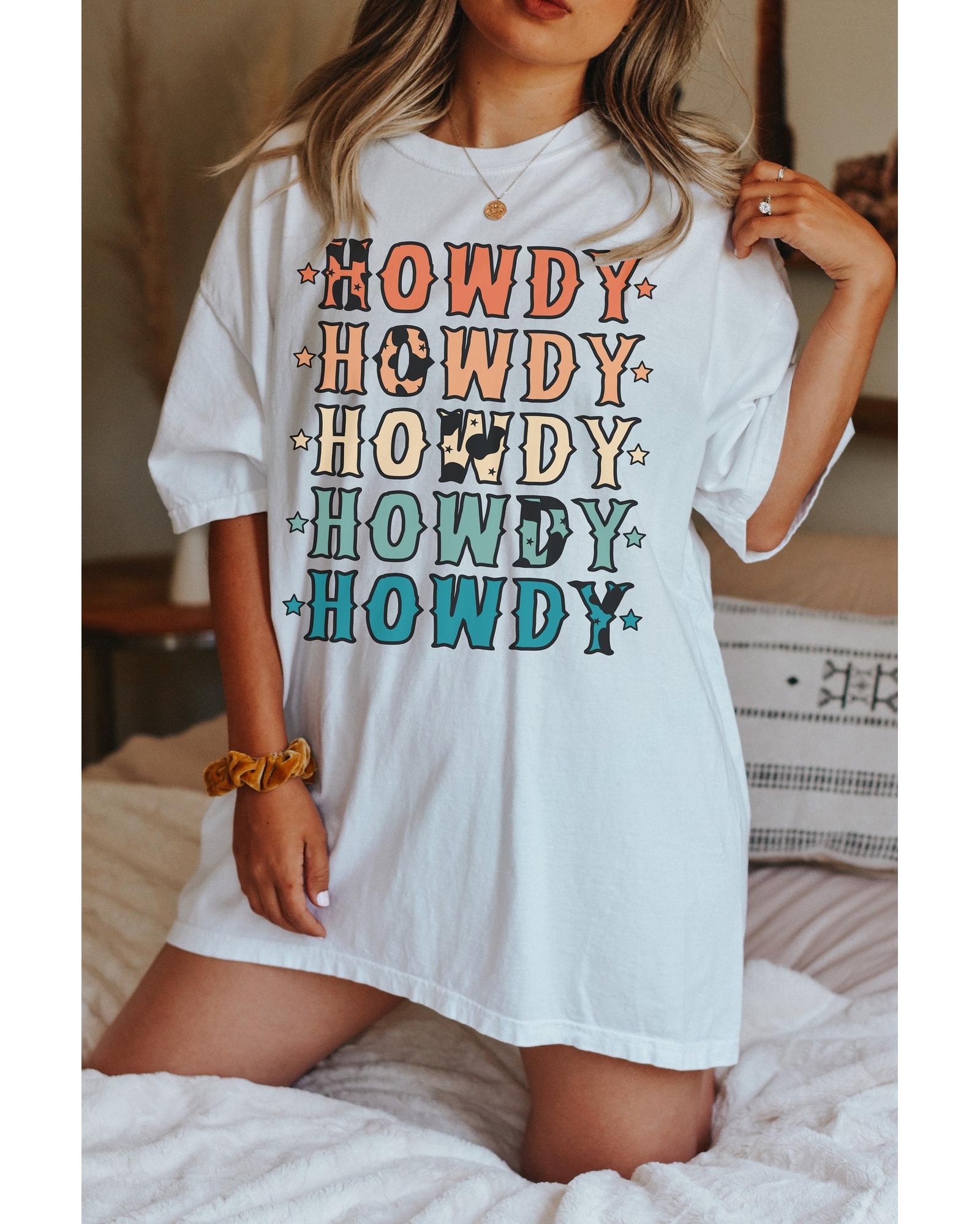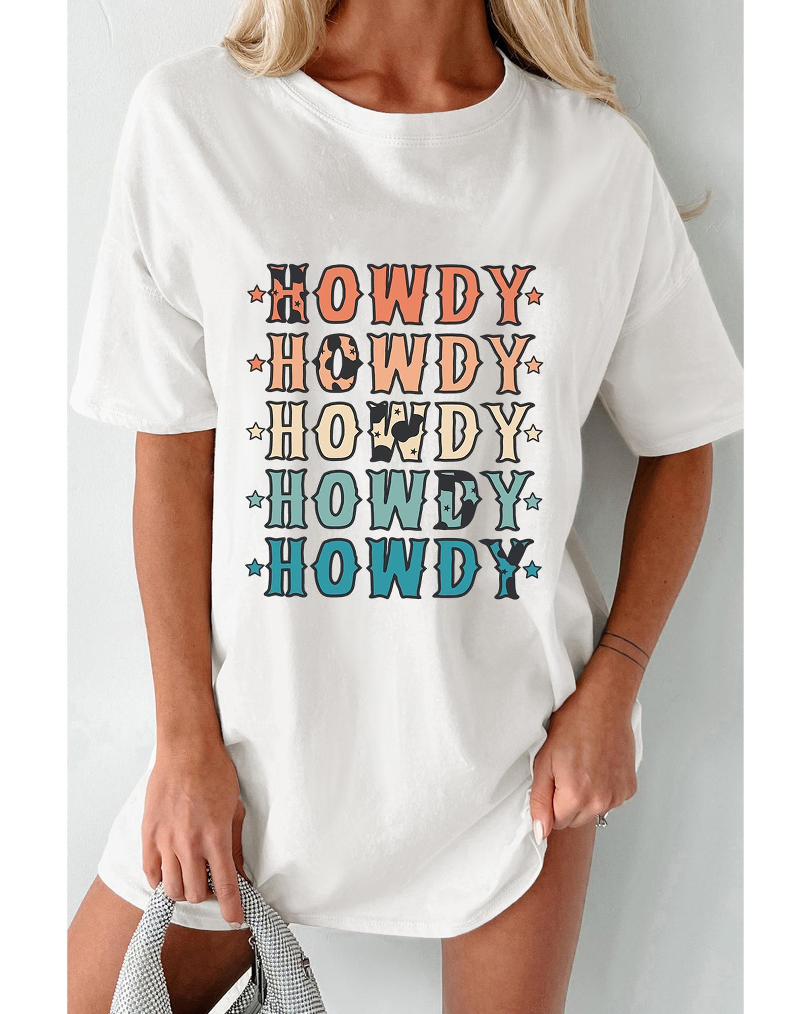 This T-shirt features a playful design with printed stars and a fun “HOWDY” graphic, offering a casual and stylish look. Its loose fit and round neckline make it comfortable for everyday wear, suitable for both casual and dressed-up occasions. Crafted from a soft cotton blend, it provides a comfortable wearing experience.