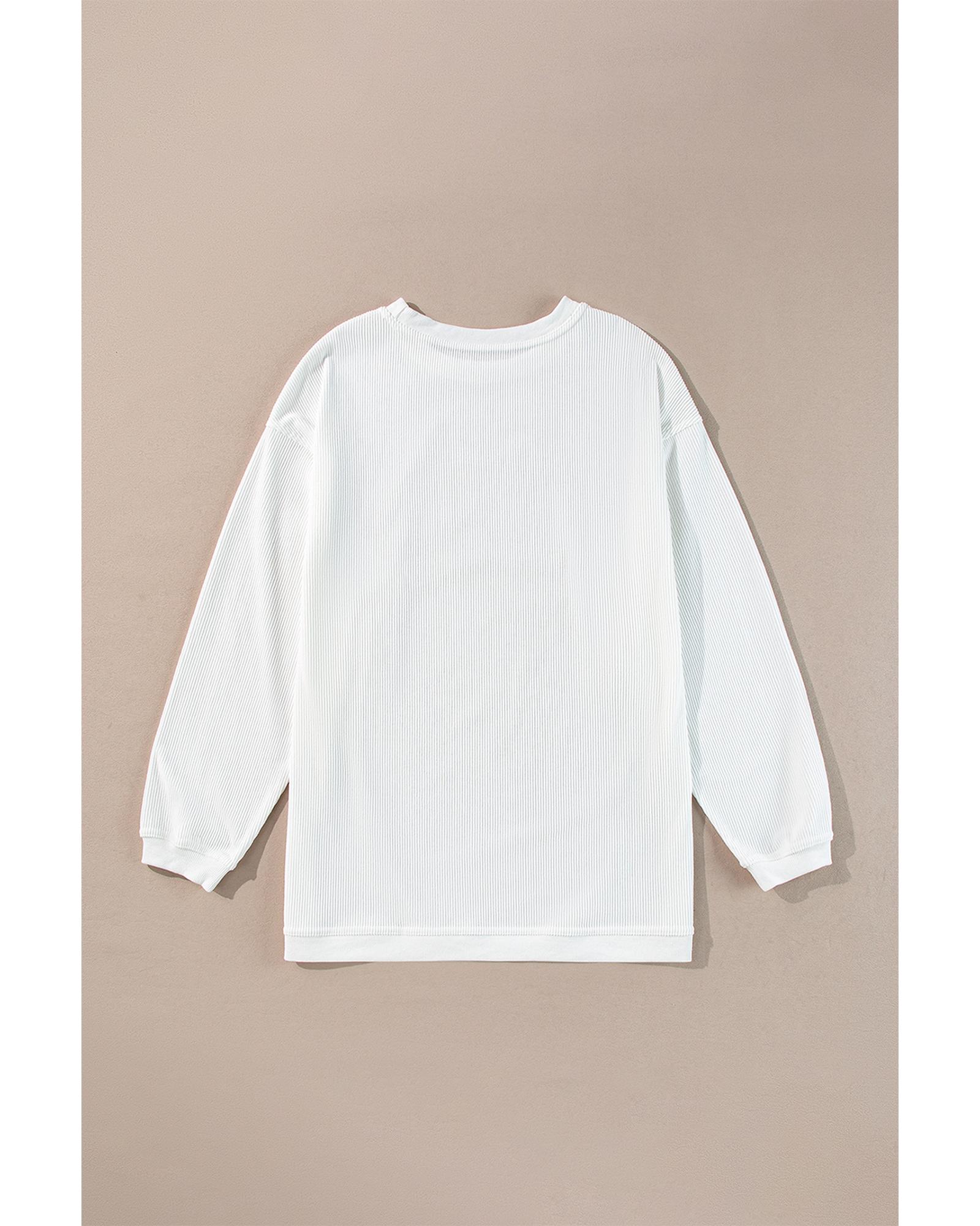 This ribbed crewneck pullover sweatshirt features a trendy, relaxed fit with a stylish design, making it suitable for casual wear during the holiday season. Crafted from quality fabric with a corded texture, it offers both comfort and a fashionable appearance.