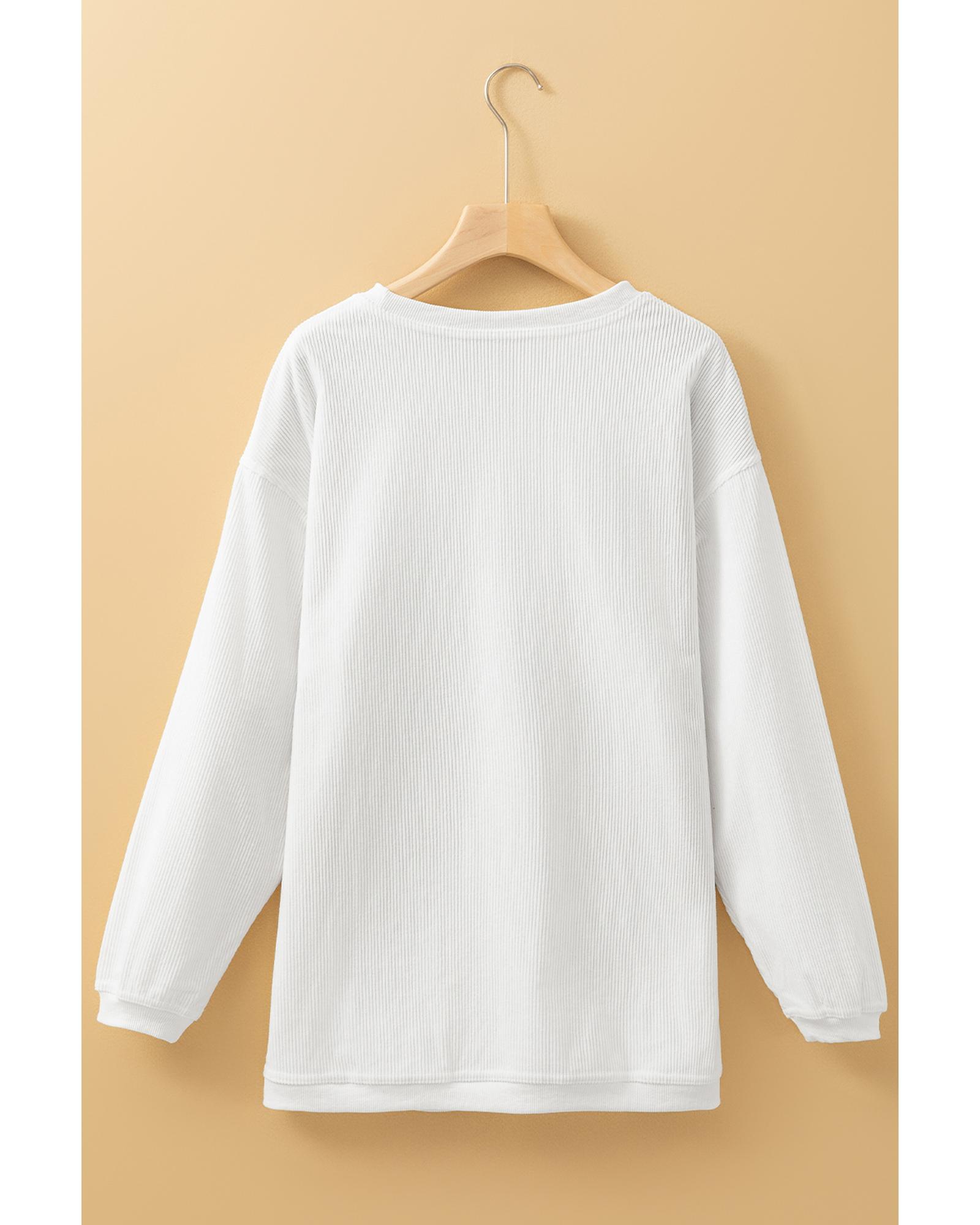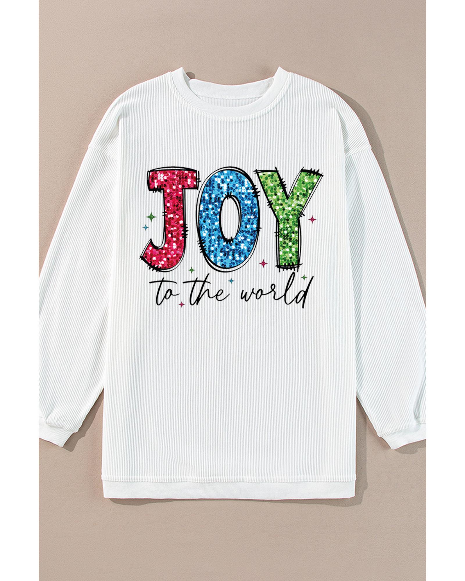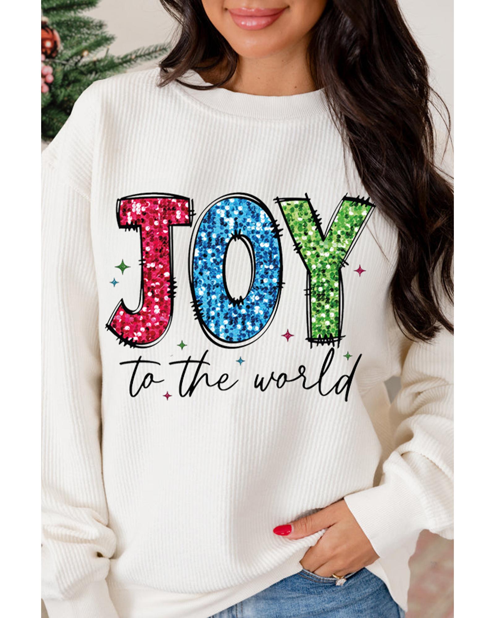 This ribbed crewneck pullover sweatshirt features a trendy, relaxed fit with a stylish corded texture. It is designed with a festive “JOY to the World” Christmas wish pattern, making it suitable for holiday celebrations. The sweatshirt offers comfort and a fashionable look, perfect for casual wear during the holiday season.