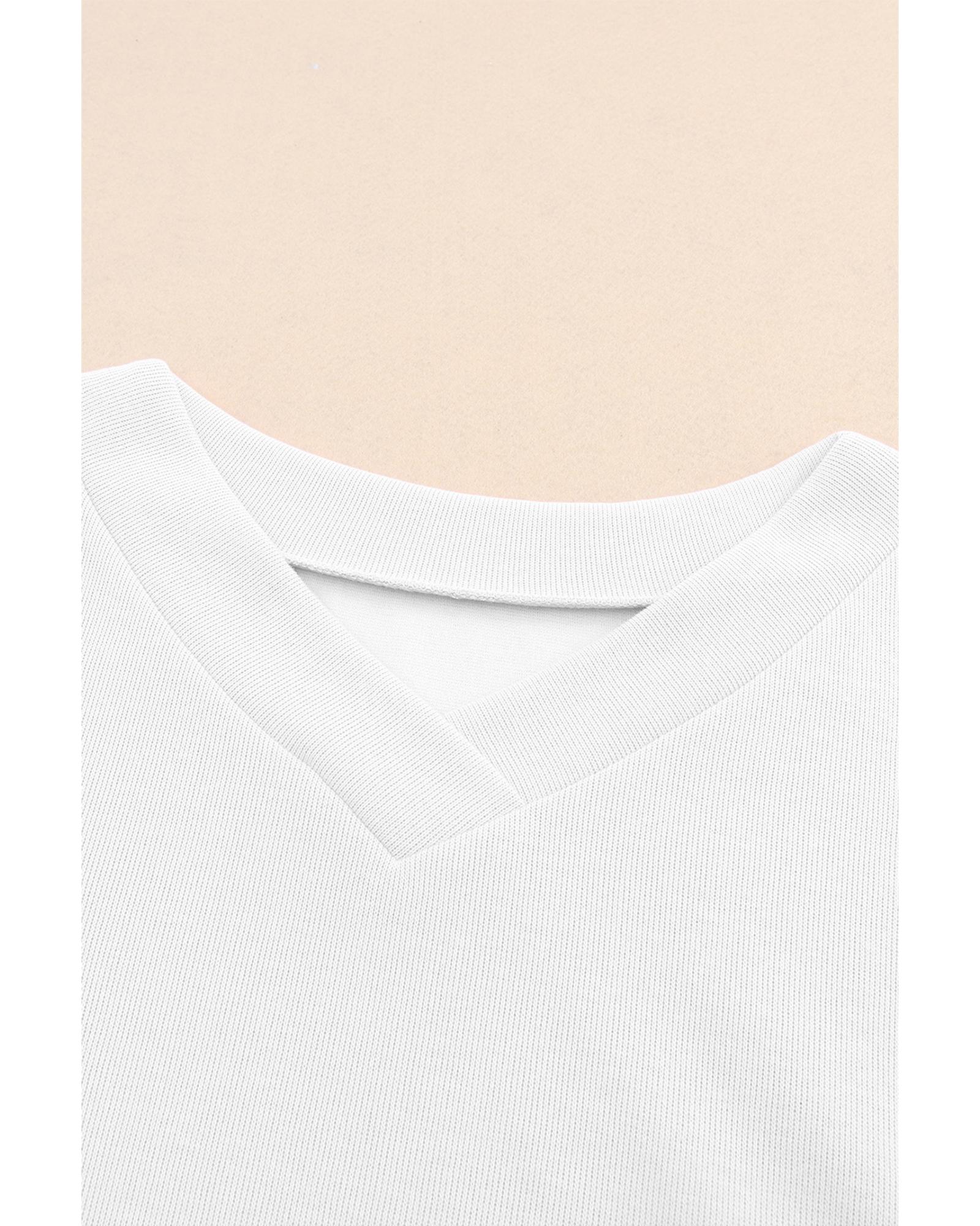 This white knitted sweater features a V-neck design with buttoned cuffs, offering a stylish and comfortable option for everyday wear. Its classic solid color makes it versatile for various outfits, providing both warmth and elegance.
