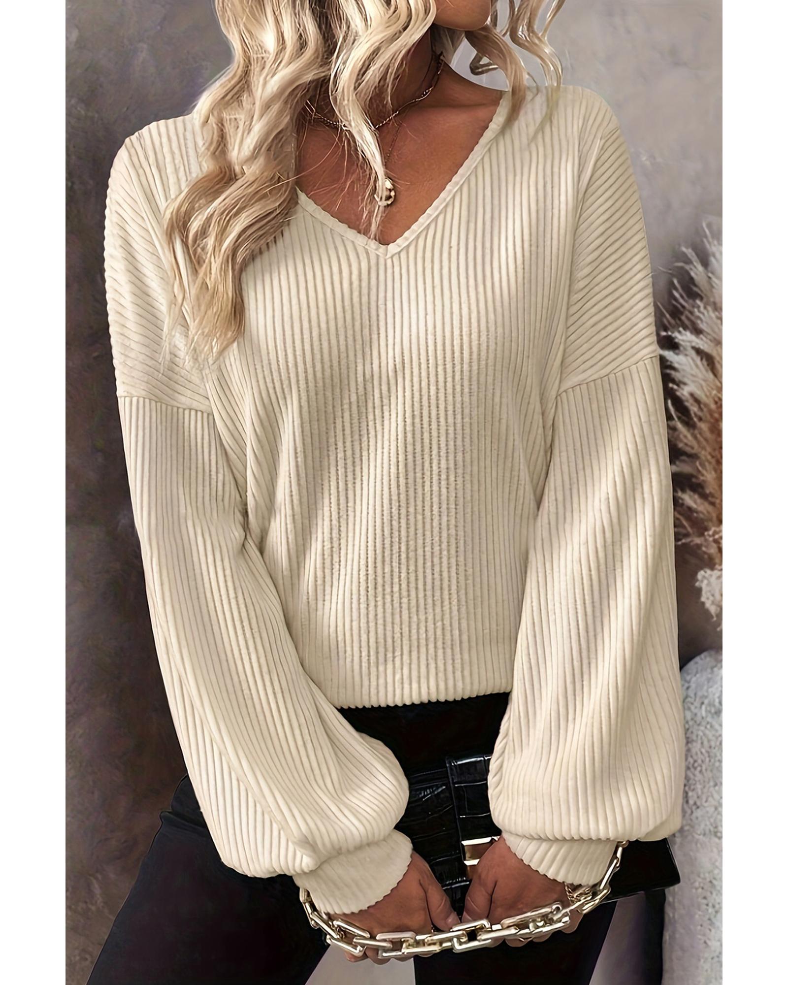 This long sleeve blouse features a ribbed fabric with a stylish knotted back detail. Its dropped shoulder design and loose pullover style make it versatile for both casual and formal occasions. Available in multiple sizes to ensure a comfortable fit.
