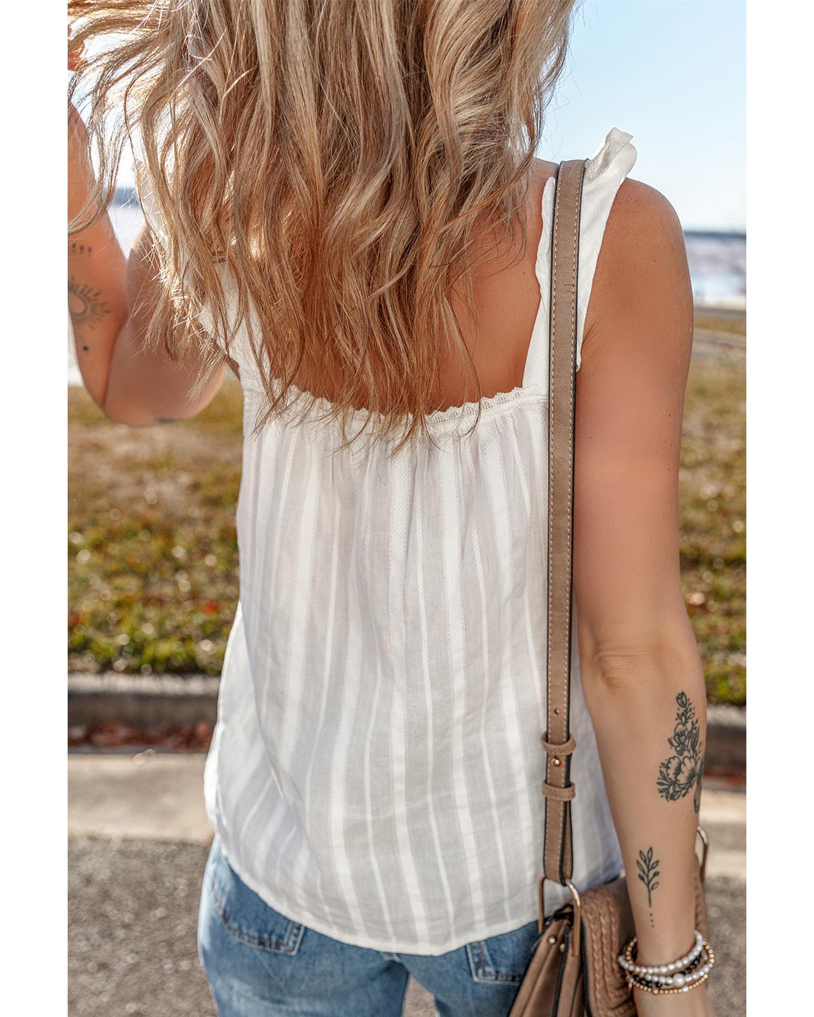 This sleeveless tank top features a delicate lace crochet design combined with ruffled accents, offering a stylish and breathable option for warm weather. Its relaxed fit ensures comfort for everyday wear, while the buttoned front adds a touch of detail to the overall look.