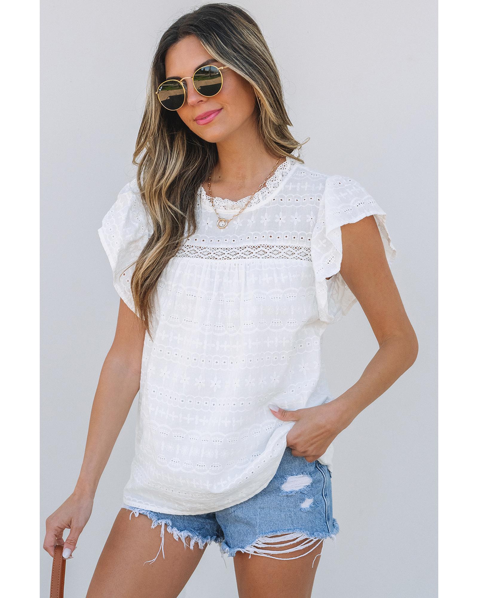 White Lace Neckline Flutter Sleeve Eyelets Blouse – M