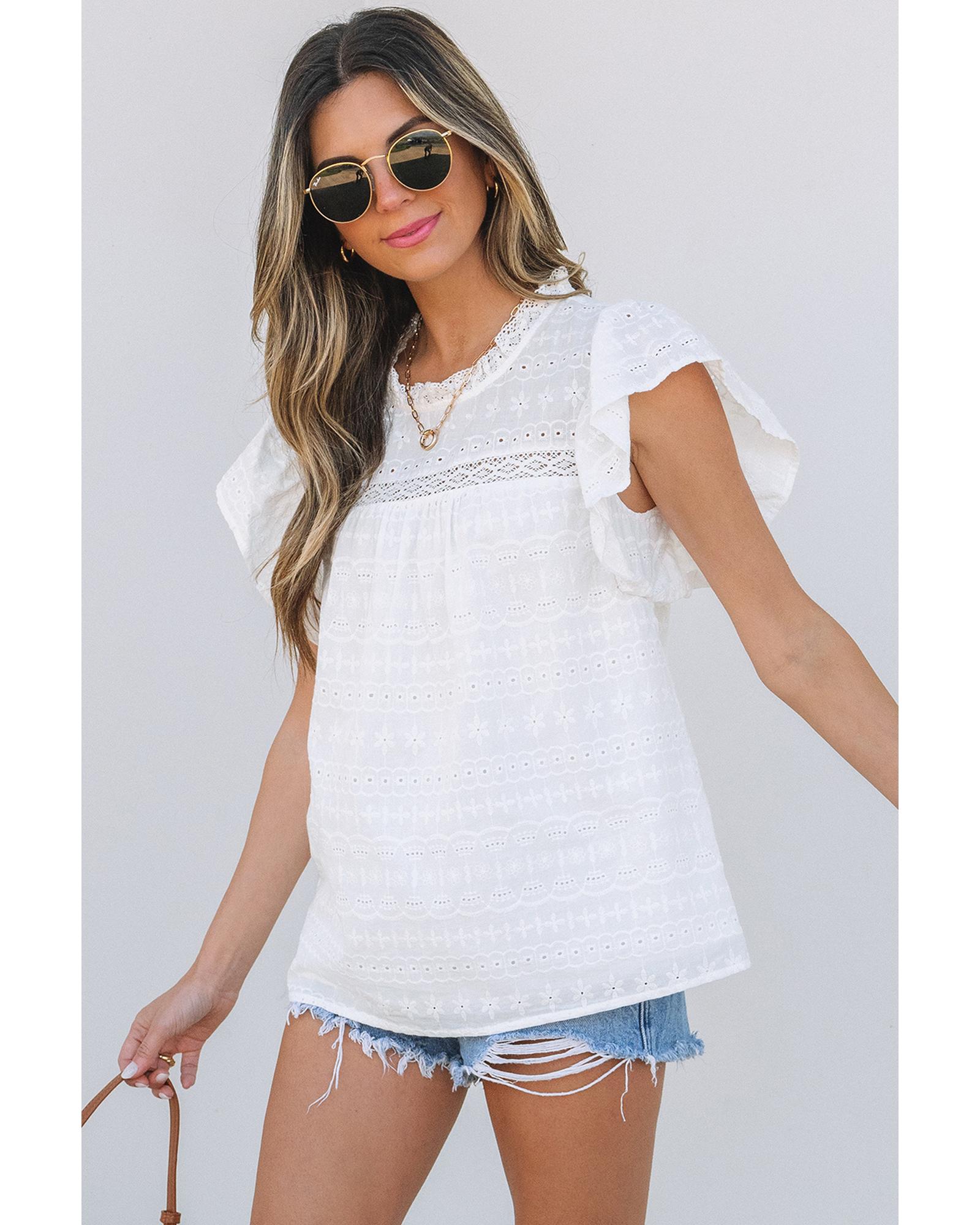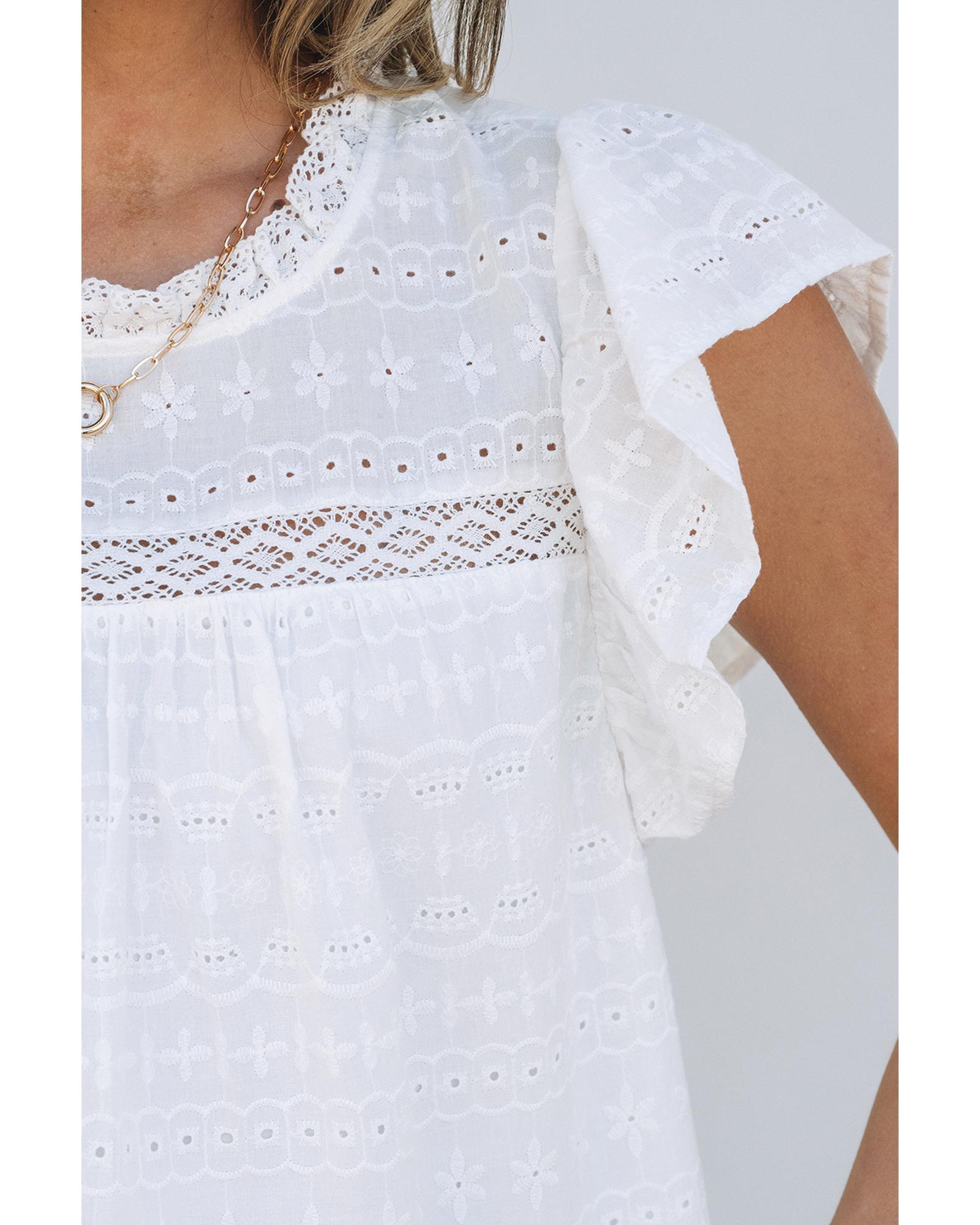 This blouse features a delicate lace neckline combined with flutter sleeves and intricate eyelet details, offering a stylish and feminine look. Its classic solid color makes it versatile for various outfits and occasions. Designed for a comfortable fit, it is available in multiple sizes to suit different preferences.