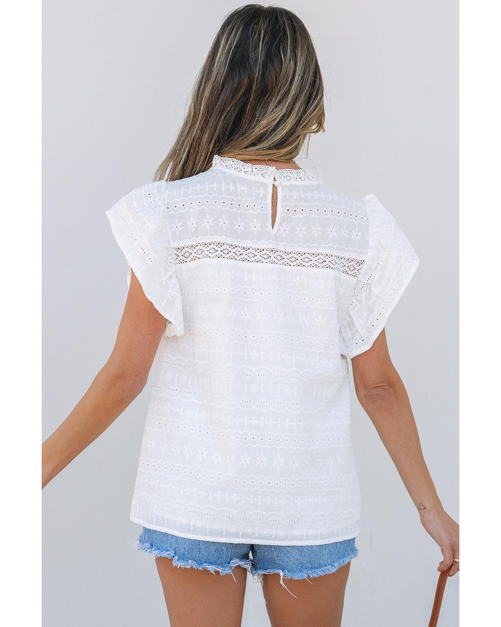 White Lace Neckline Flutter Sleeve Eyelets Blouse – XL