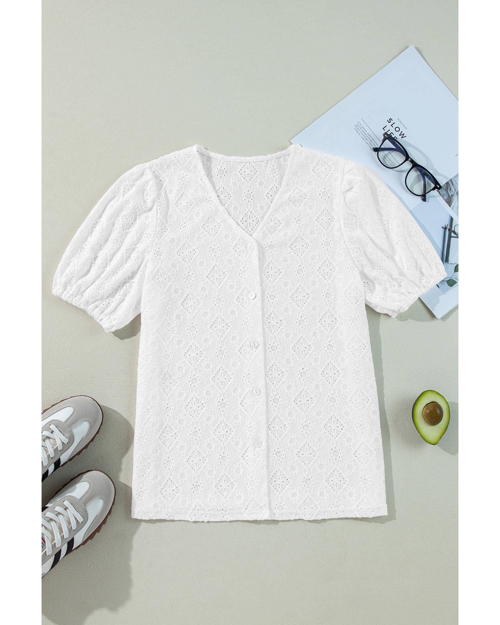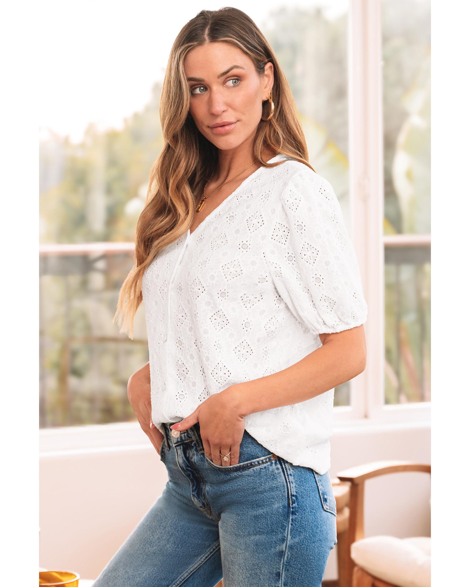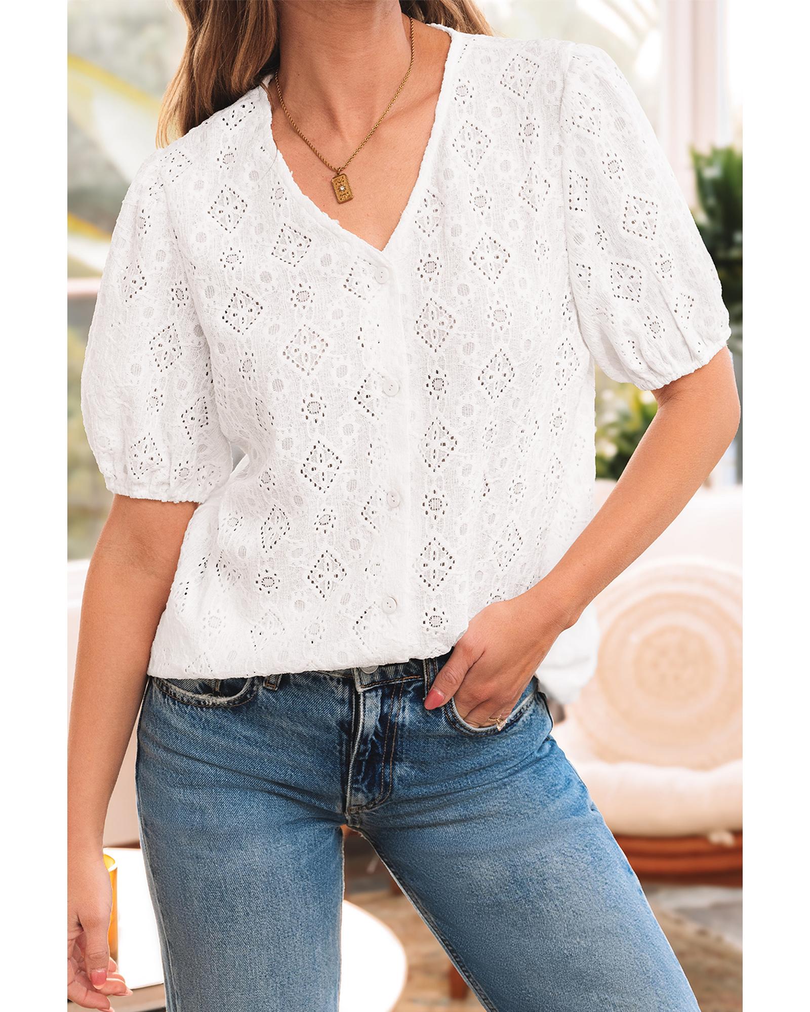This elegant white lace puff sleeve V neck button-up shirt offers a versatile and stylish addition to your wardrobe. Designed with delicate eyelet lace and short puff sleeves, it combines a classic look with modern details suitable for various occasions from work to casual outings.