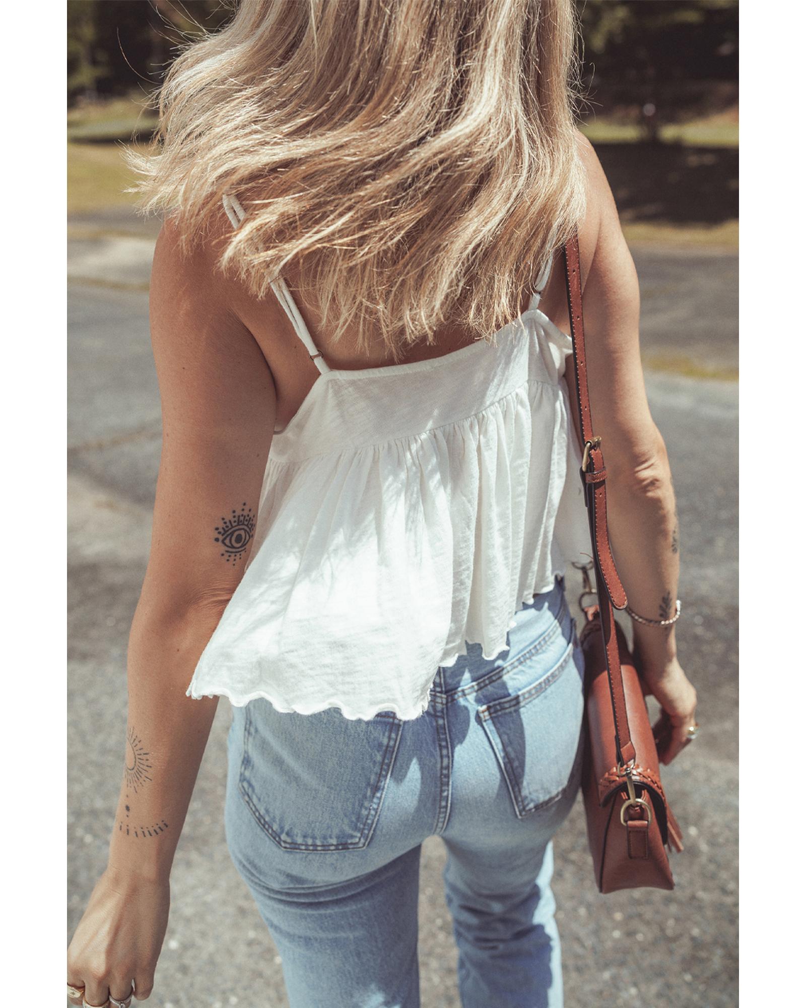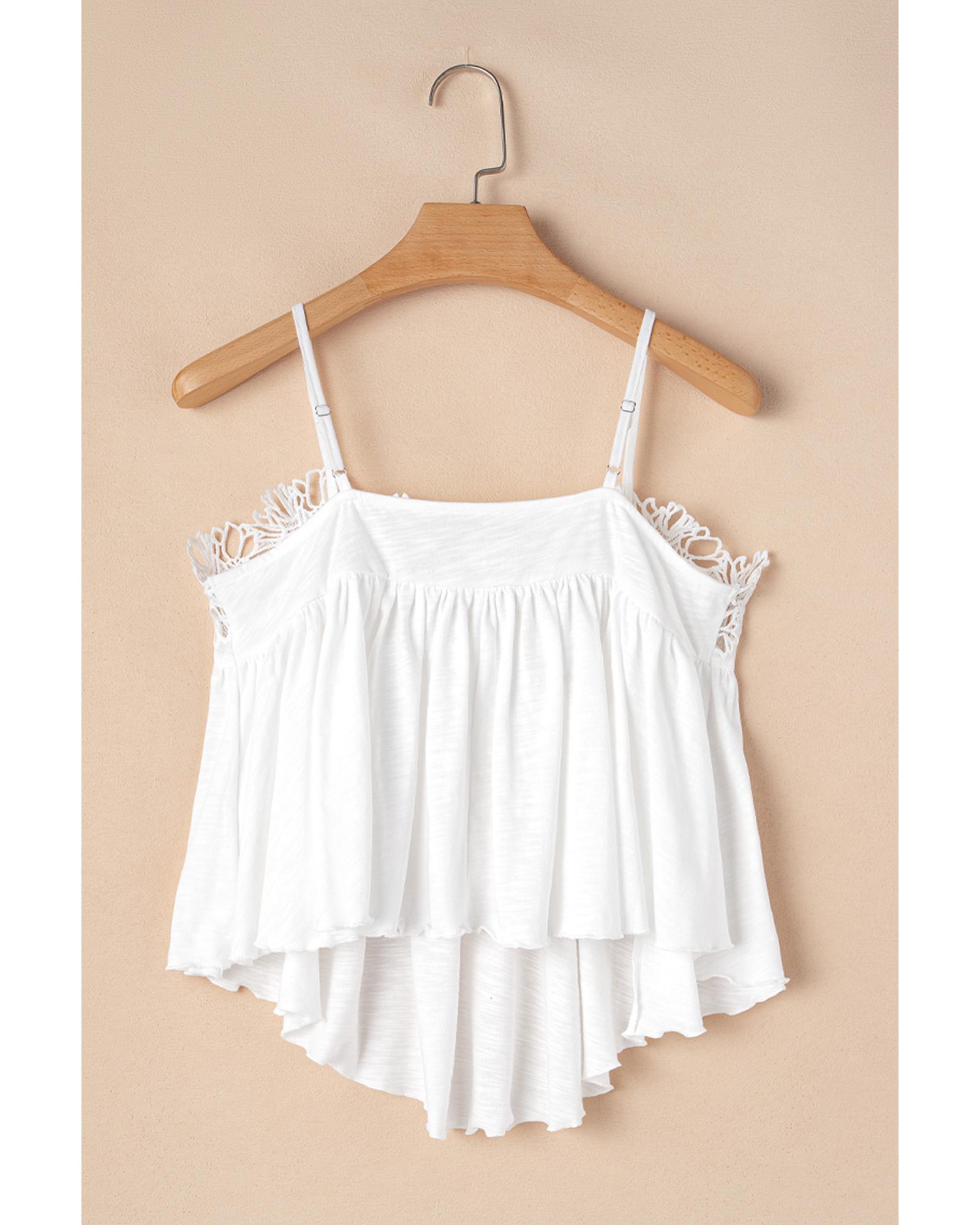White Lace Splicing Spaghetti Straps Ruffle Flared Tank Top – L